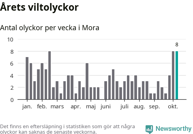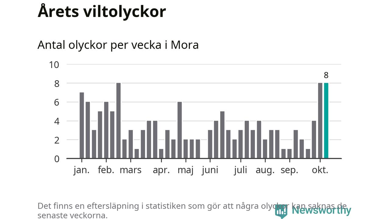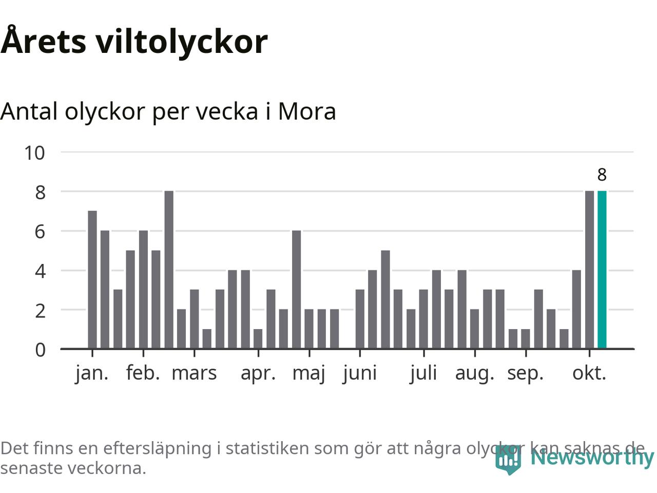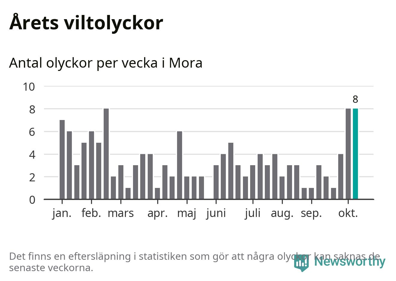 Hittills har åtta viltolyckor rapporterats in i Mora kommun från vecka 42. Se listan här.