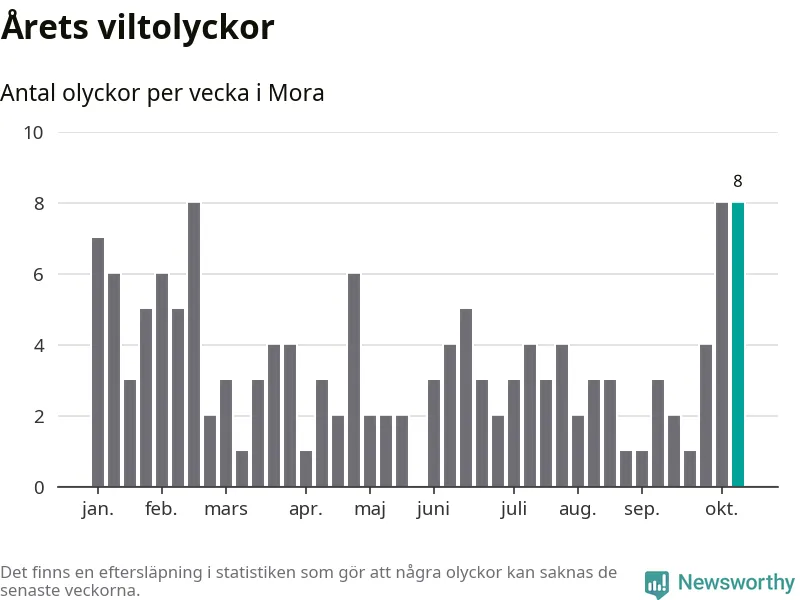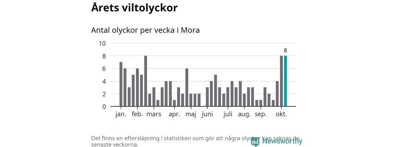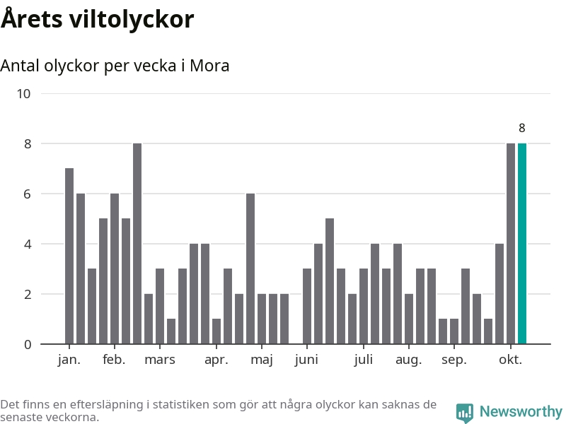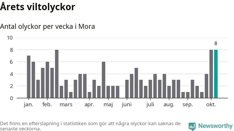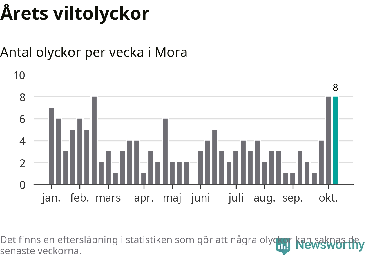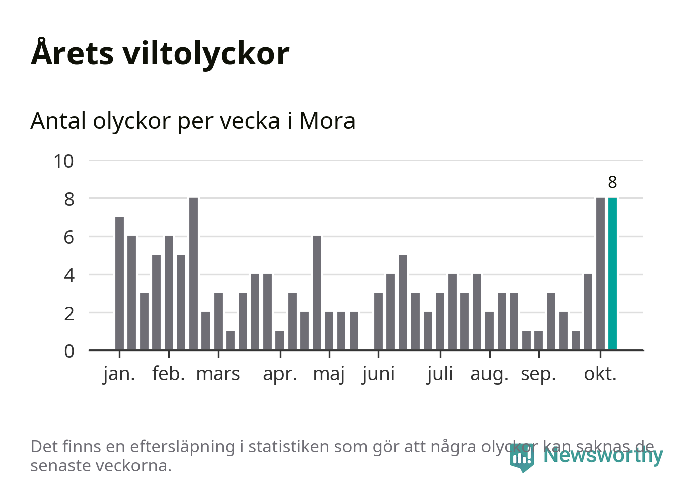 Hittills har åtta viltolyckor rapporterats in i Mora kommun från vecka 42. Se listan här.