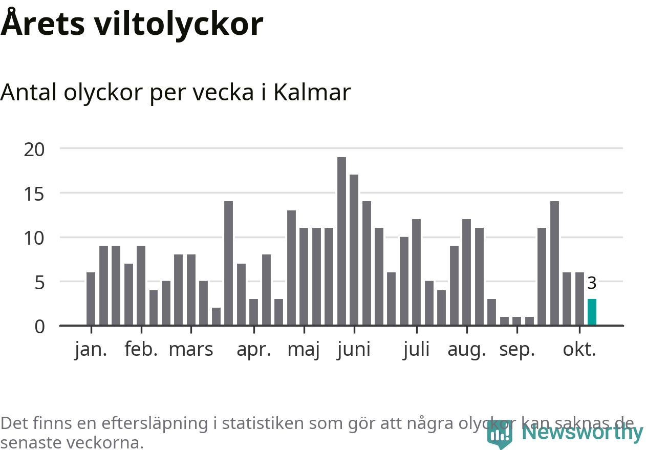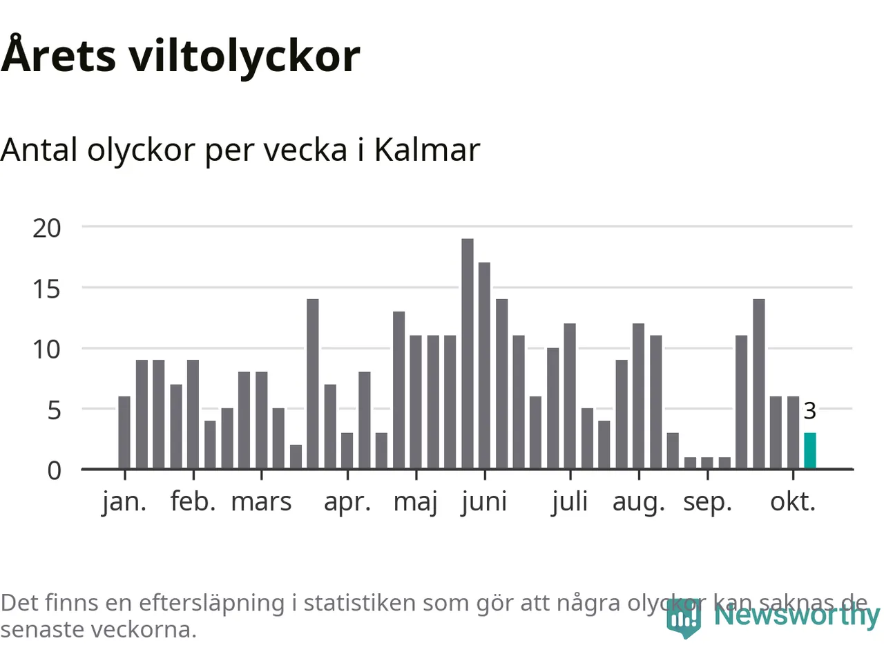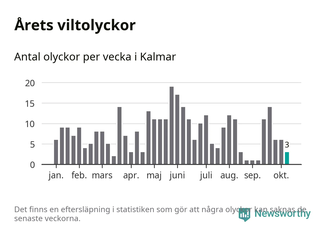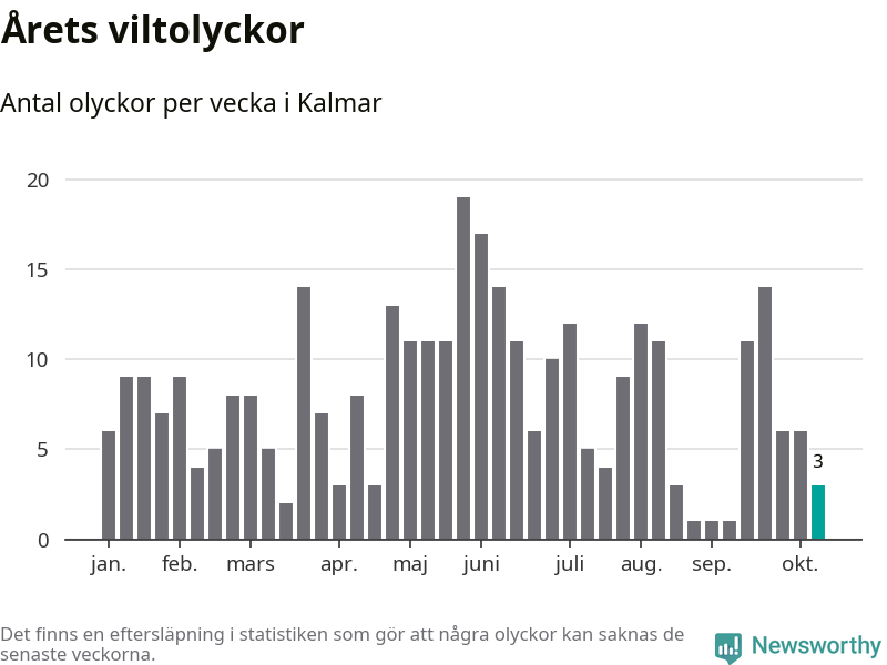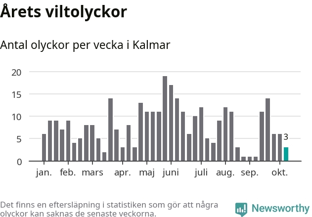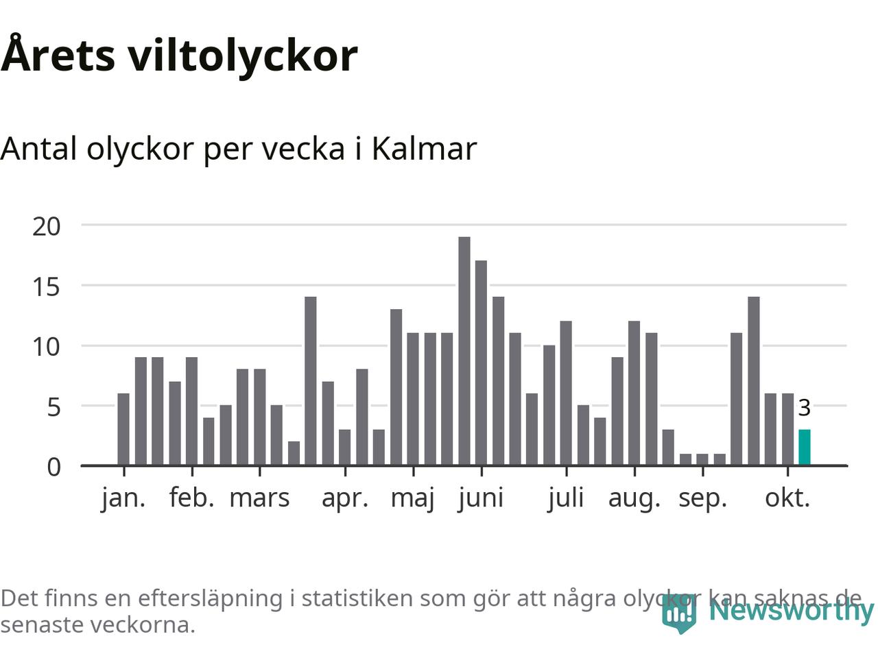 Hittills har tre viltolyckor rapporterats in i Kalmar kommun från vecka 42. Se listan här.