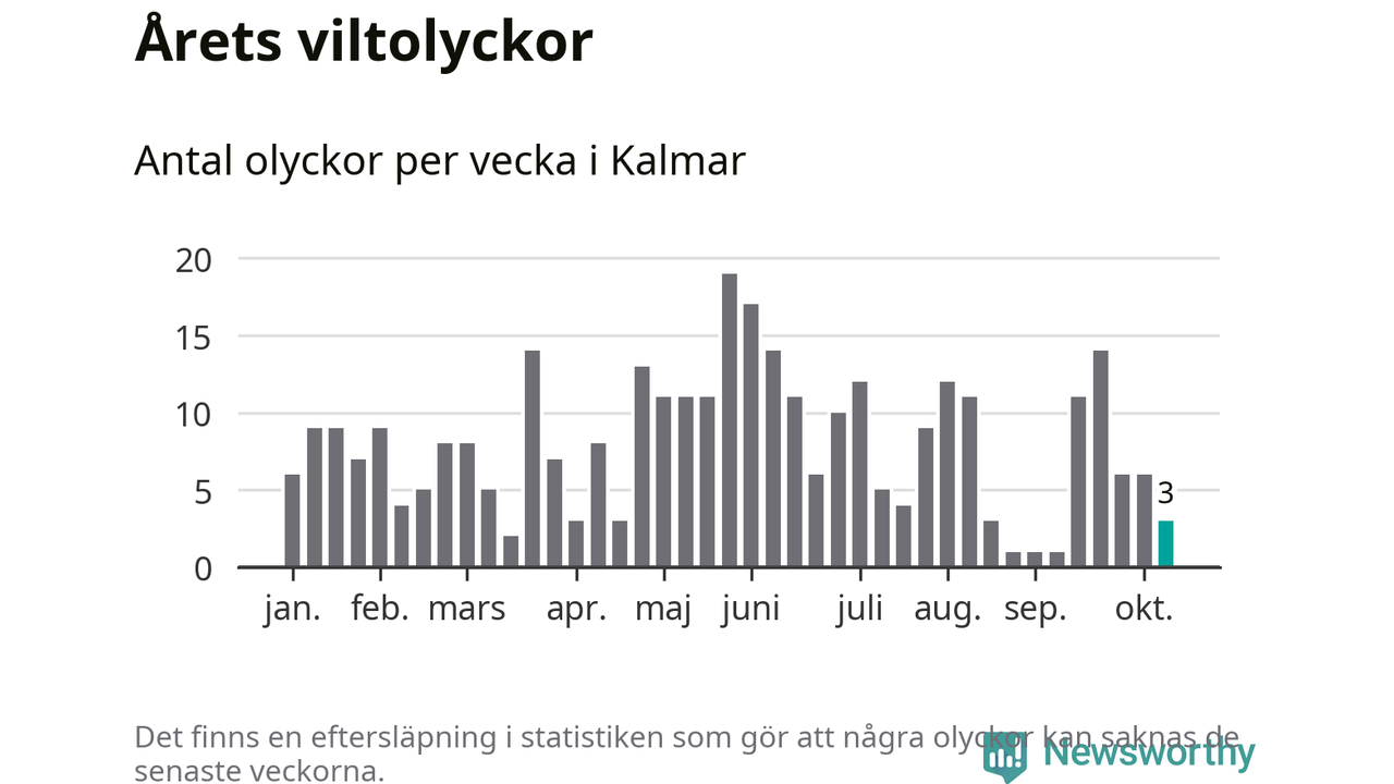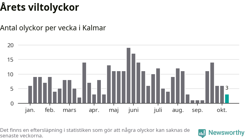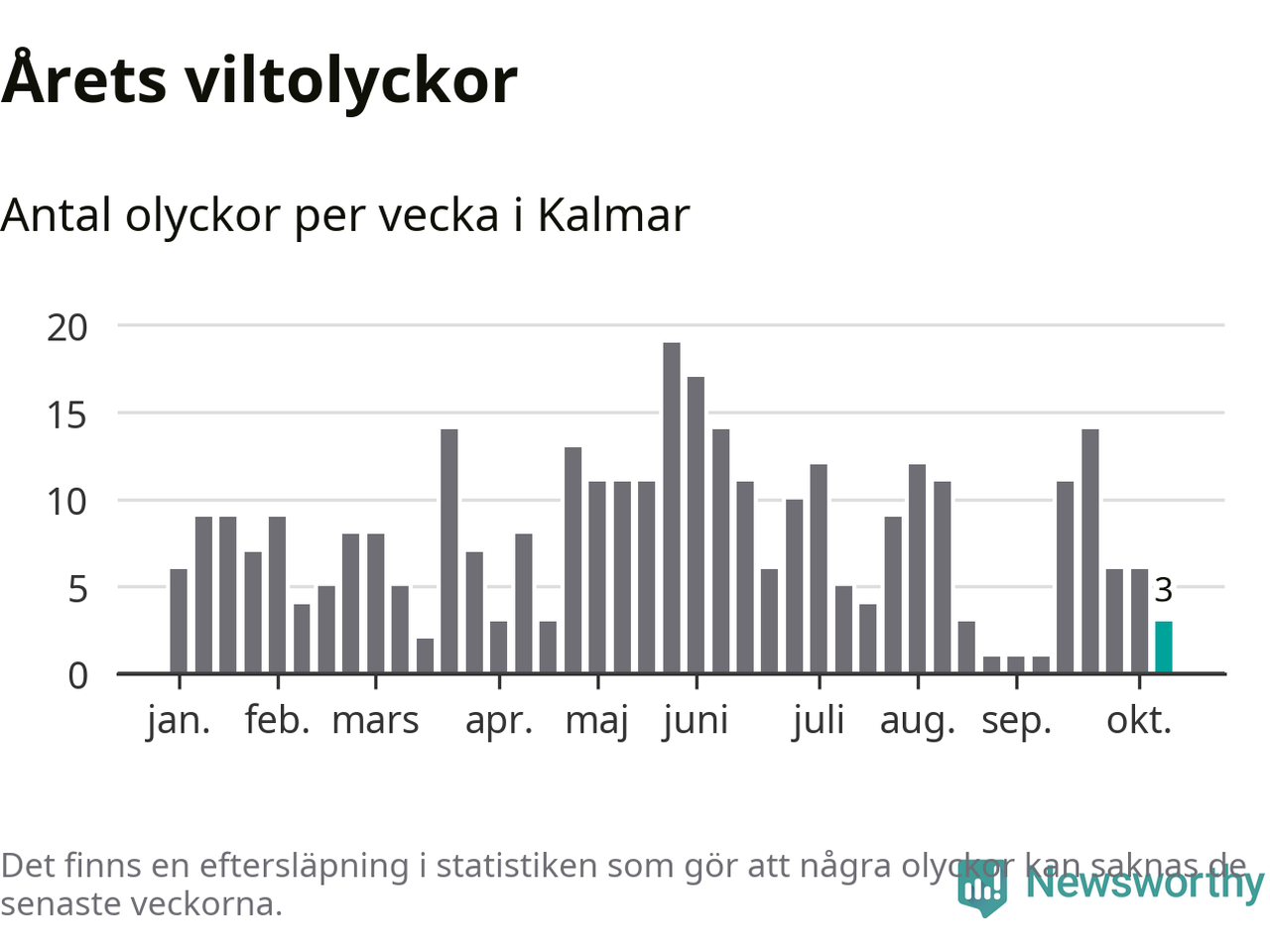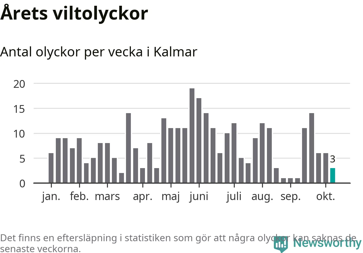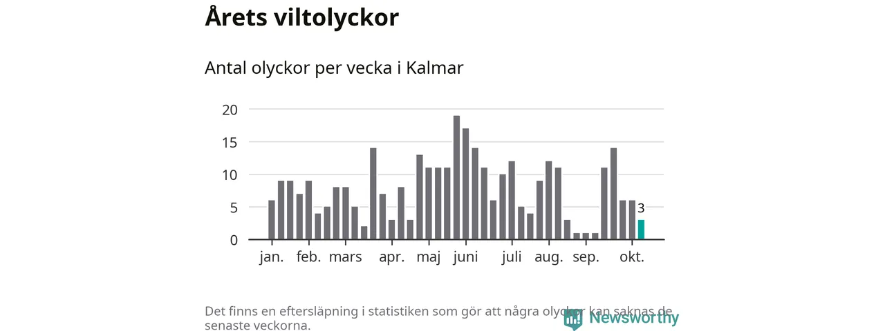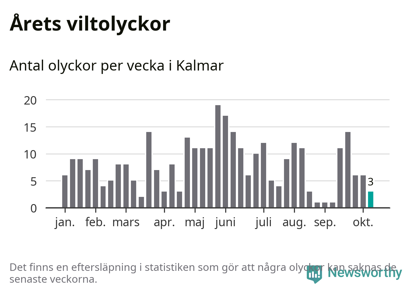 Hittills har tre viltolyckor rapporterats in i Kalmar kommun från vecka 42. Se listan här.