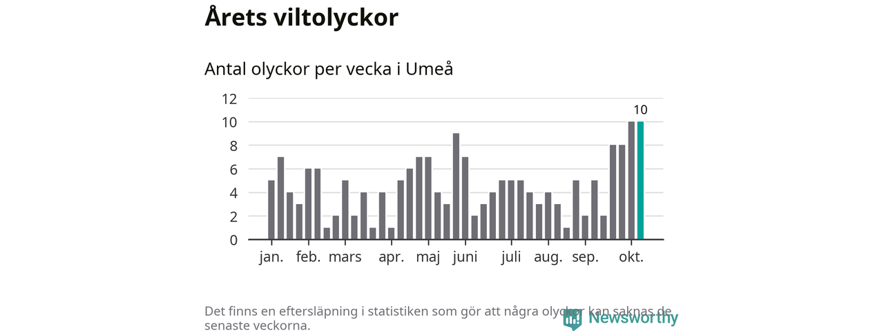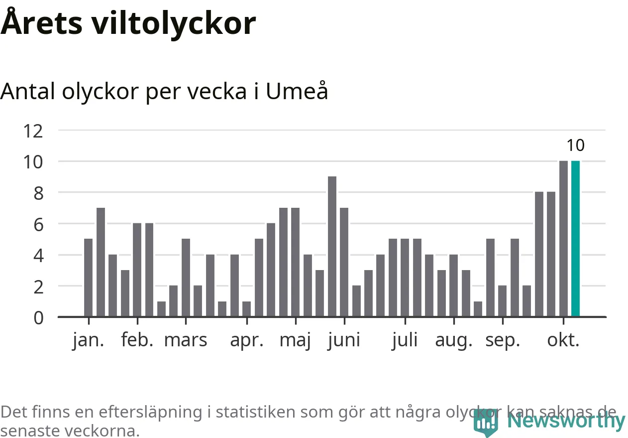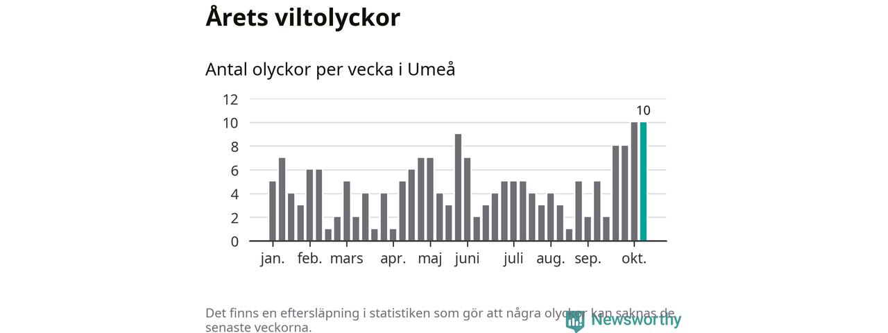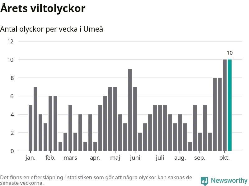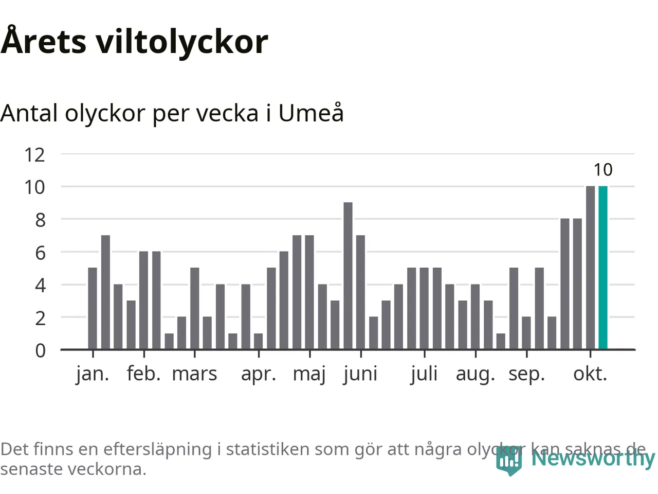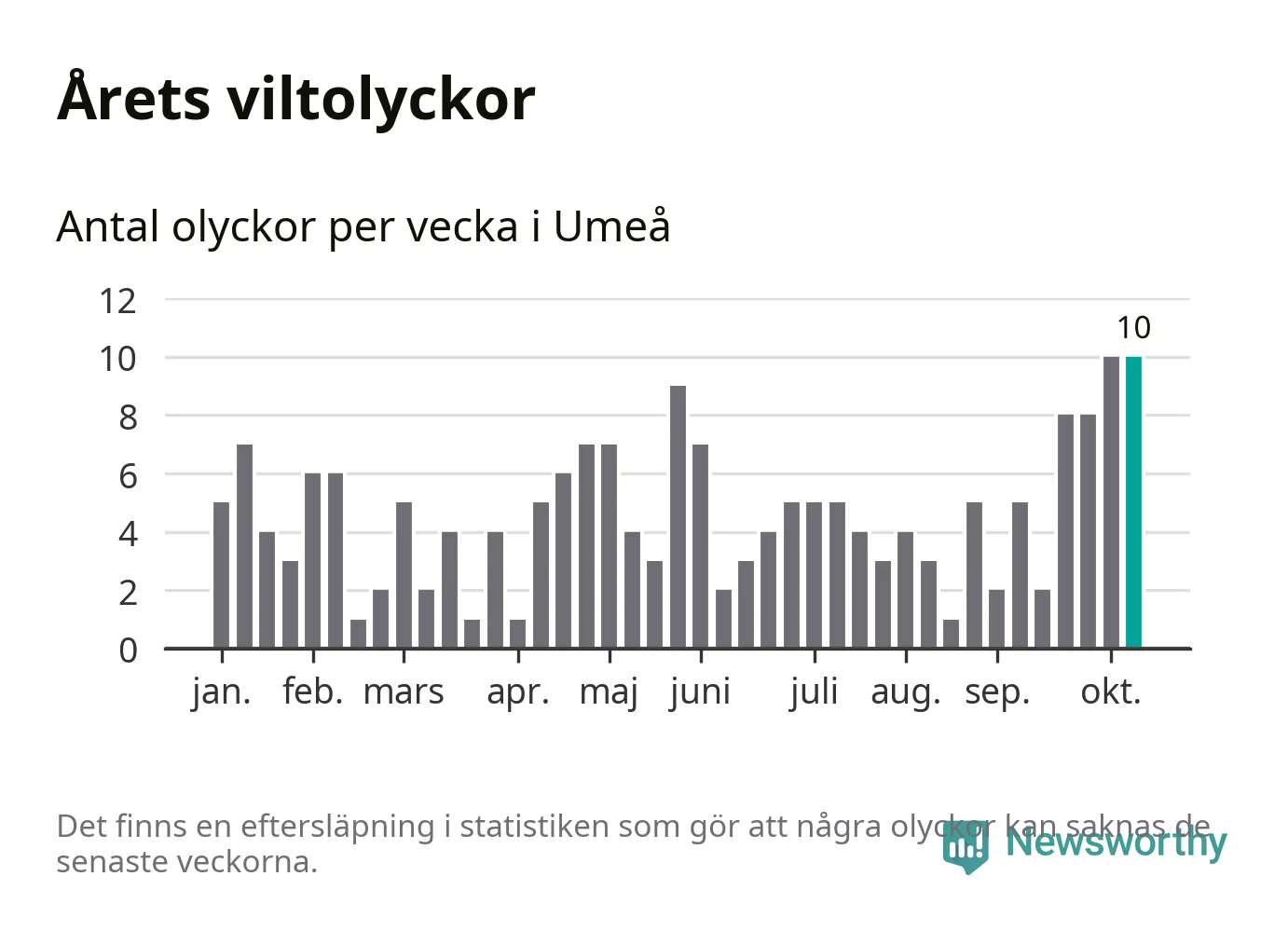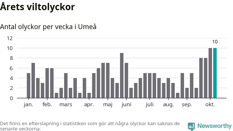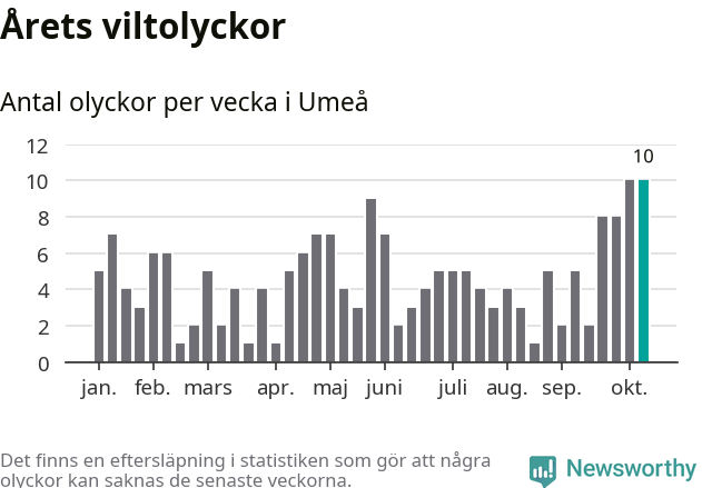 sett till de senaste tio årens statistik. I statistiken ingår inte olyckor med ren, som här räknas som tamdjur.