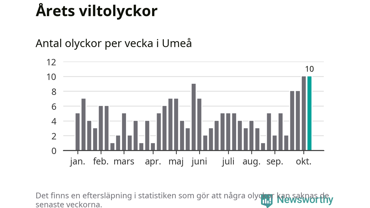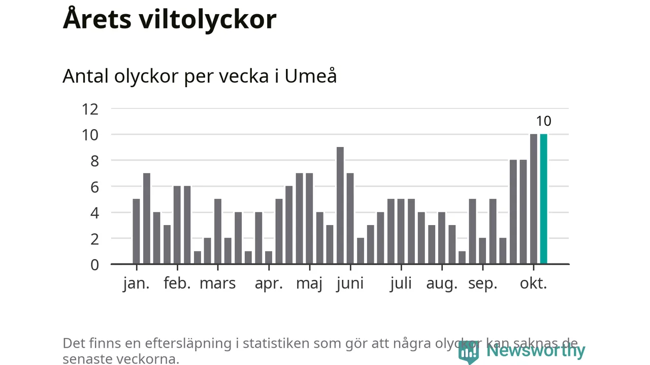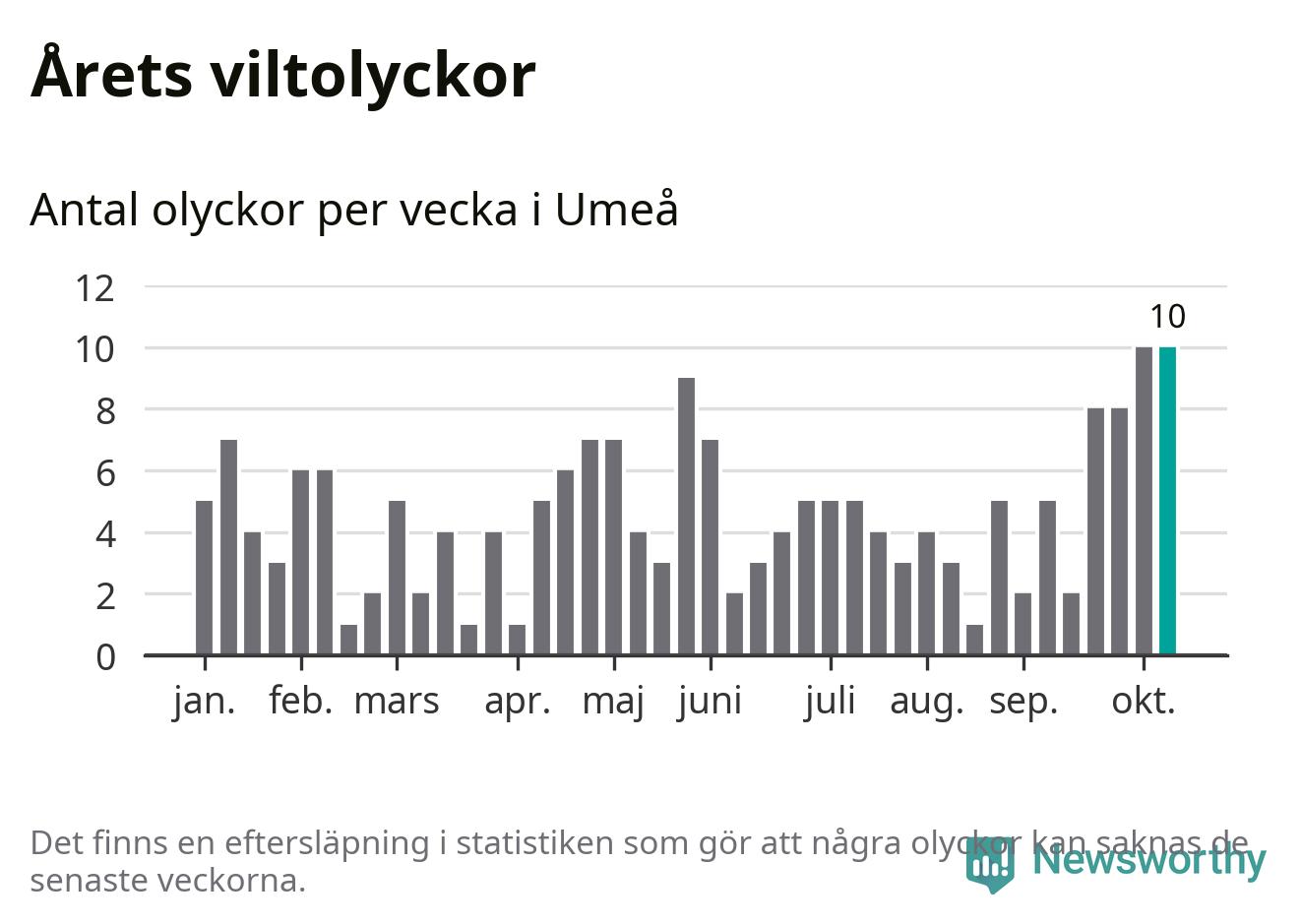 194 viltolyckor i kommunen. Det är en normal nivå i förhållande till hur det har sett ut under de senaste tio åren – genomsnittet för motsvarande period är 182.