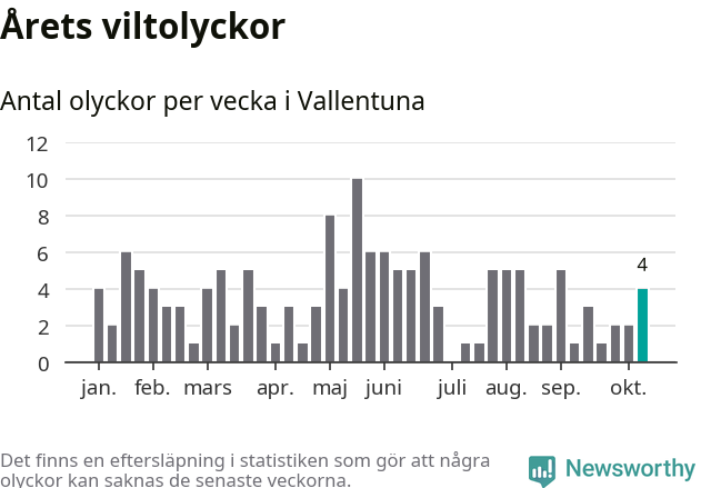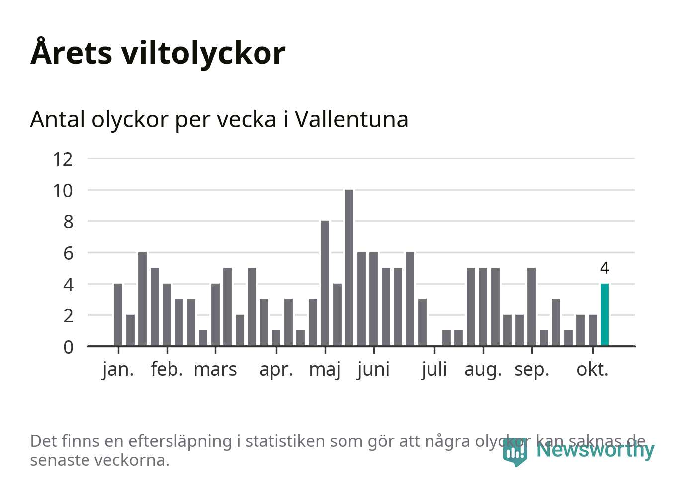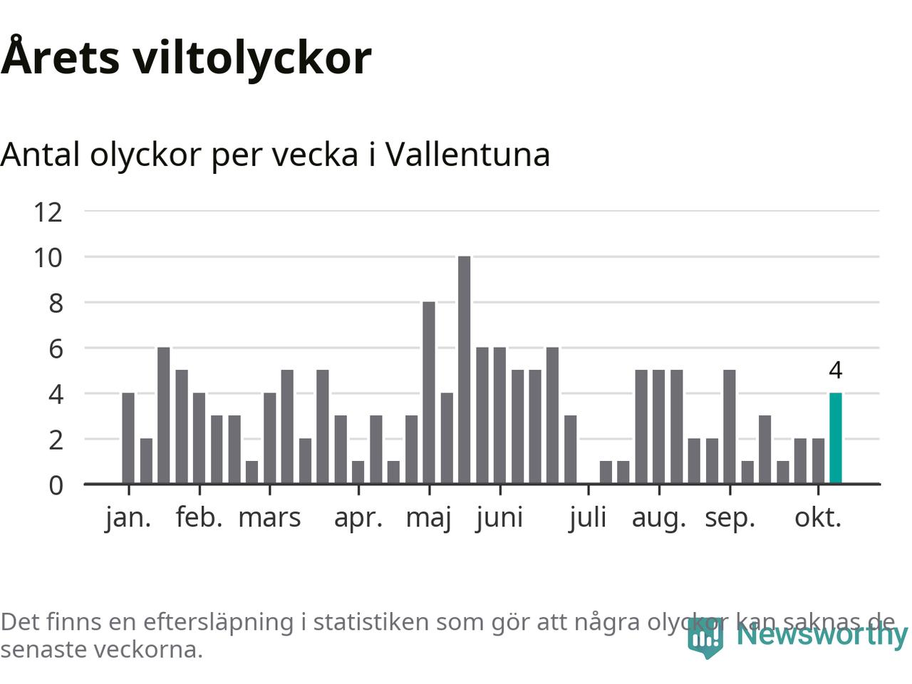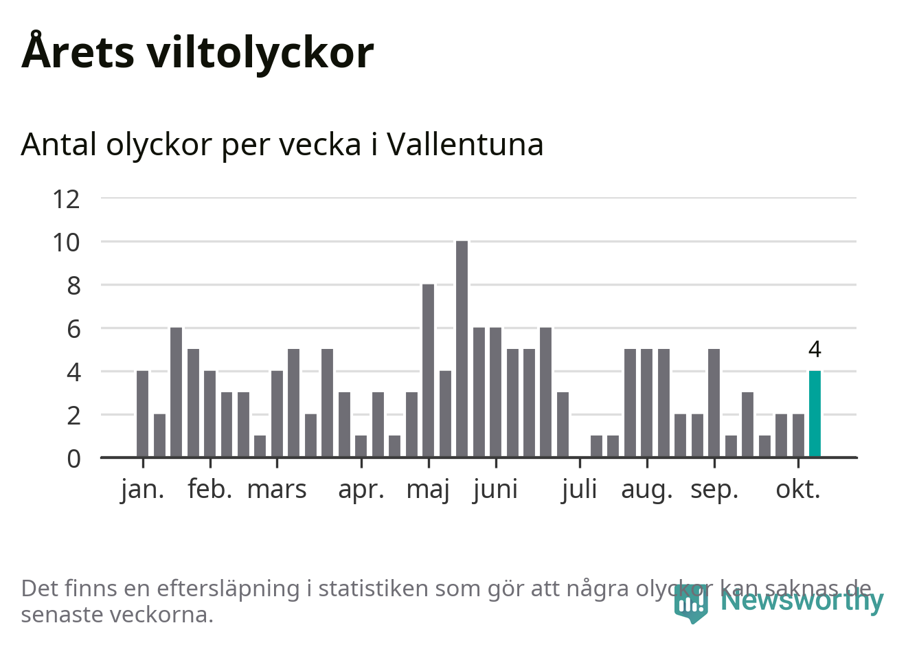 Hittills har fyra viltolyckor rapporterats in i Vallentuna kommun från vecka 42. Se listan här.