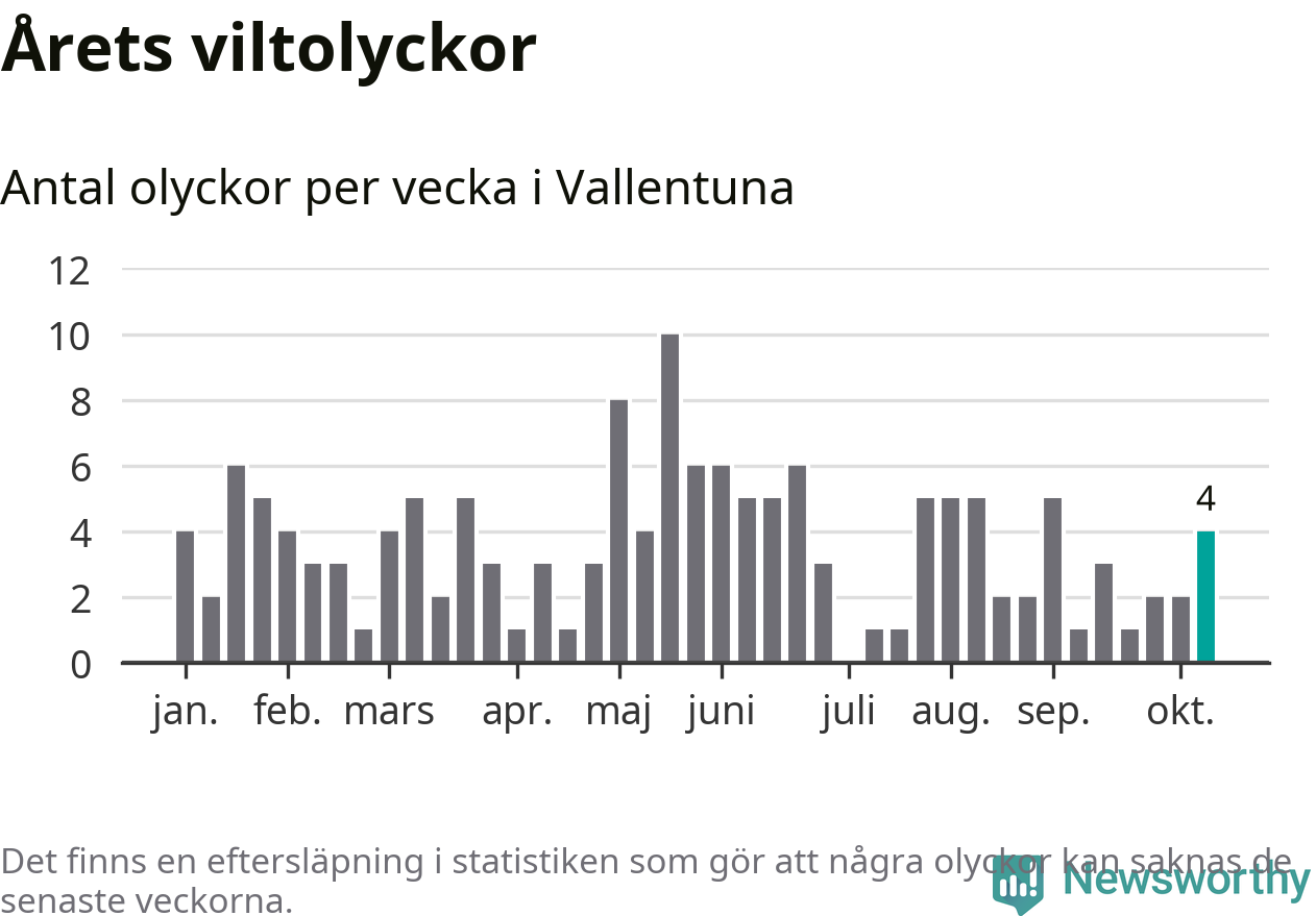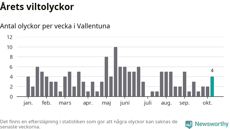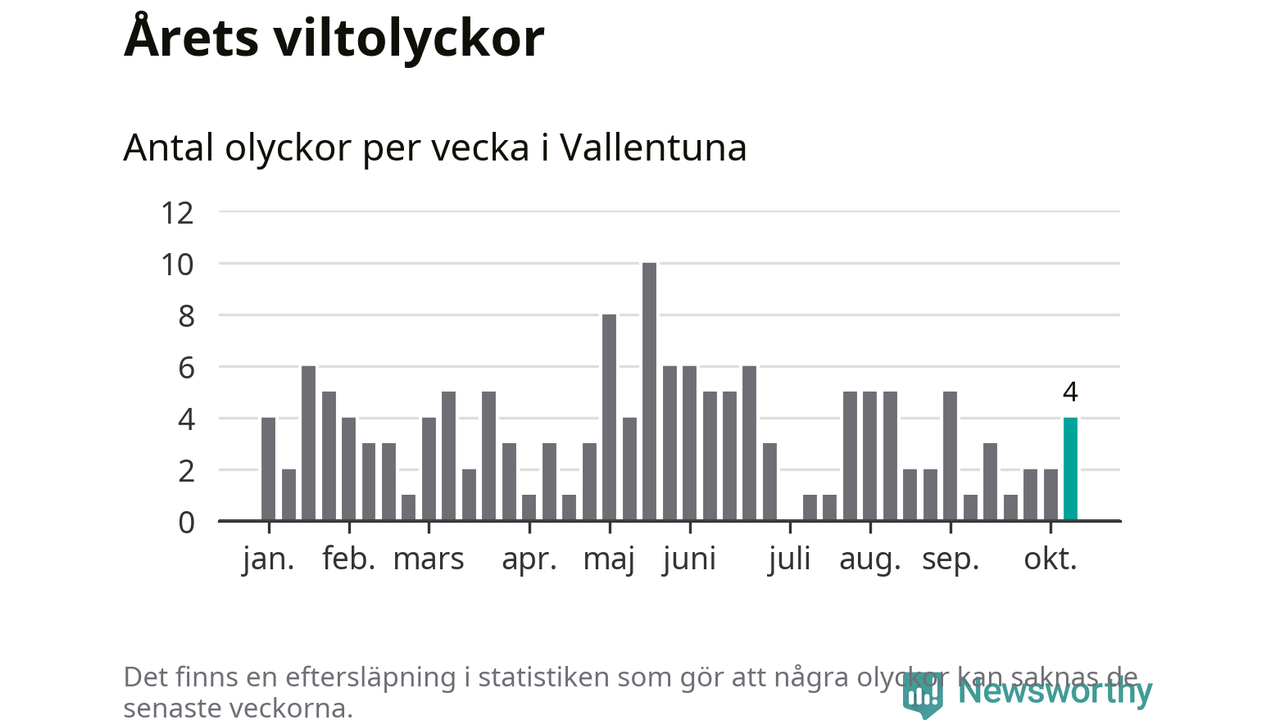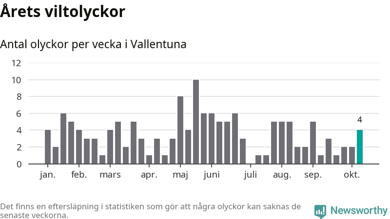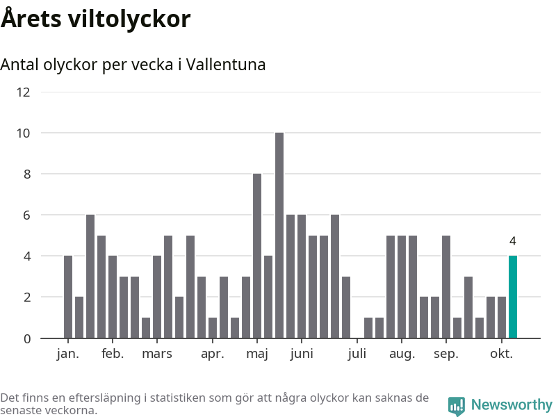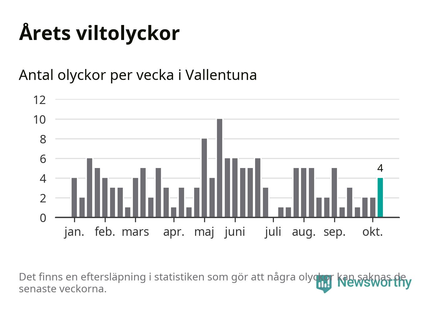 Hittills har fyra viltolyckor rapporterats in i Vallentuna kommun från vecka 42. Se listan här.