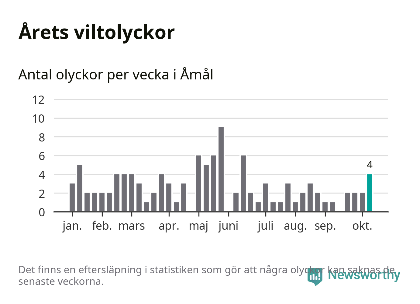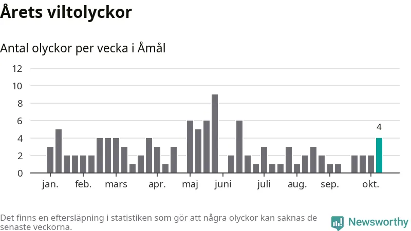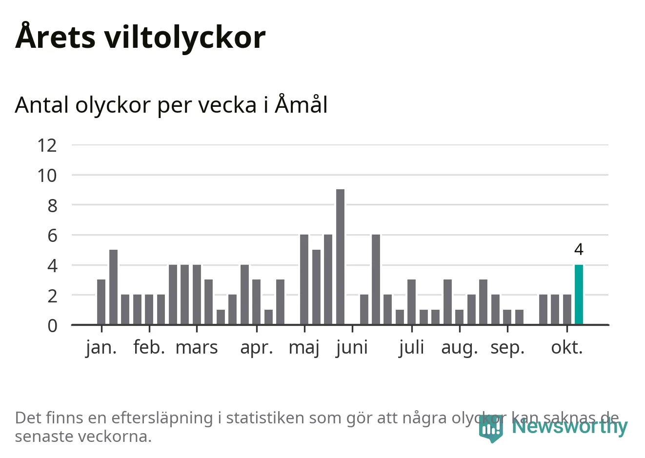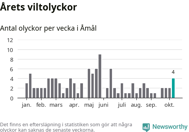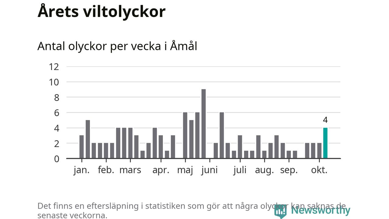 Hittills har fyra viltolyckor rapporterats in i Åmåls kommun från vecka 42. Se listan här.