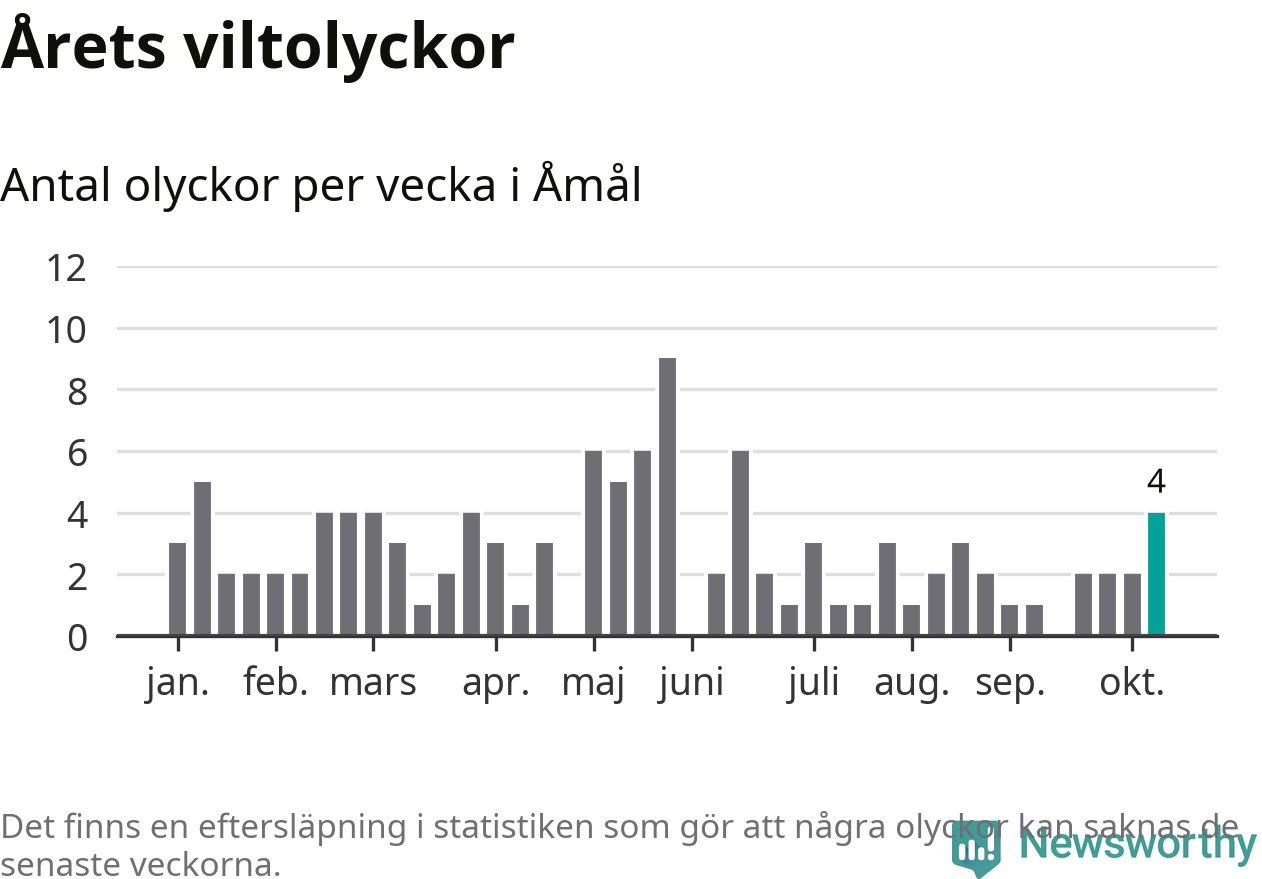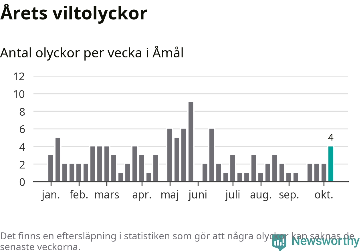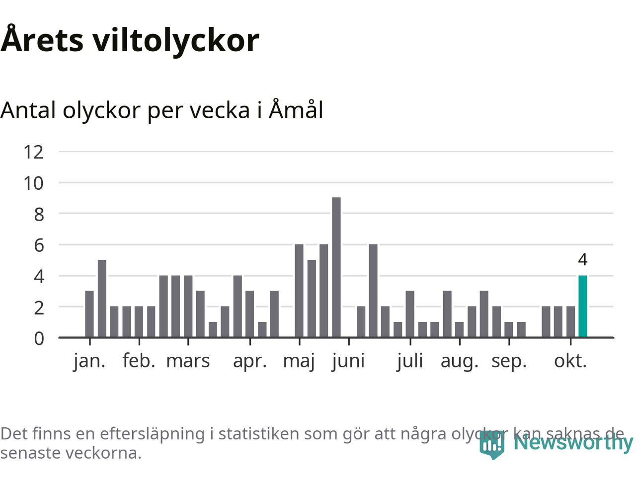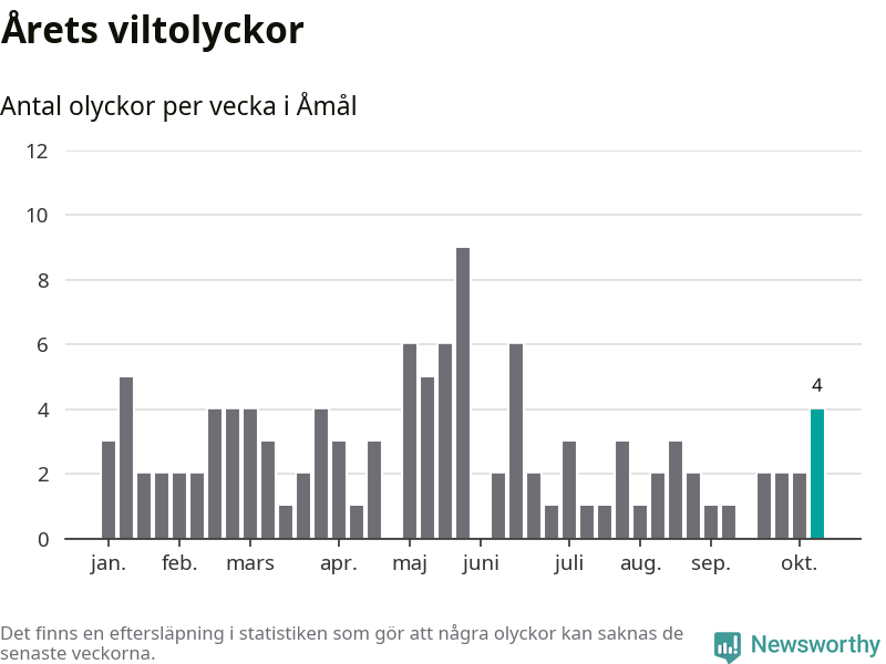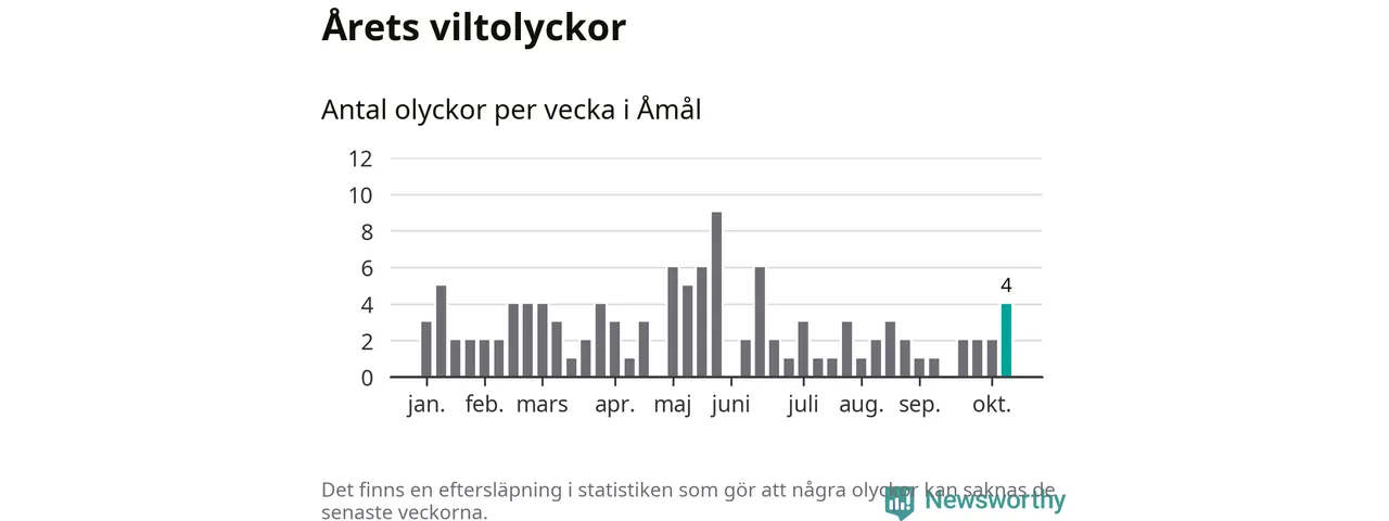 Hittills har fyra viltolyckor rapporterats in i Åmåls kommun från vecka 42. Se listan här.