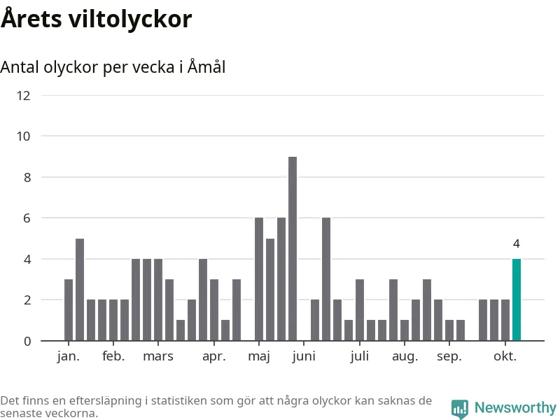 Totalt det här året har det inträffat 111 viltolyckor i kommunen. Det är mindre än genomsnittet för motsvarande period (omkring 153) de senaste tio åren.