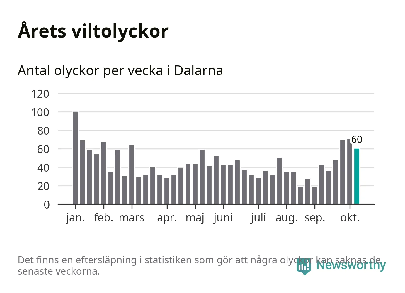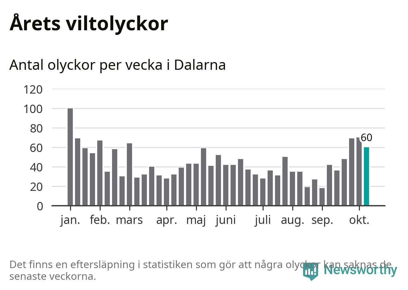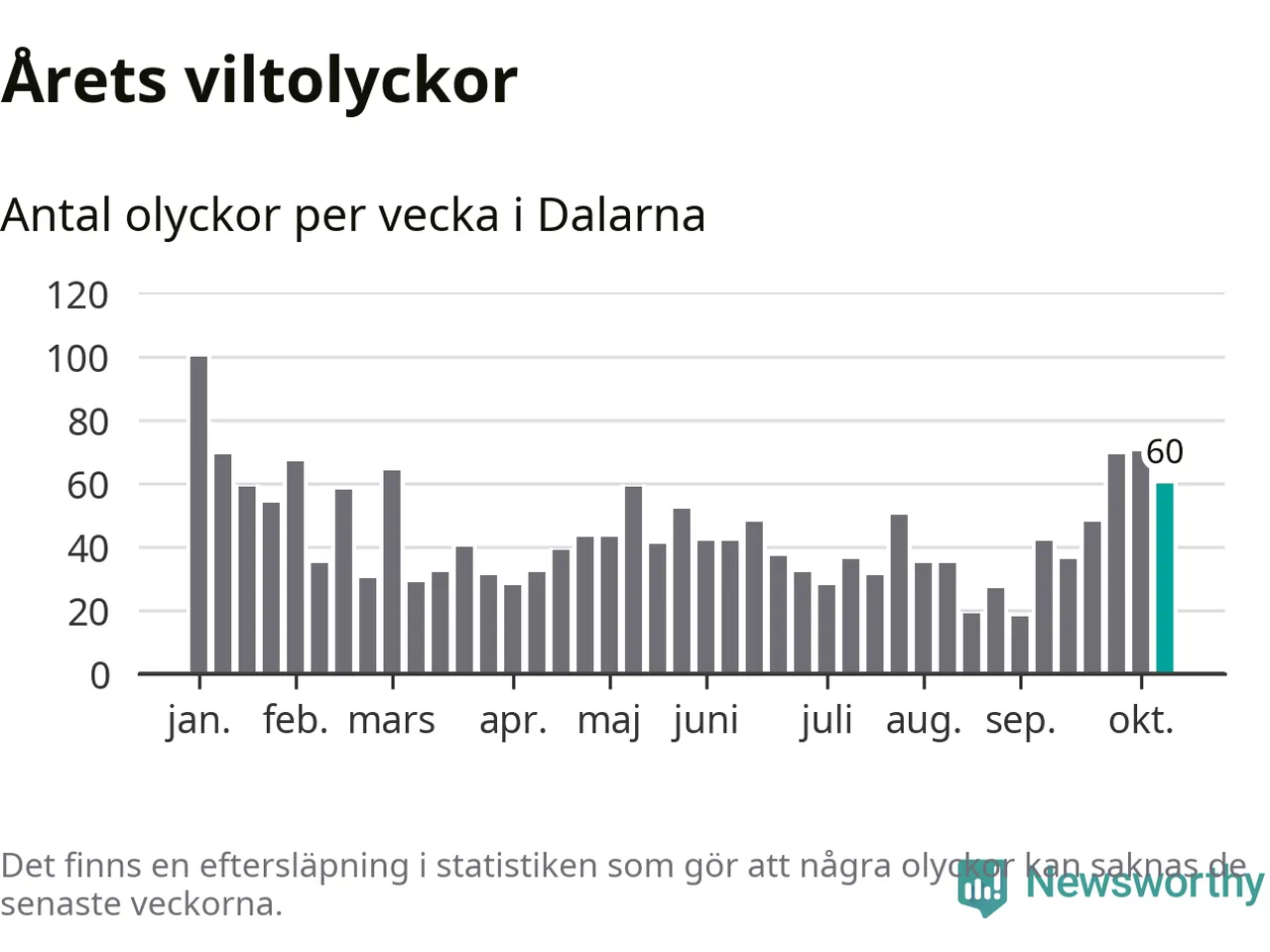 Hittills har 60 viltolyckor rapporterats in i Dalarnas län från vecka 42. Se listan här.