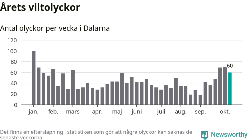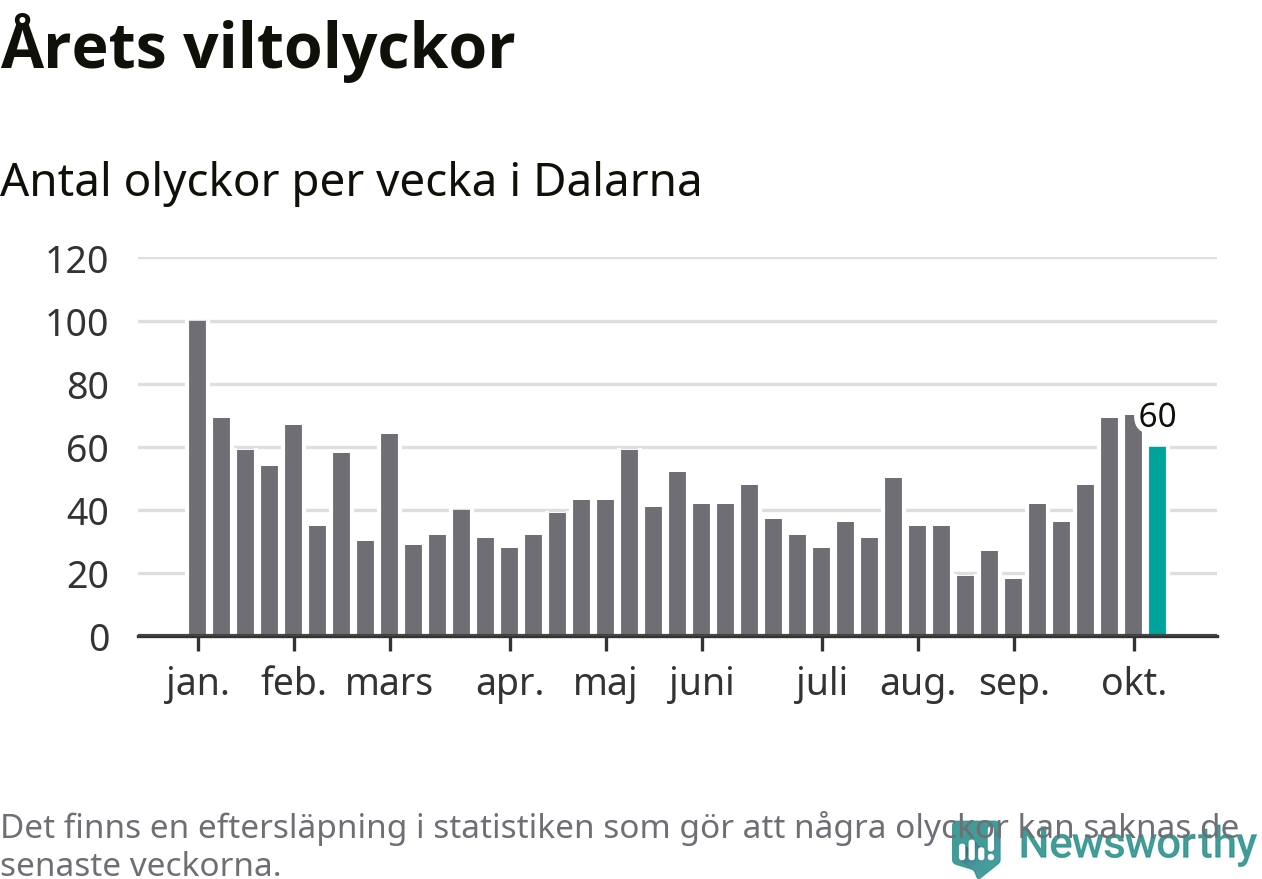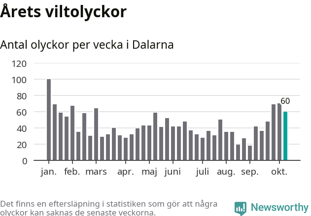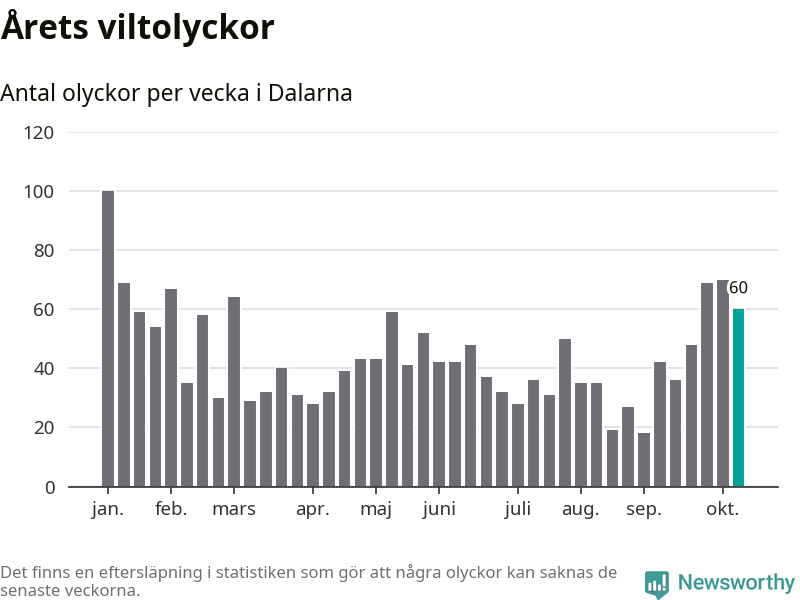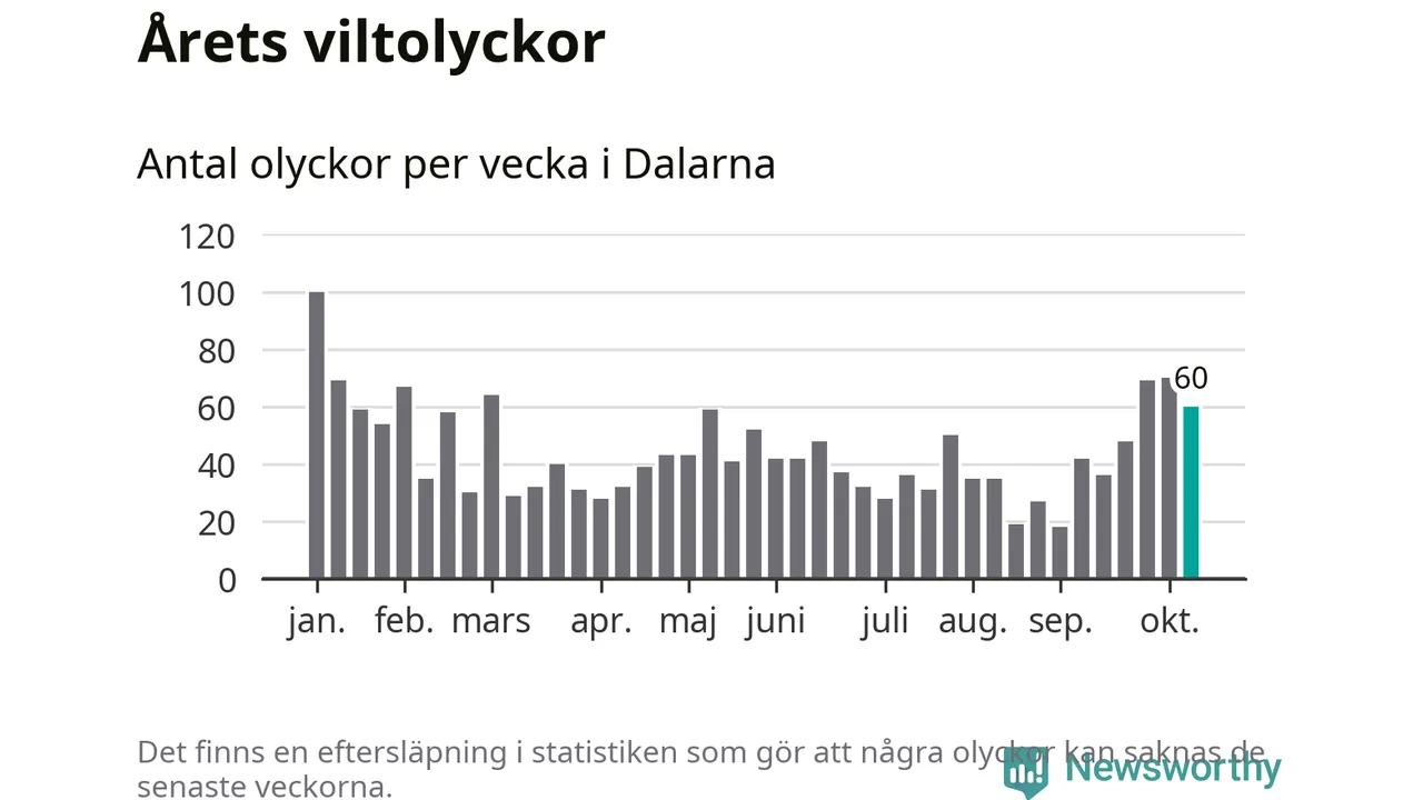 Hittills har 60 viltolyckor rapporterats in i Dalarnas län från vecka 42. Se listan här.