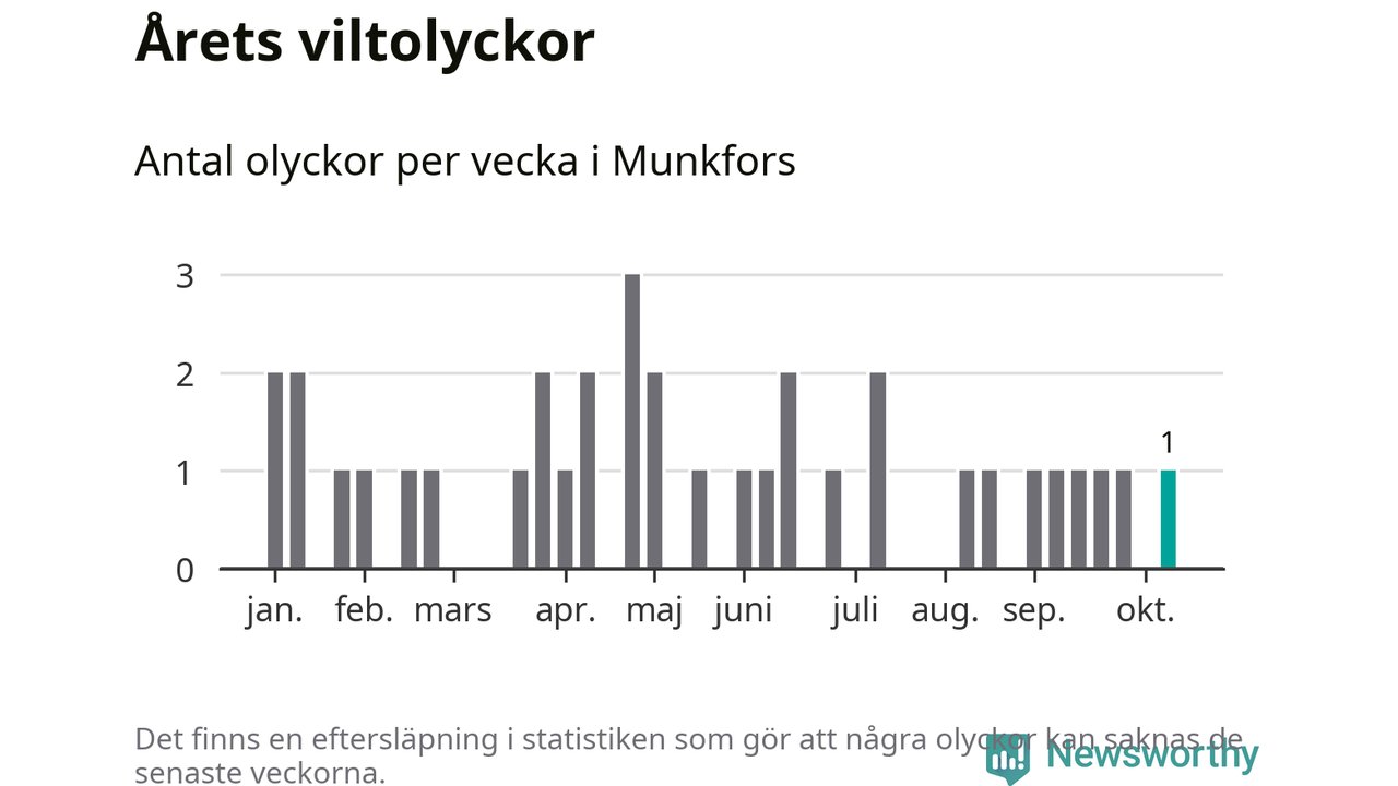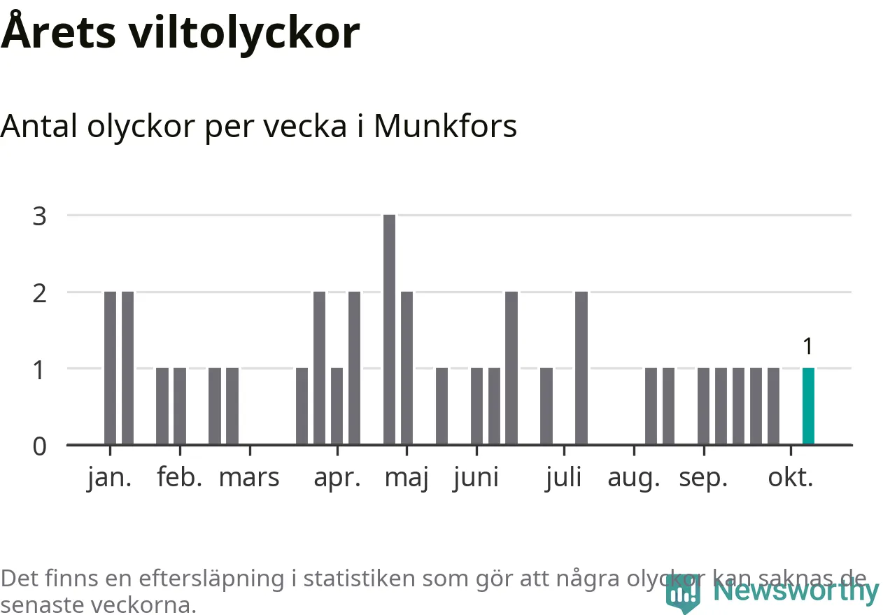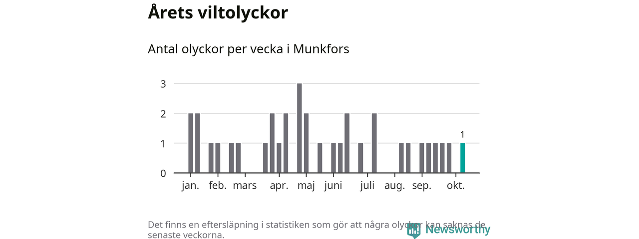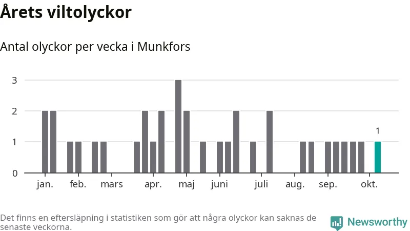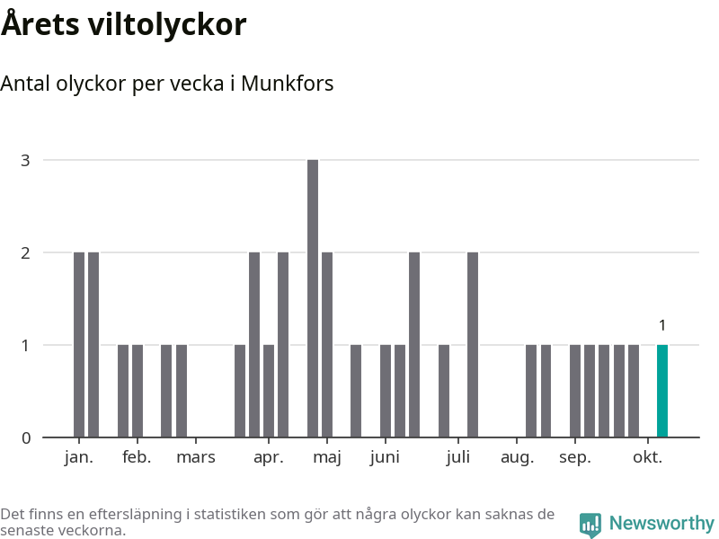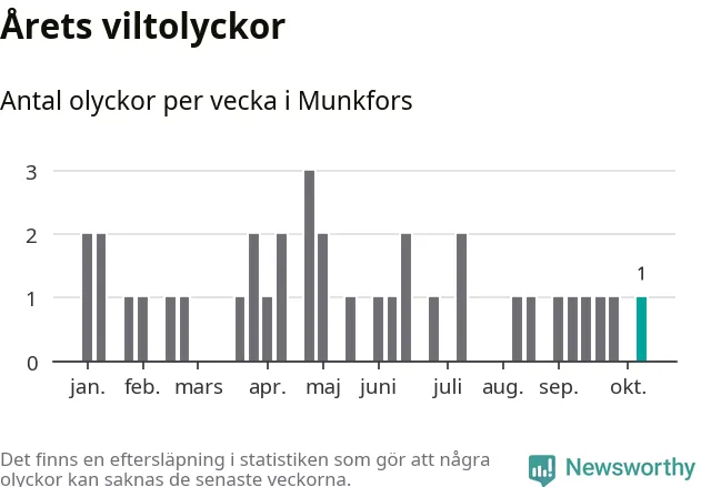 Från förra veckan (vecka 42) har hittills en viltolycka rapporterats in i Munkfors kommun.