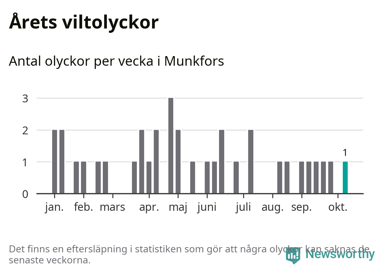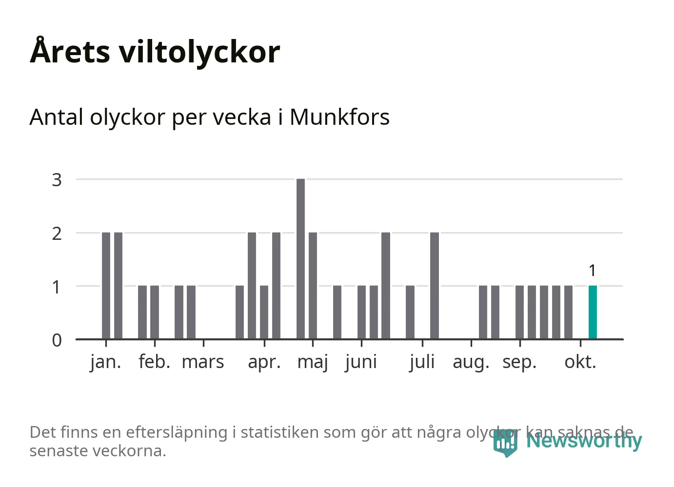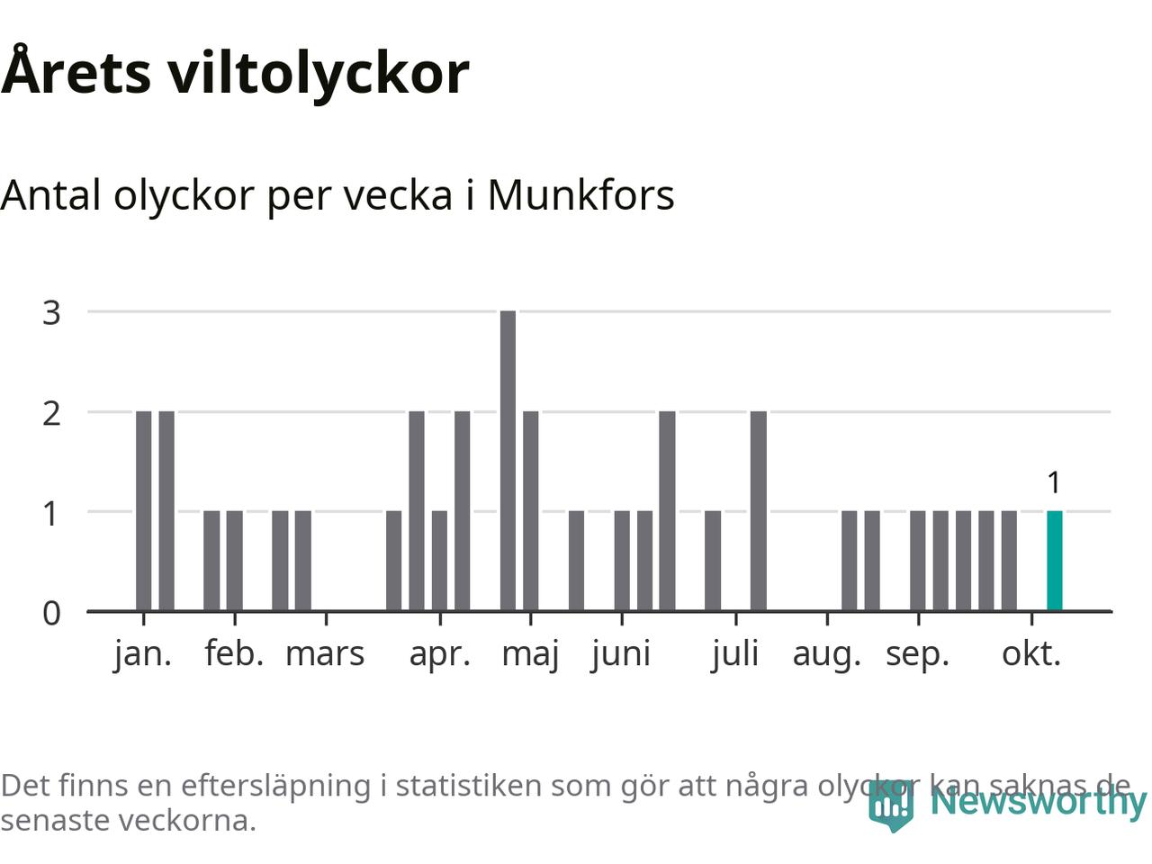 Från förra veckan (vecka 42) har hittills en viltolycka rapporterats in i Munkfors kommun.