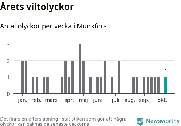 Totalt det här året har det inträffat 35 viltolyckor i kommunen. Det är mer än genomsnittet för motsvarande period (omkring 28) de senaste tio åren.
