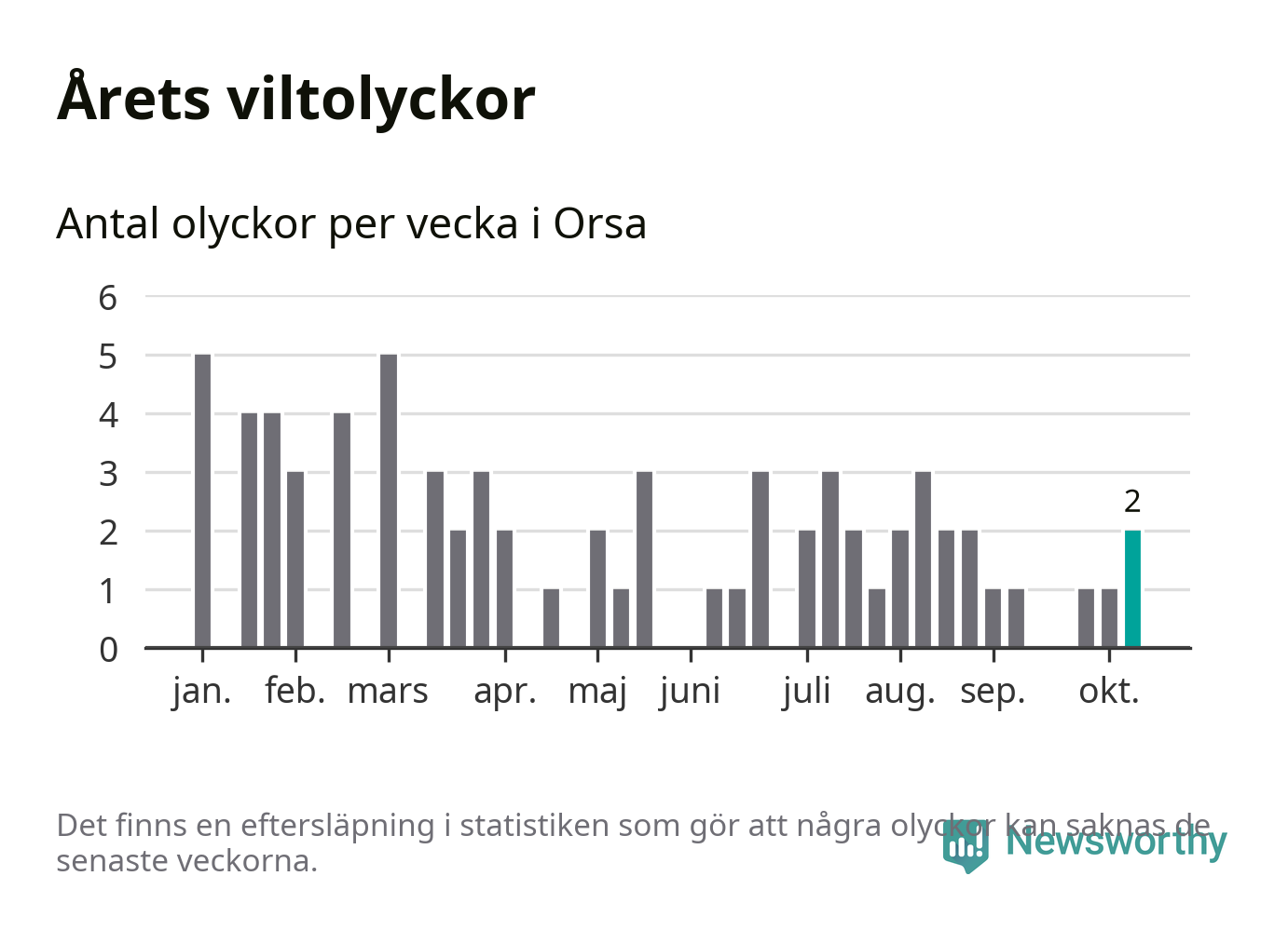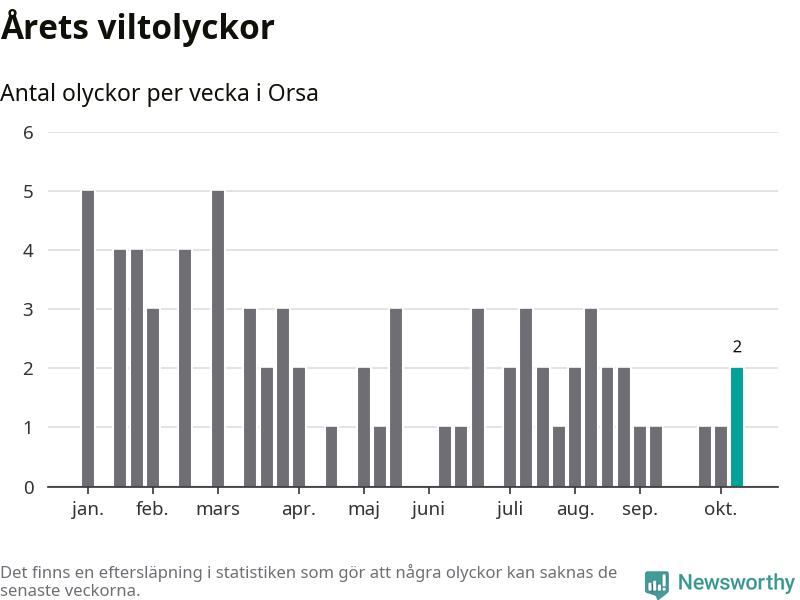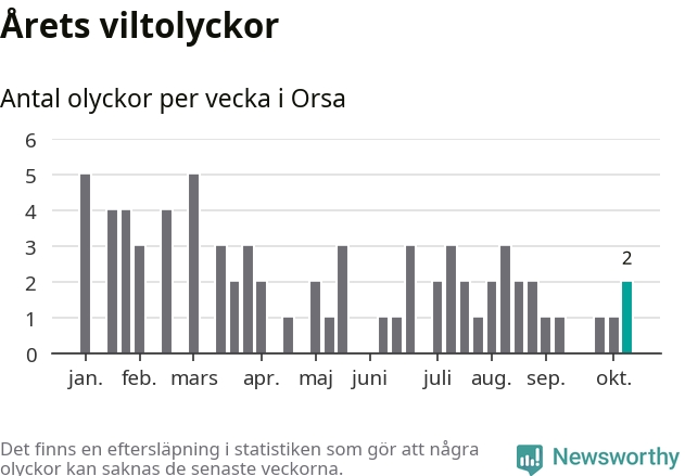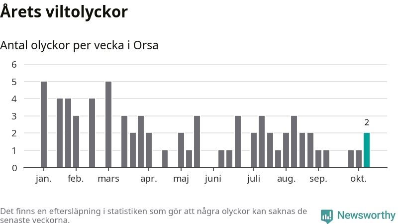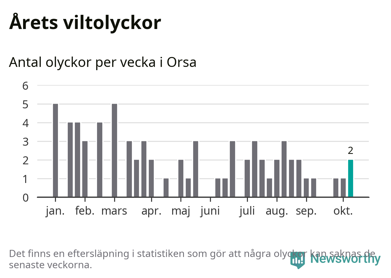 Hittills har två viltolyckor rapporterats in i Orsa kommun från vecka 42. Se listan här.