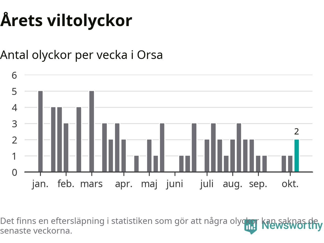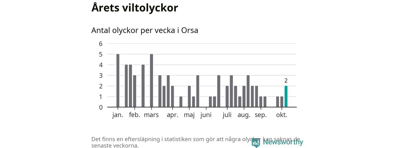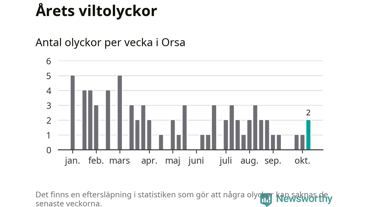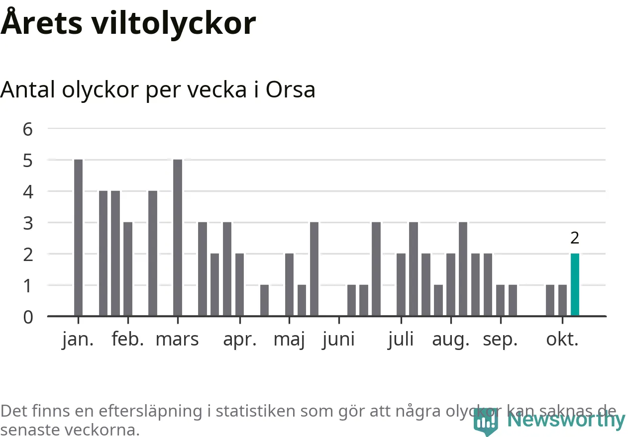 Hittills har två viltolyckor rapporterats in i Orsa kommun från vecka 42. Se listan här.