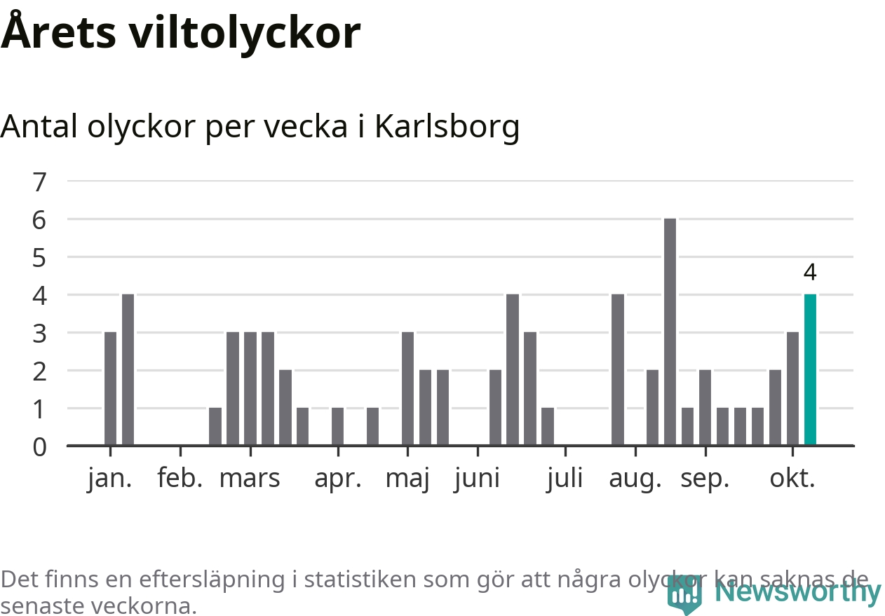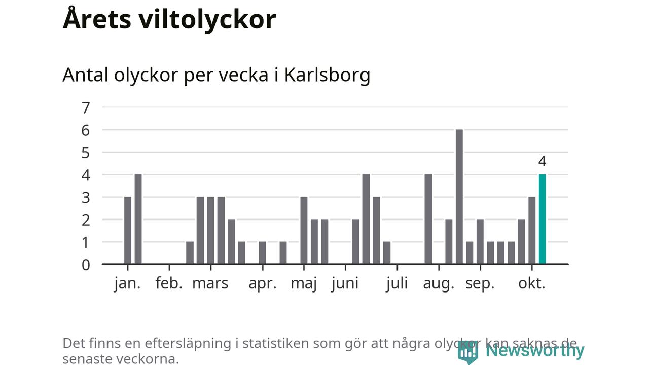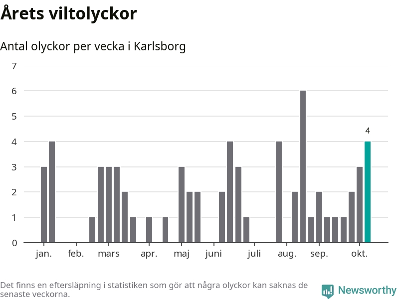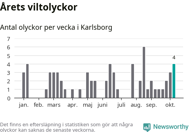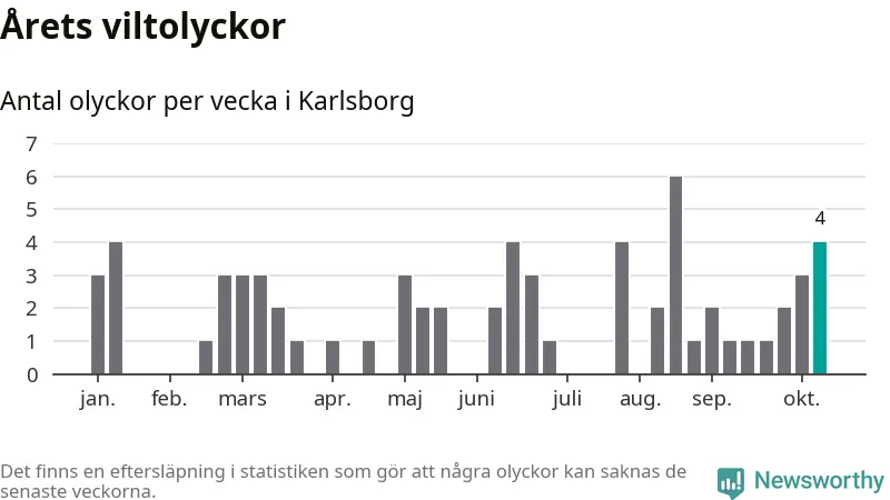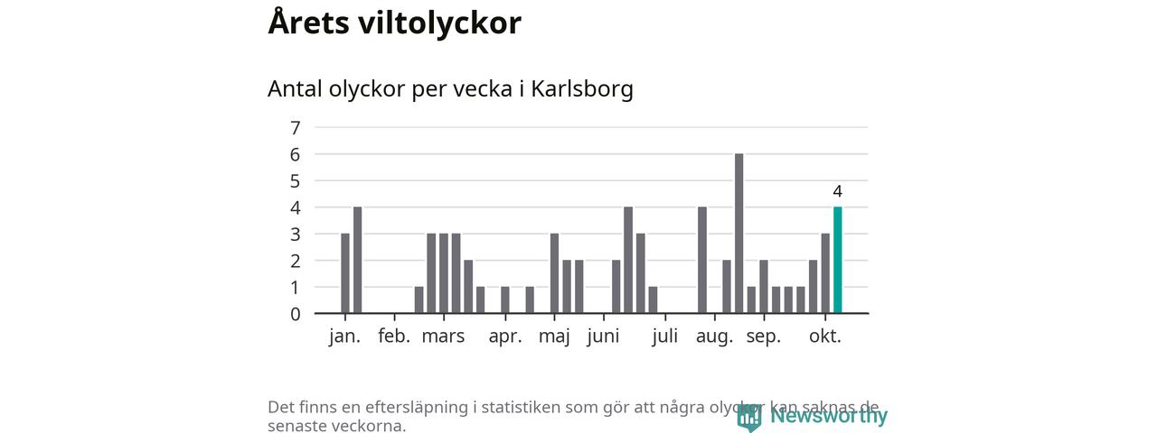 Hittills har fyra viltolyckor rapporterats in i Karlsborgs kommun från vecka 42. Se listan här.