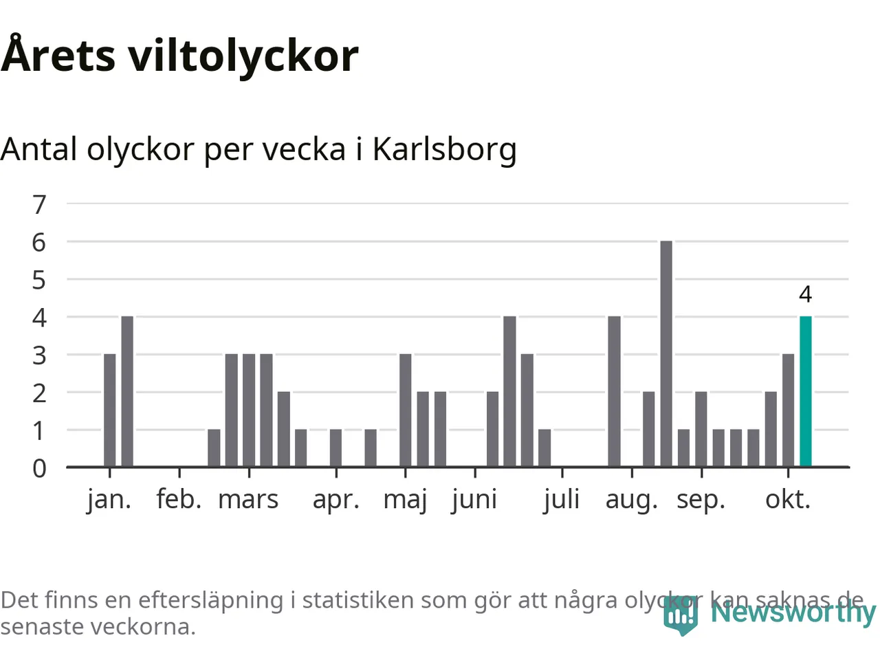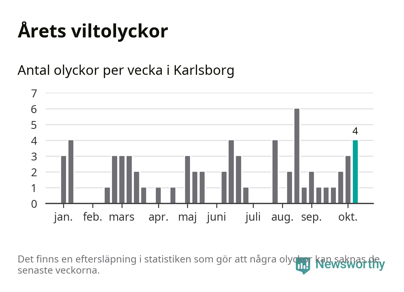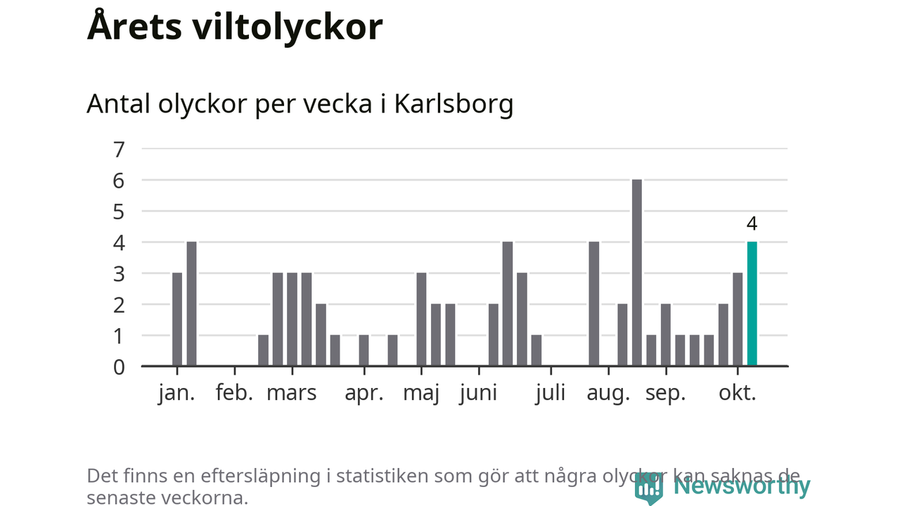 Hittills har fyra viltolyckor rapporterats in i Karlsborgs kommun från vecka 42. Se listan här.