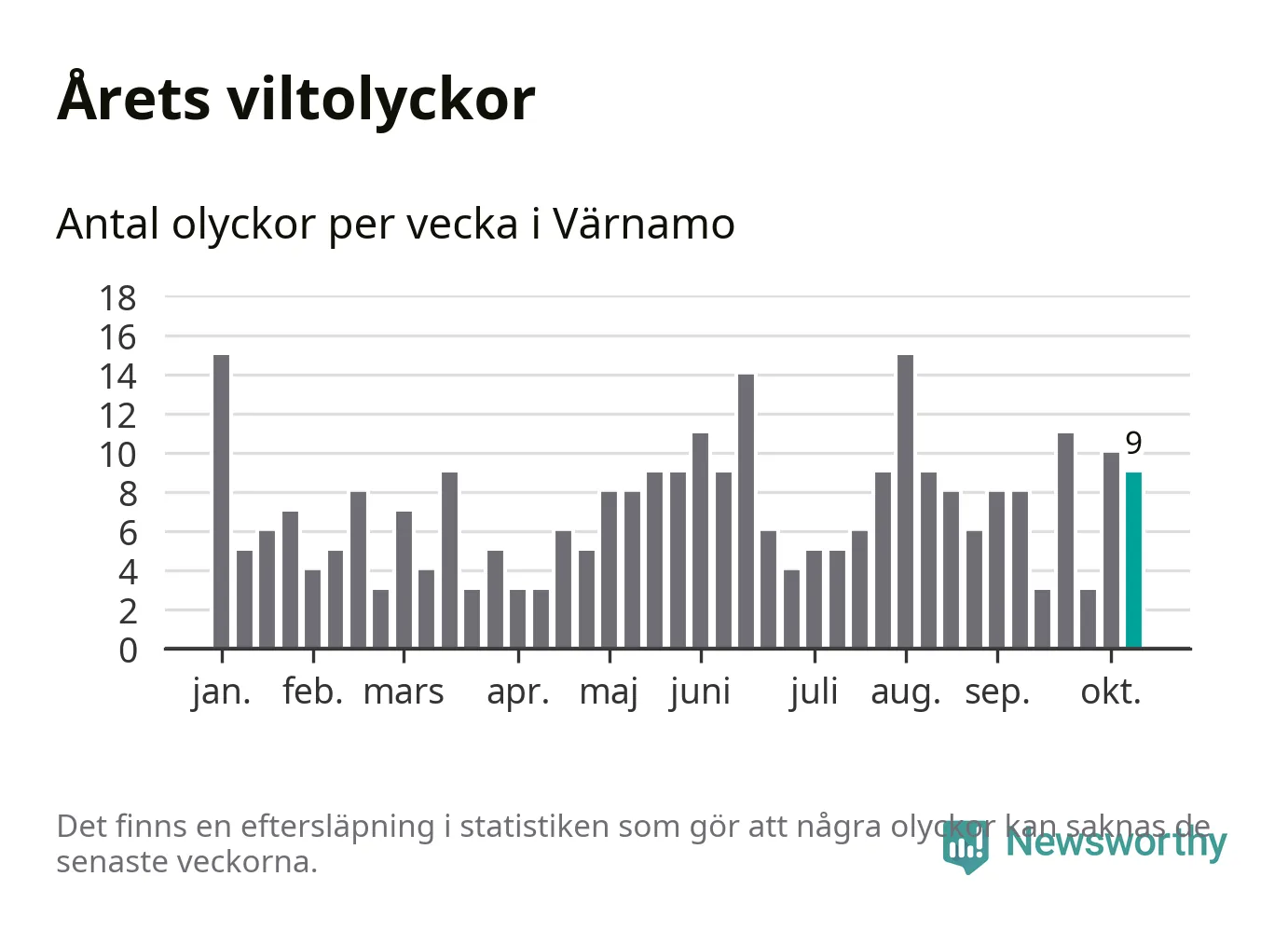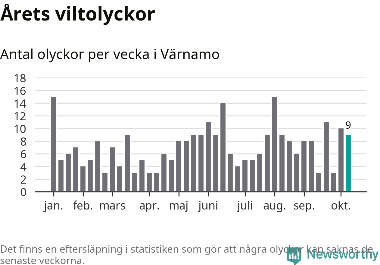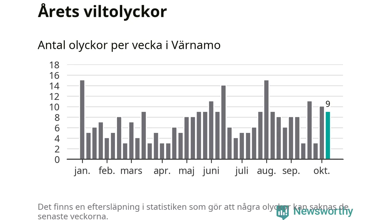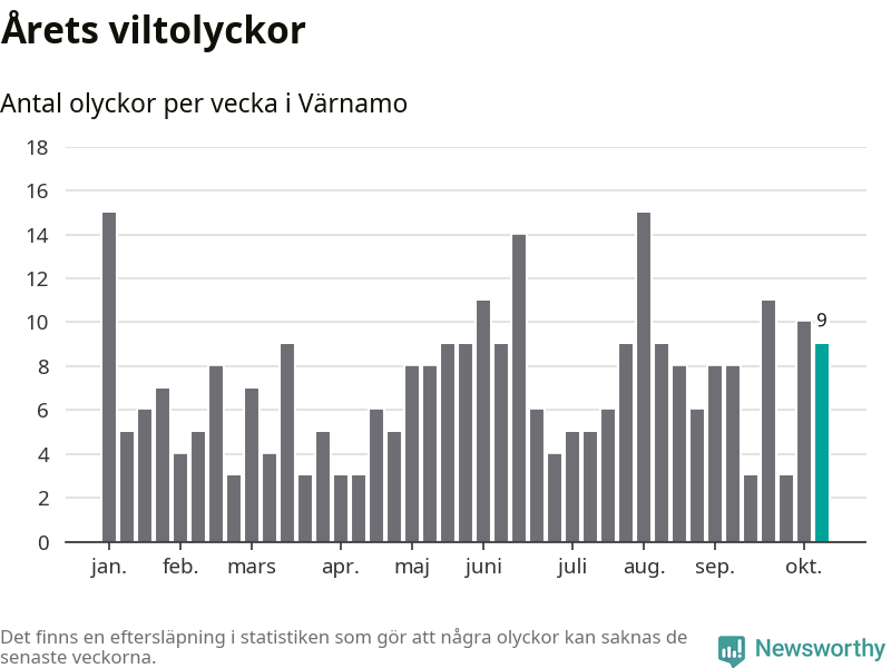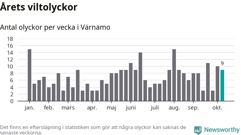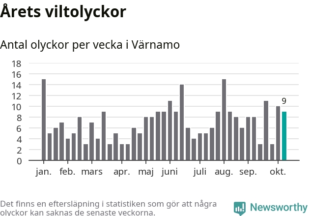 Hittills har nio viltolyckor rapporterats in i Värnamo kommun från vecka 42. Se listan här.