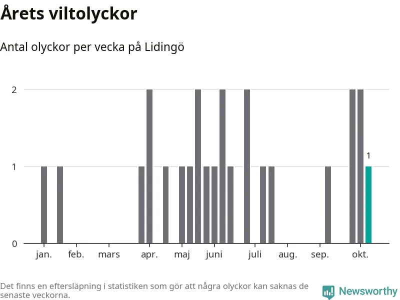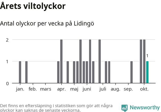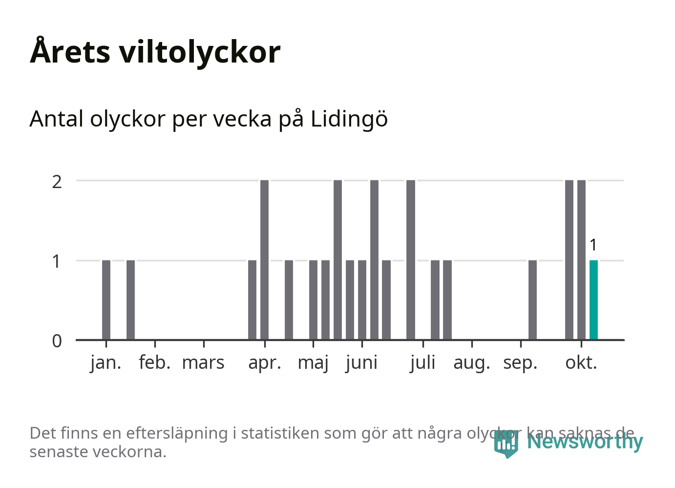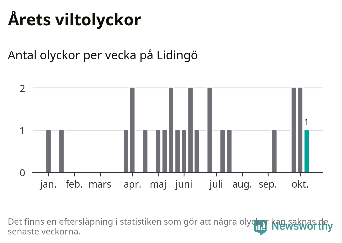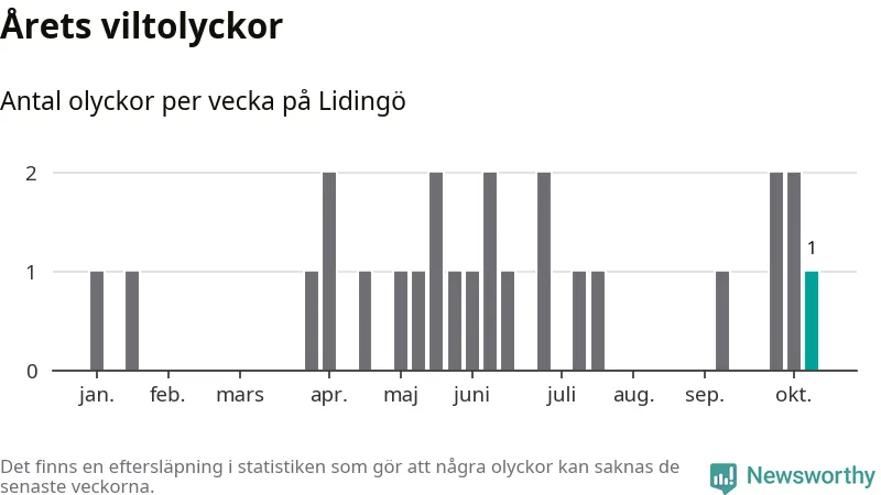 Från förra veckan (vecka 42) har hittills en viltolycka rapporterats in i Lidingö kommun.