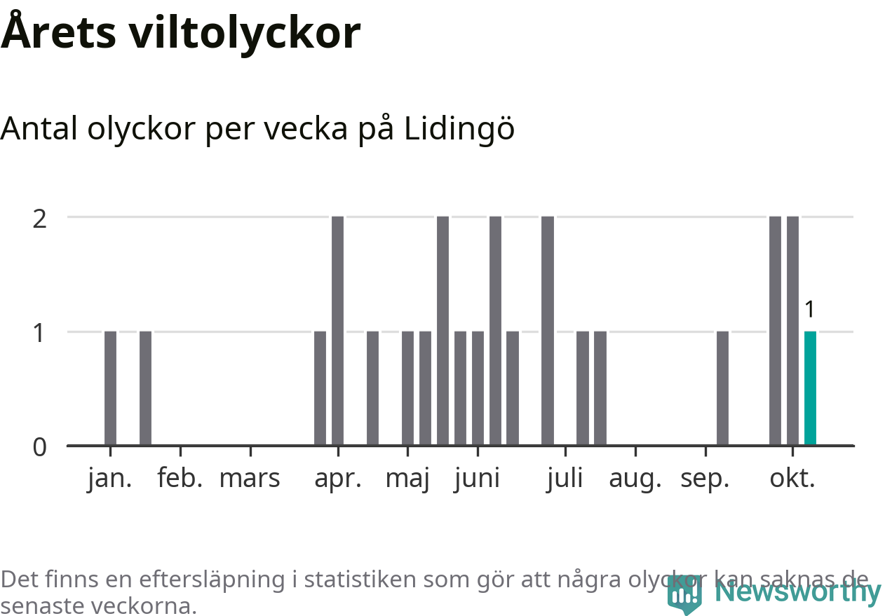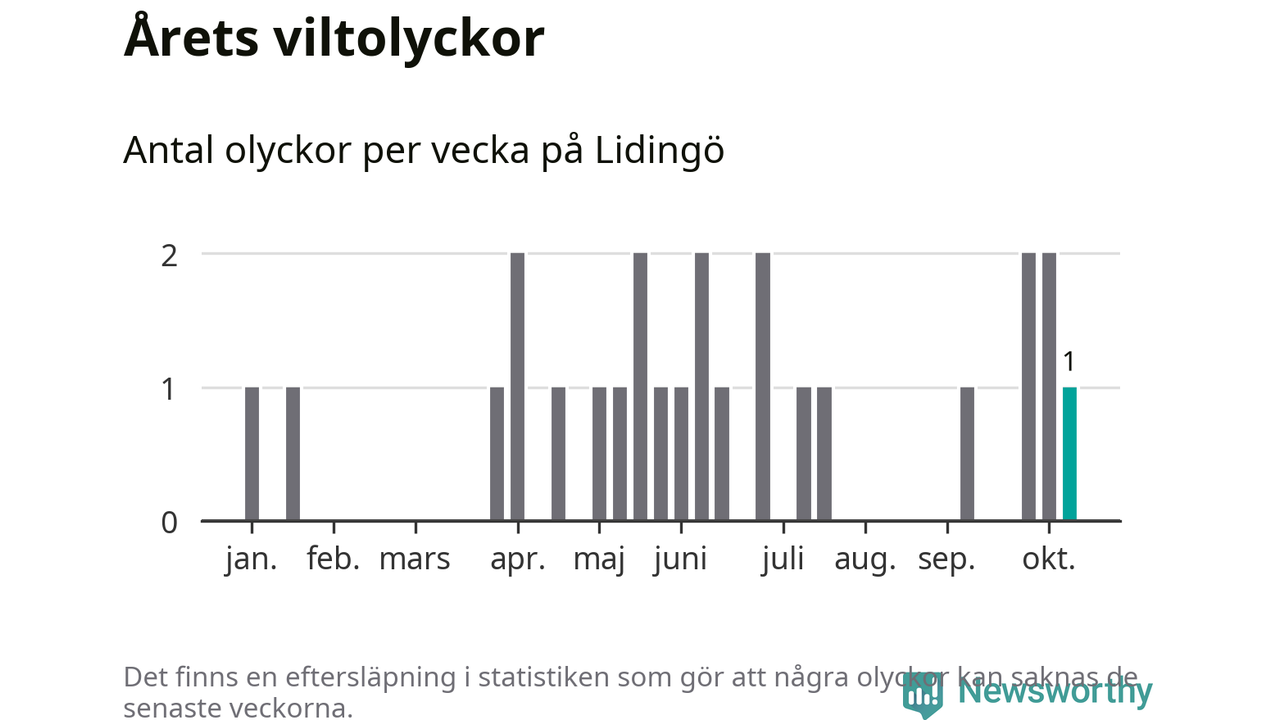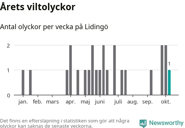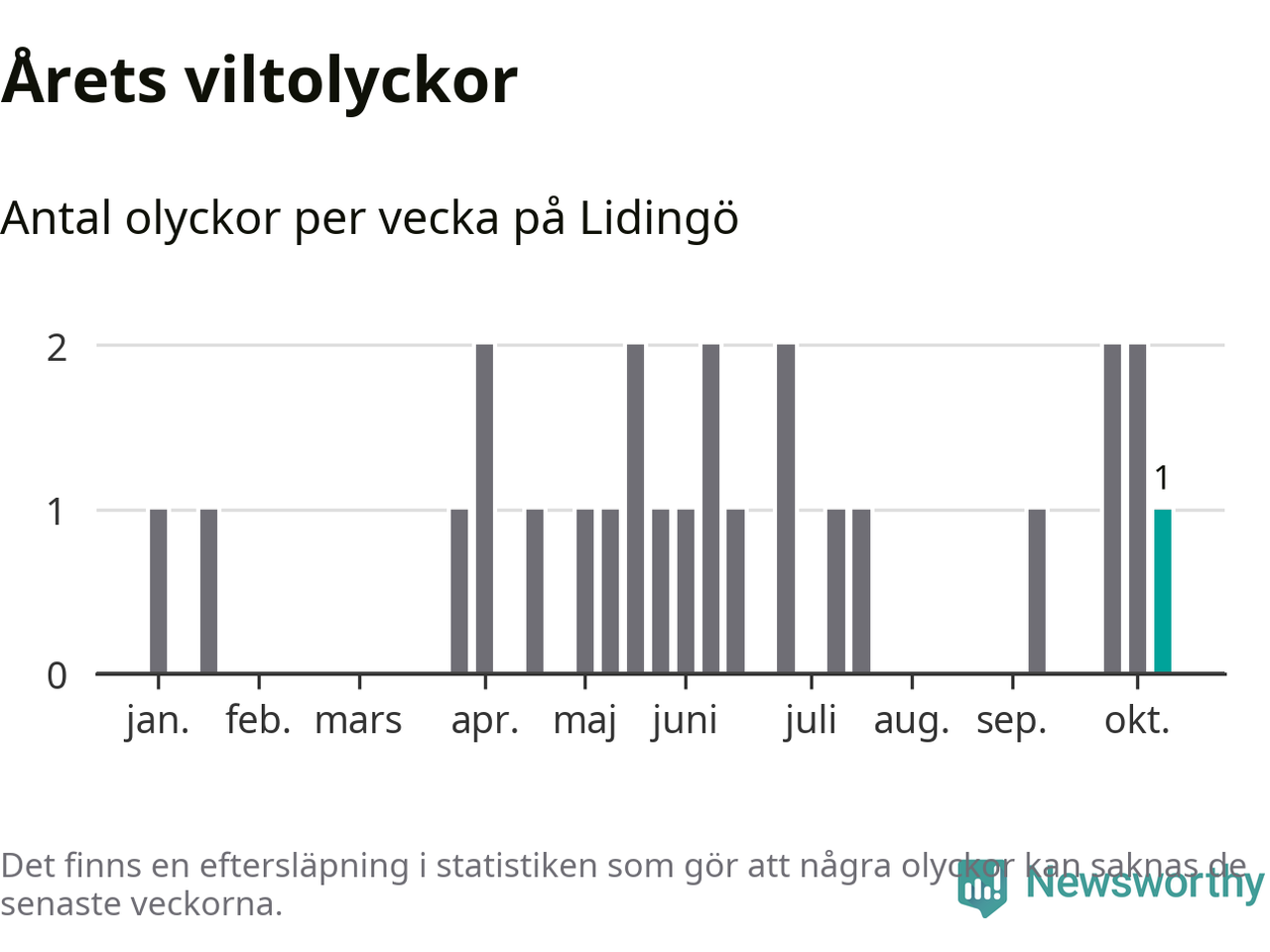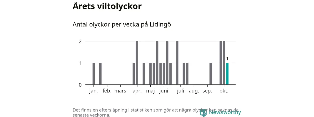 Från förra veckan (vecka 42) har hittills en viltolycka rapporterats in i Lidingö kommun.