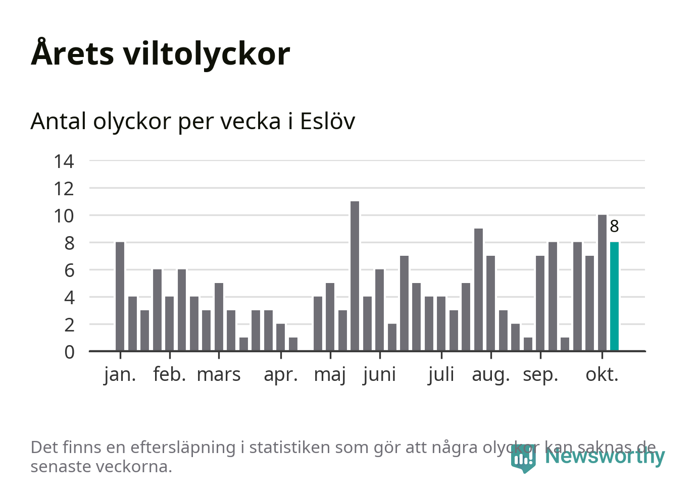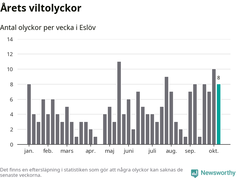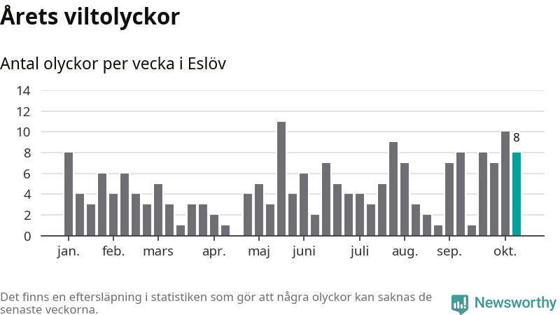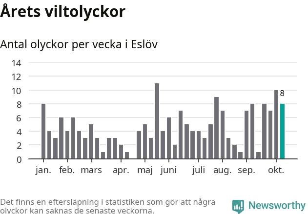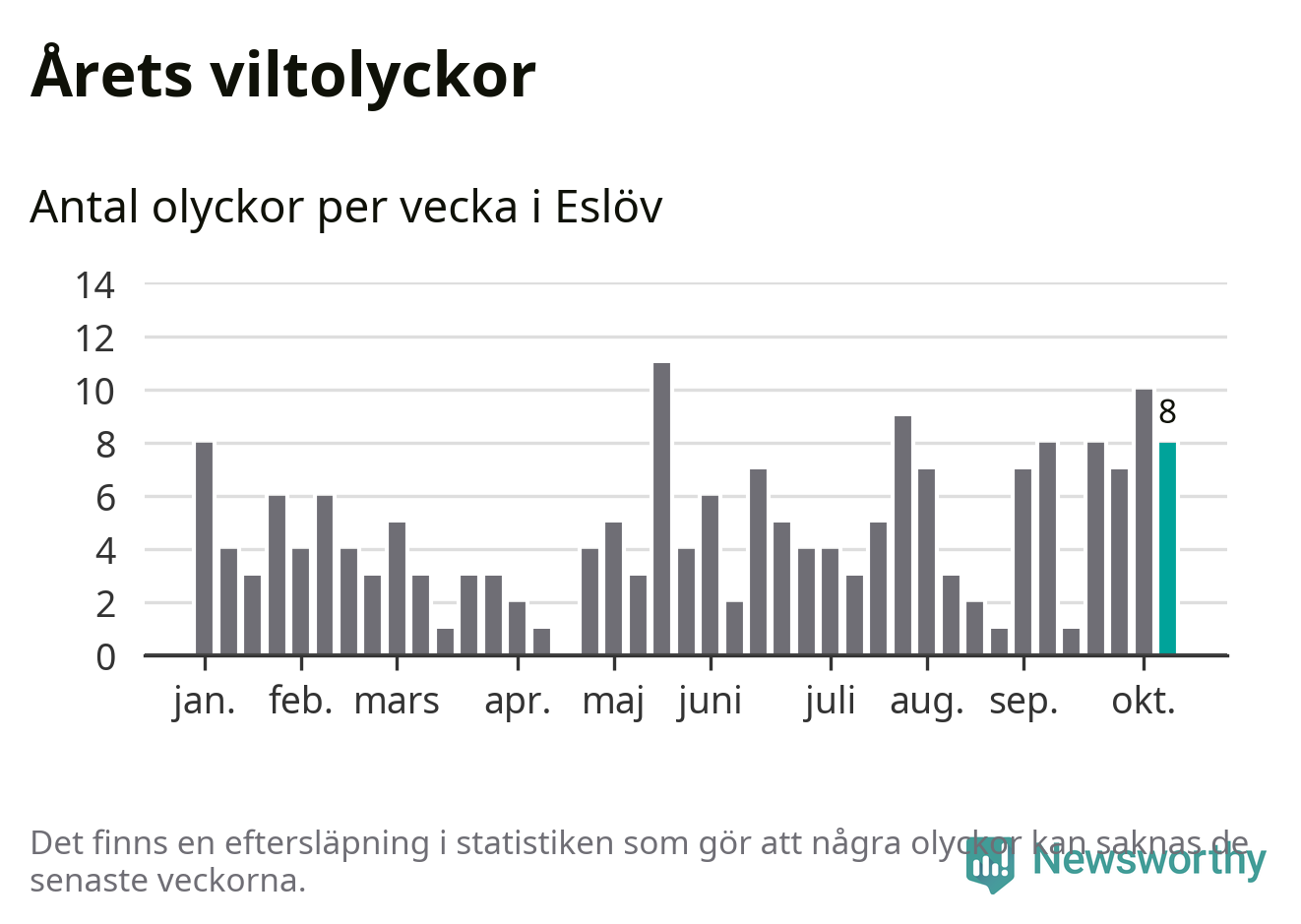 Hittills har åtta viltolyckor rapporterats in i Eslövs kommun från vecka 42. Se listan här.