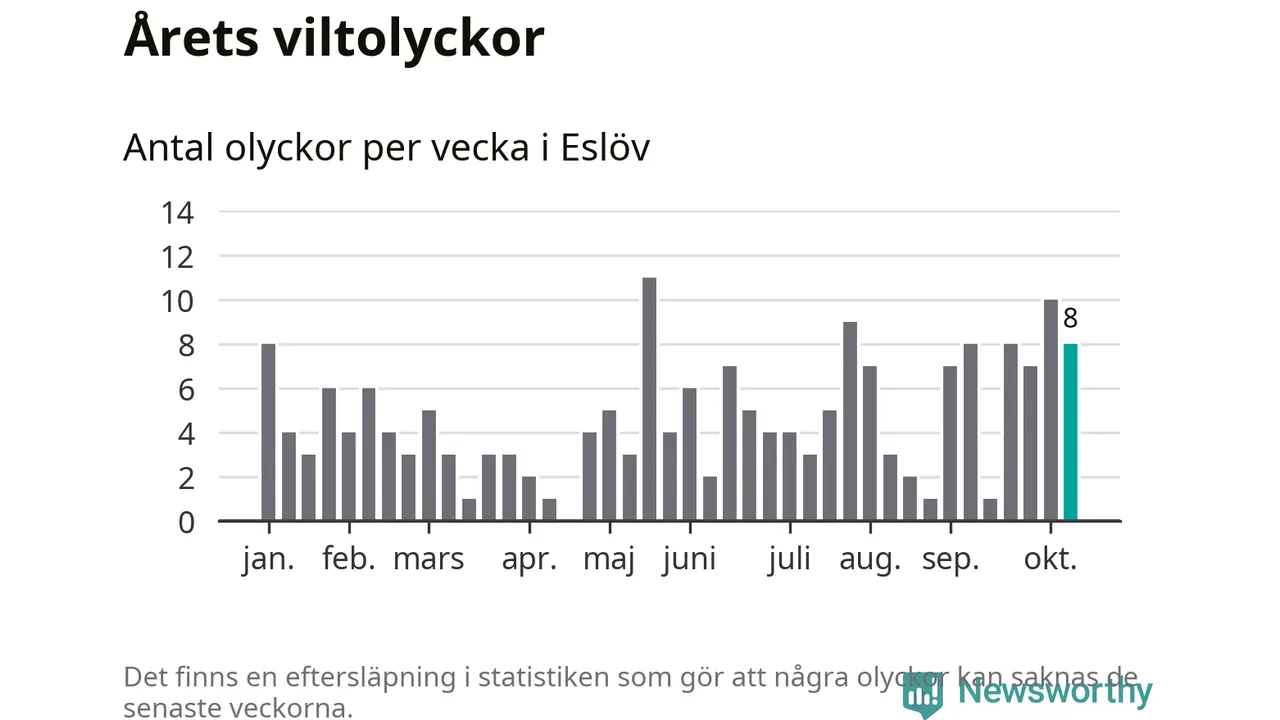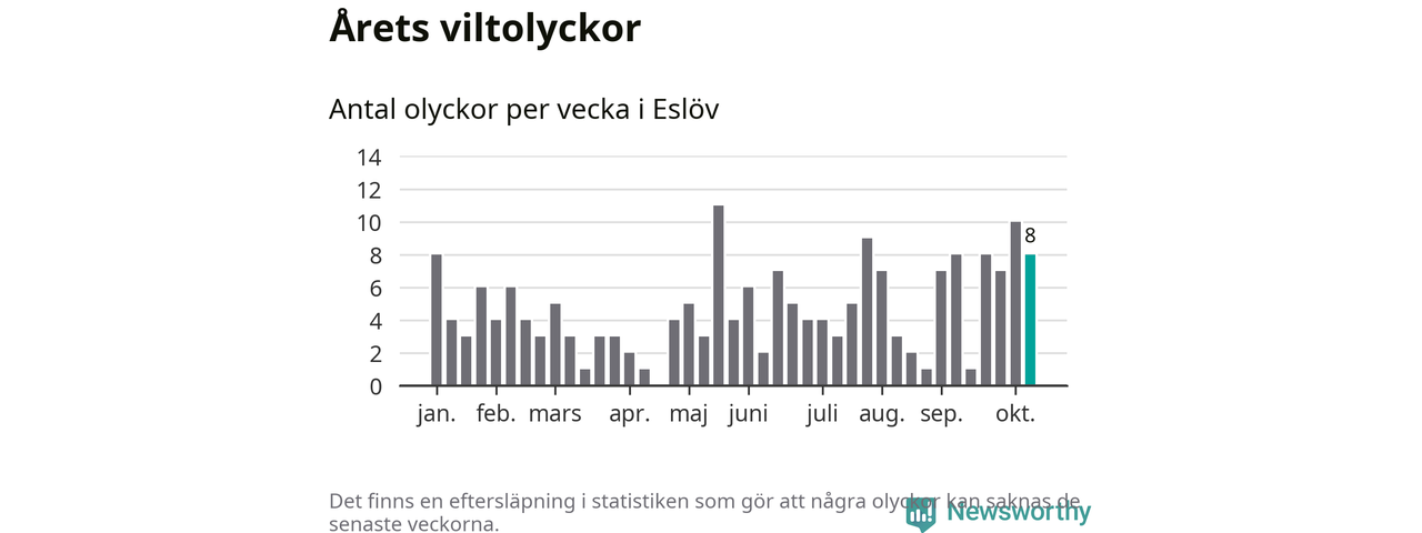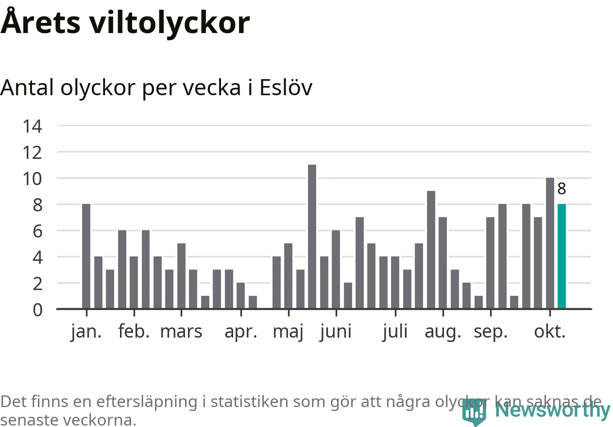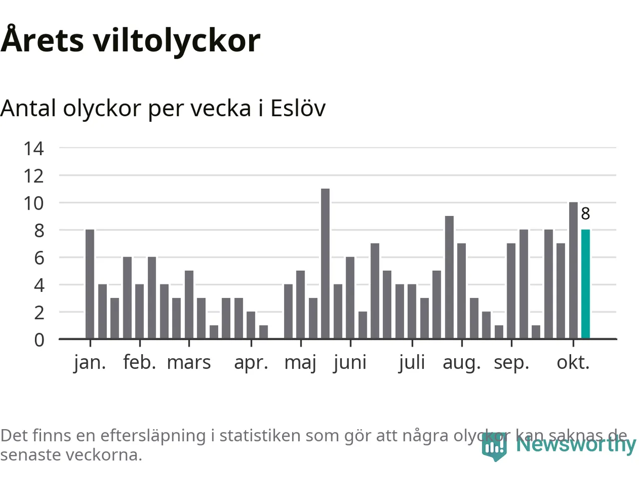 Hittills har åtta viltolyckor rapporterats in i Eslövs kommun från vecka 42. Se listan här.