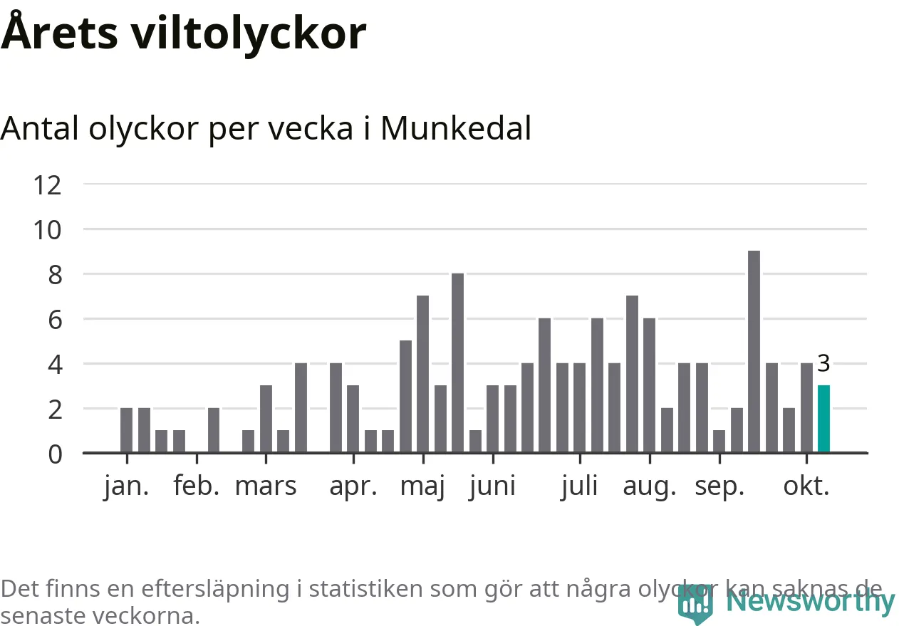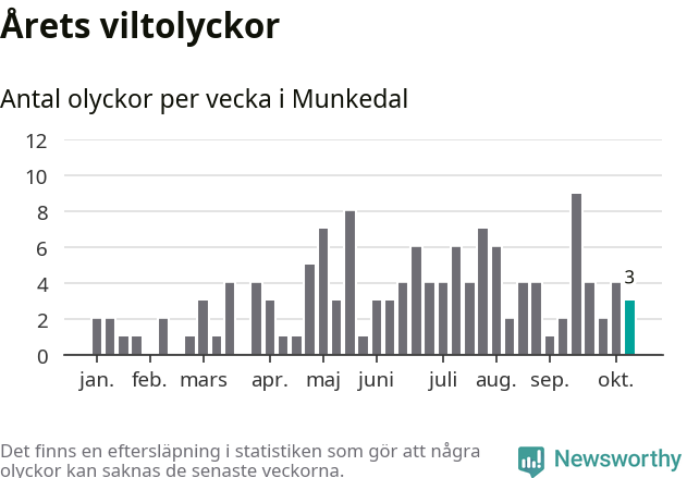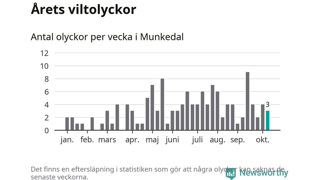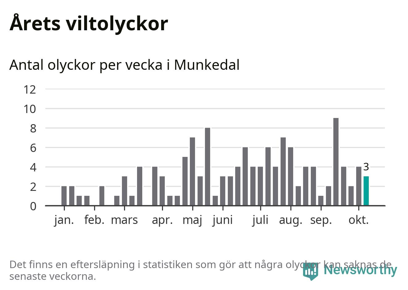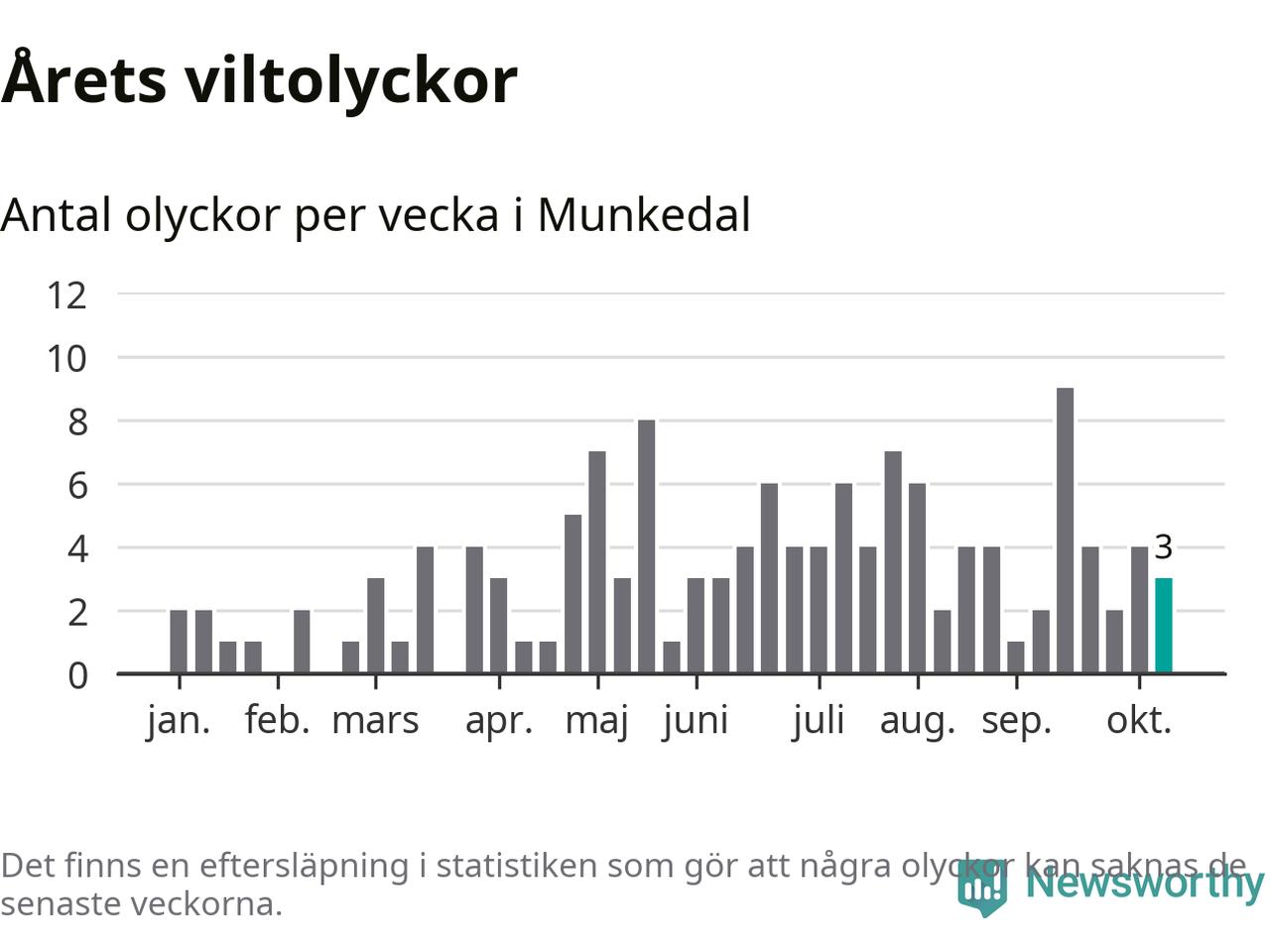 Hittills har tre viltolyckor rapporterats in i Munkedals kommun från vecka 42. Se listan här.