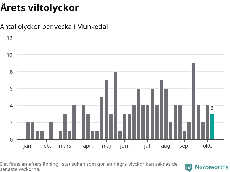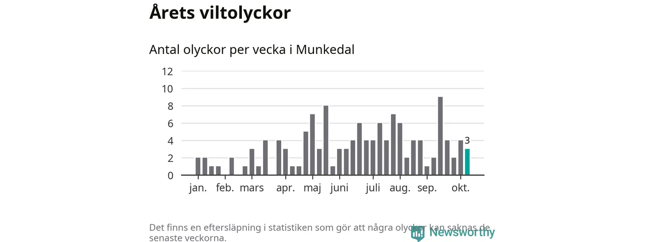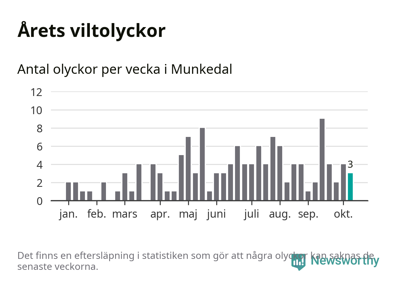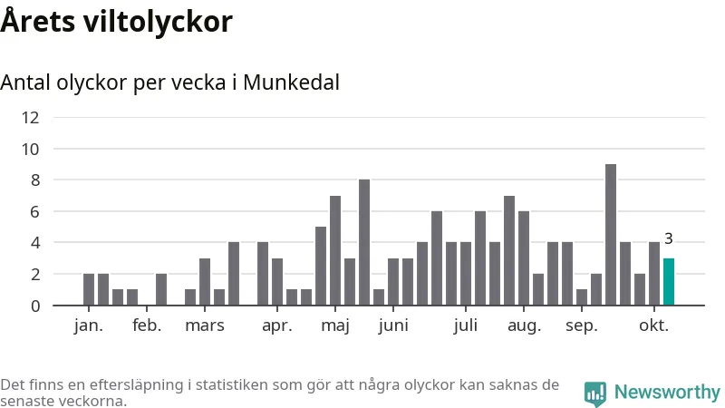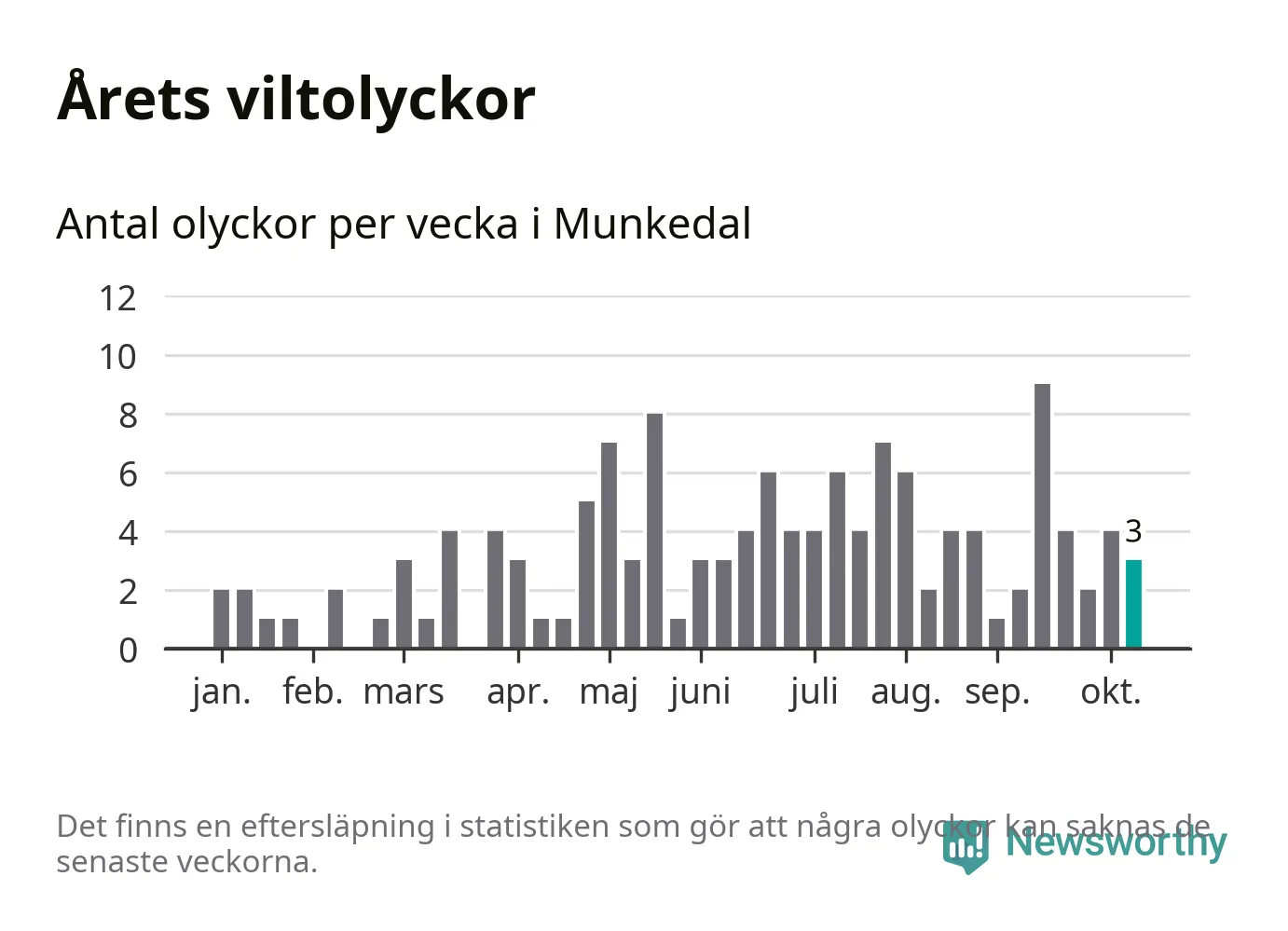 Hittills har tre viltolyckor rapporterats in i Munkedals kommun från vecka 42. Se listan här.