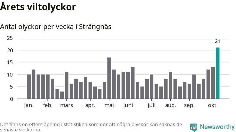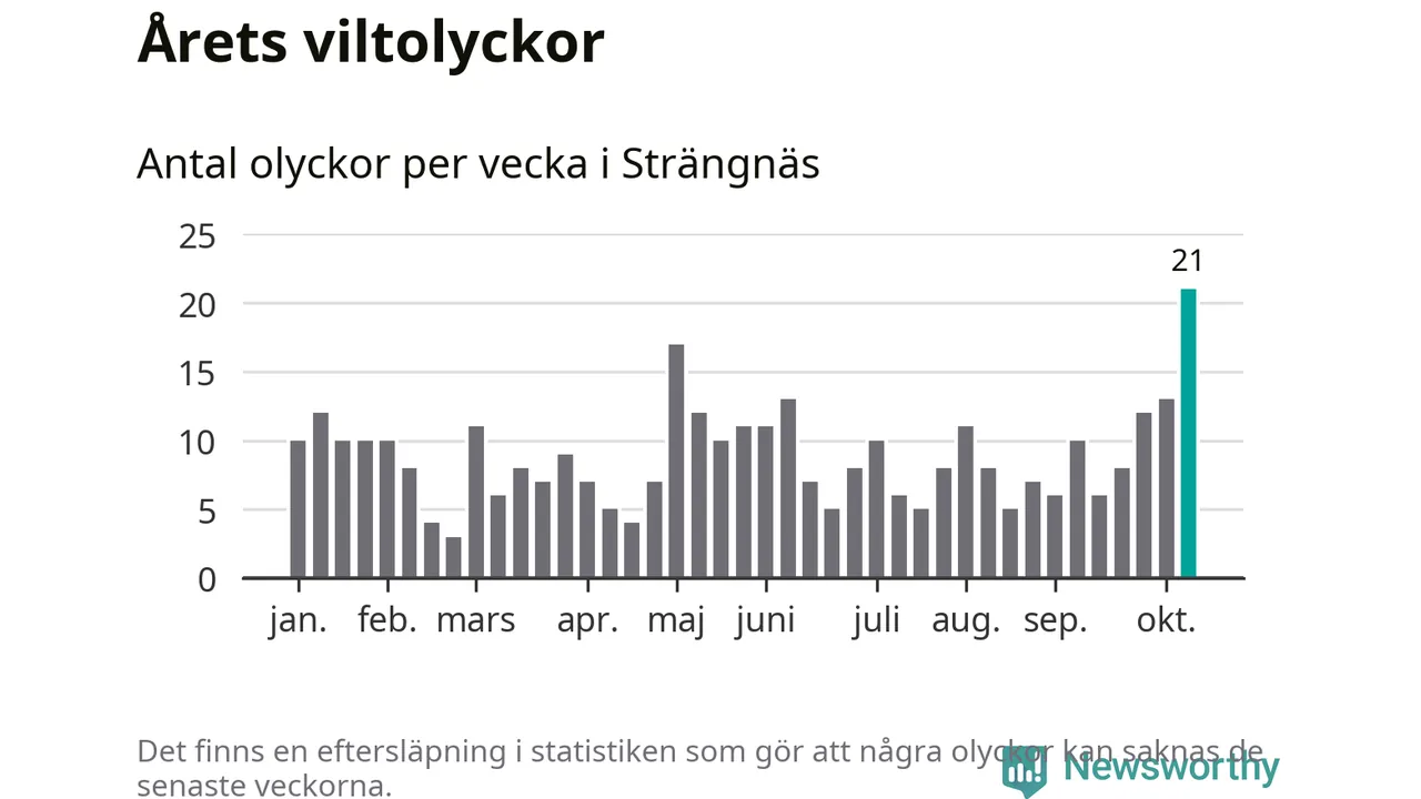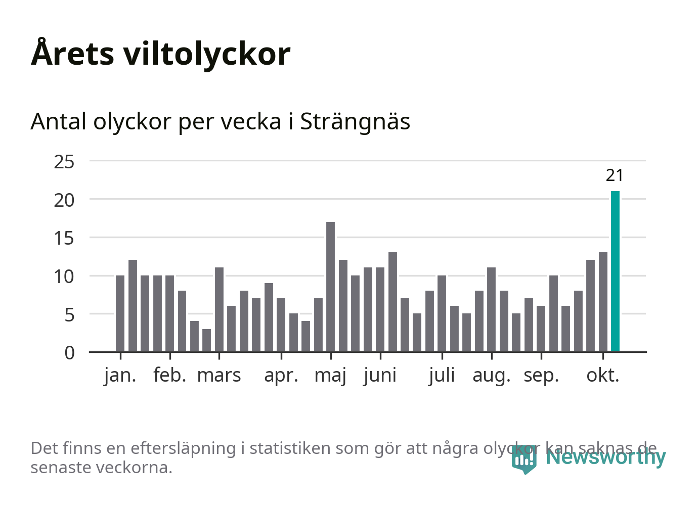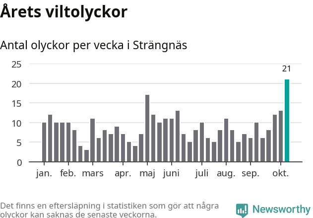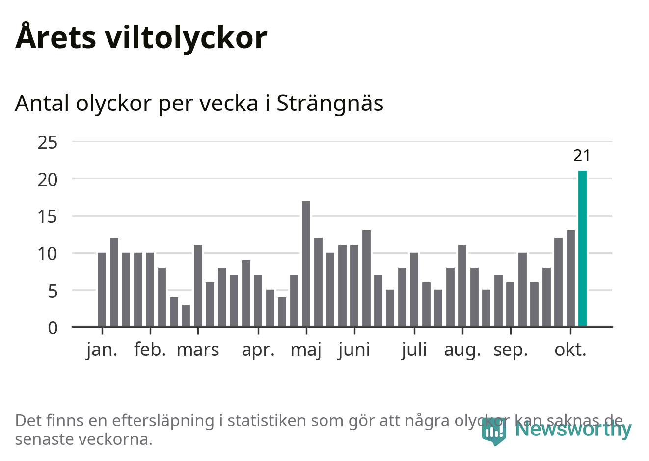Under vecka 42 rapporterades 21 viltolyckor in i Strängnäs kommun. Det är det största antalet på en enskild vecka hittills i år.
