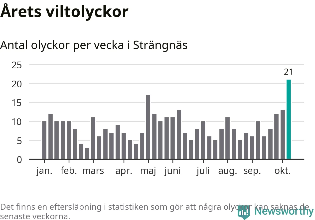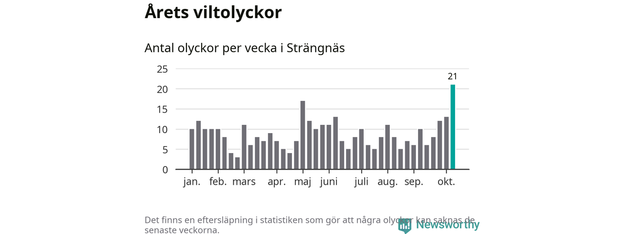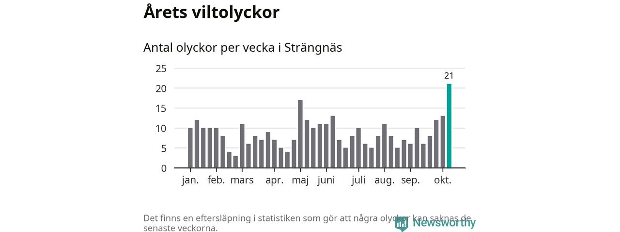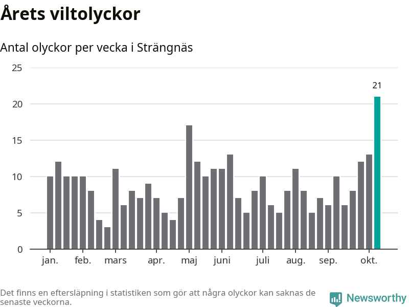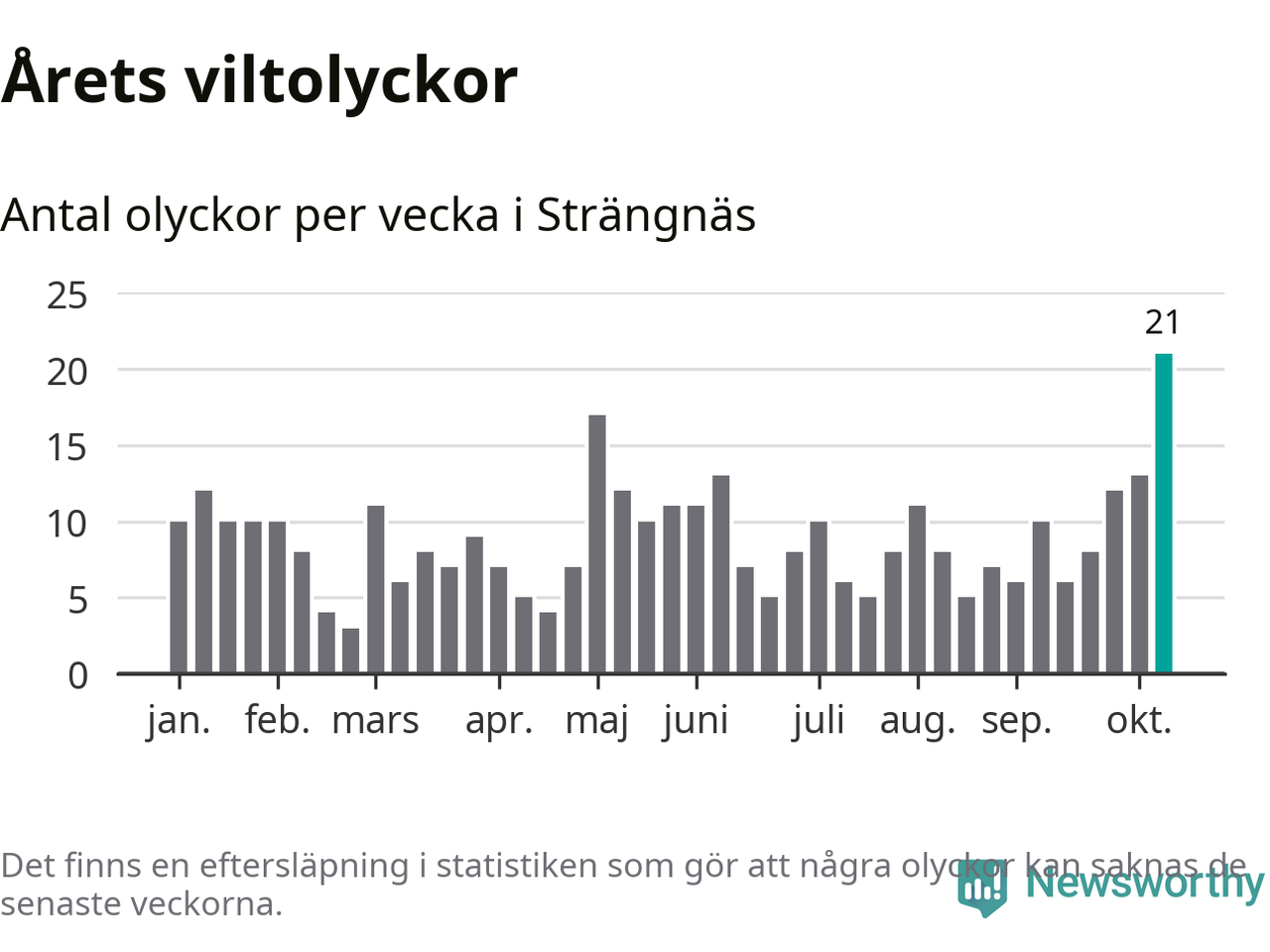 Under vecka 42 rapporterades 21 viltolyckor in i Strängnäs kommun. Det är det största antalet på en enskild vecka hittills i år.