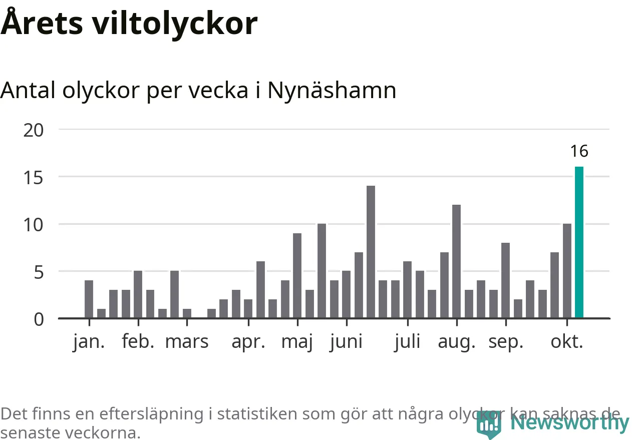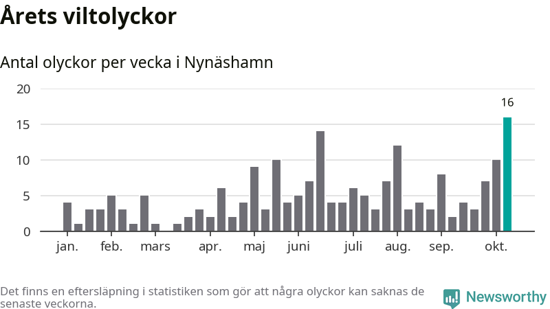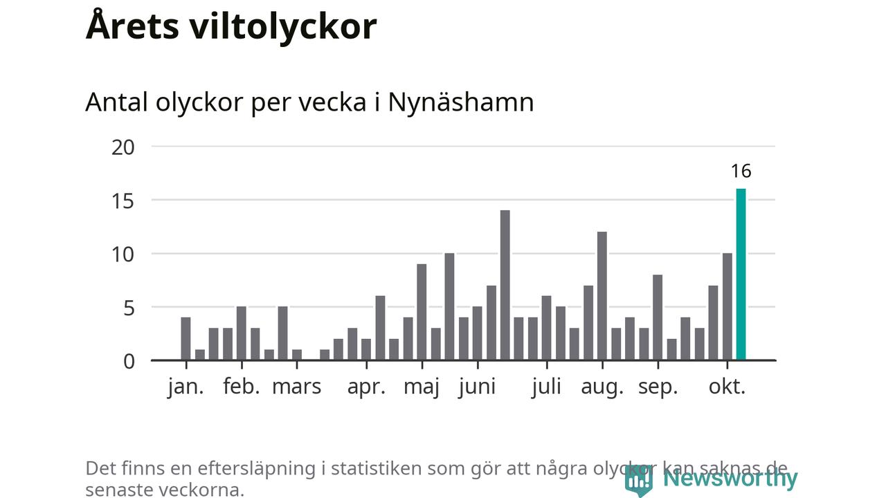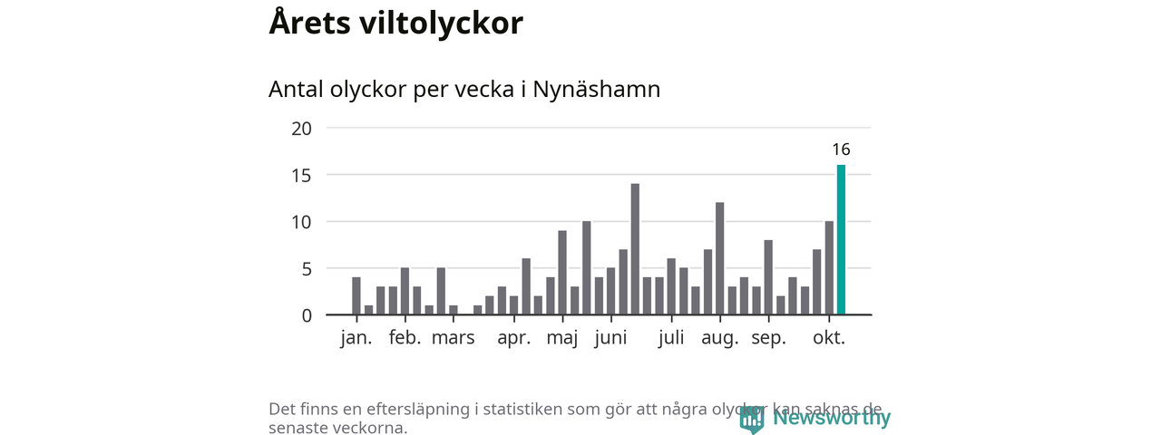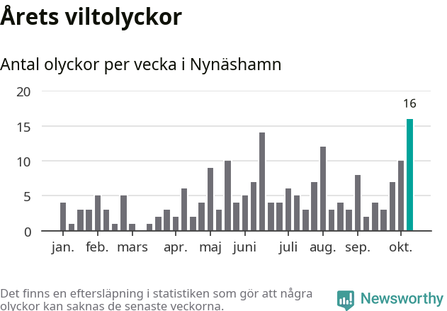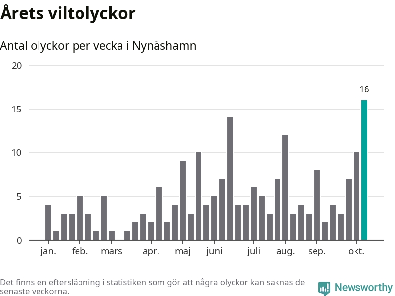 Under vecka 42 rapporterades 16 viltolyckor in i Nynäshamns kommun. Det är det största antalet på en enskild vecka hittills i år.