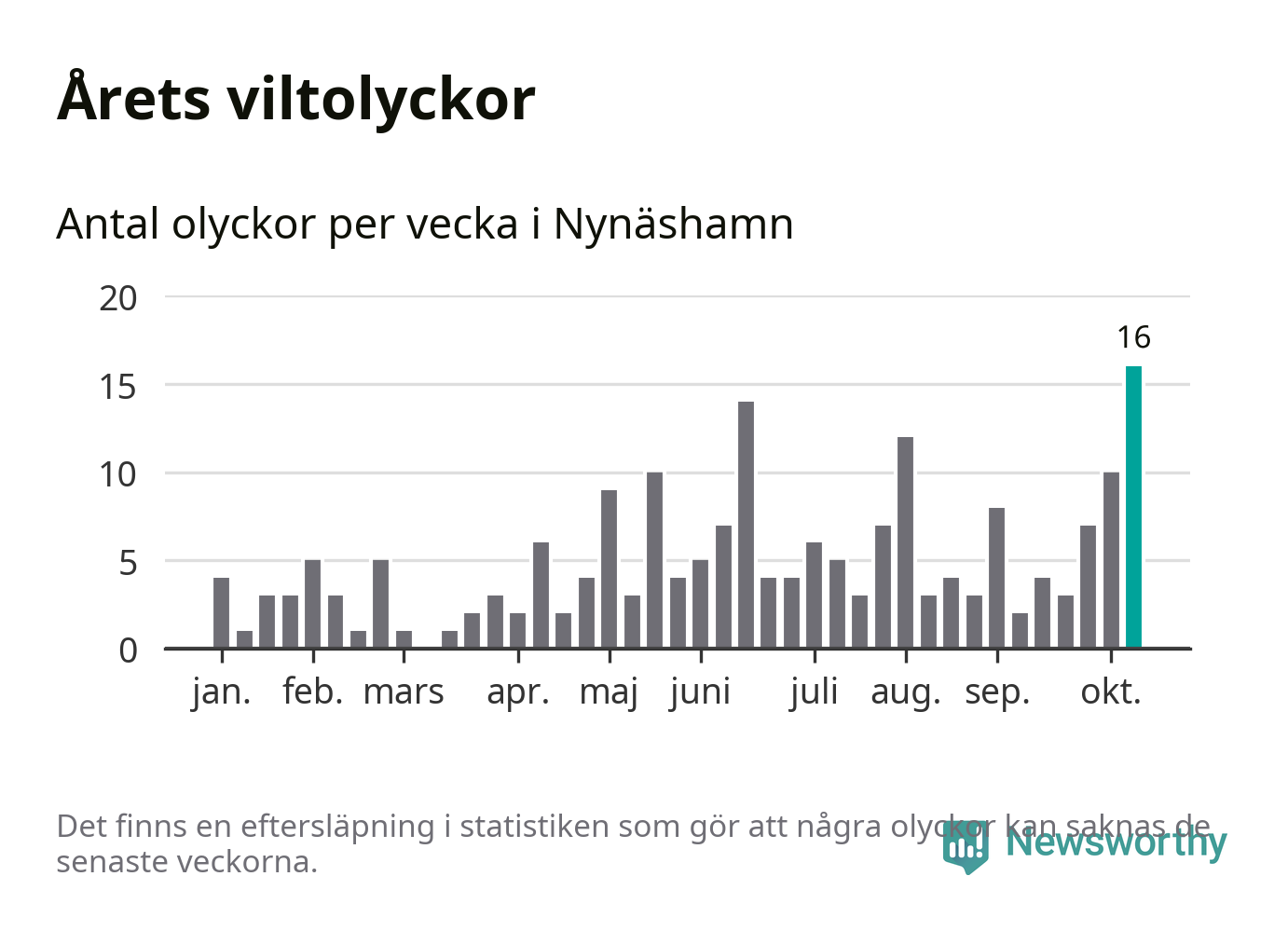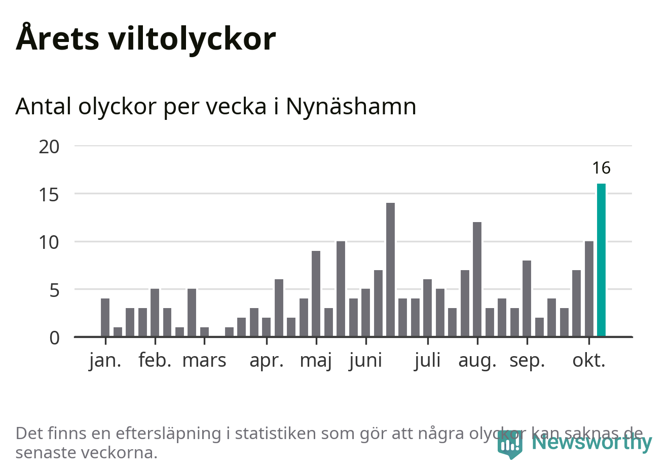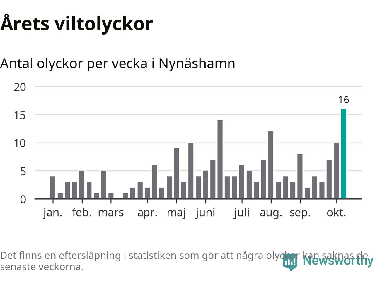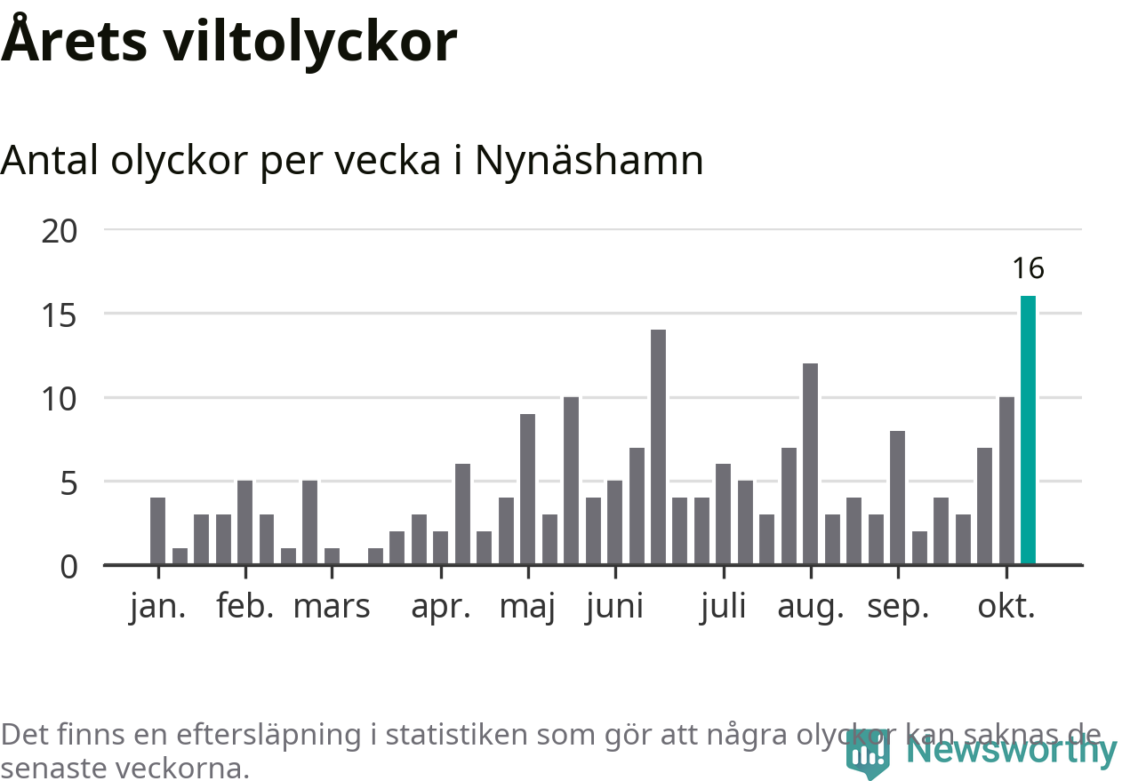 Under vecka 42 rapporterades 16 viltolyckor in i Nynäshamns kommun. Det är det största antalet på en enskild vecka hittills i år.