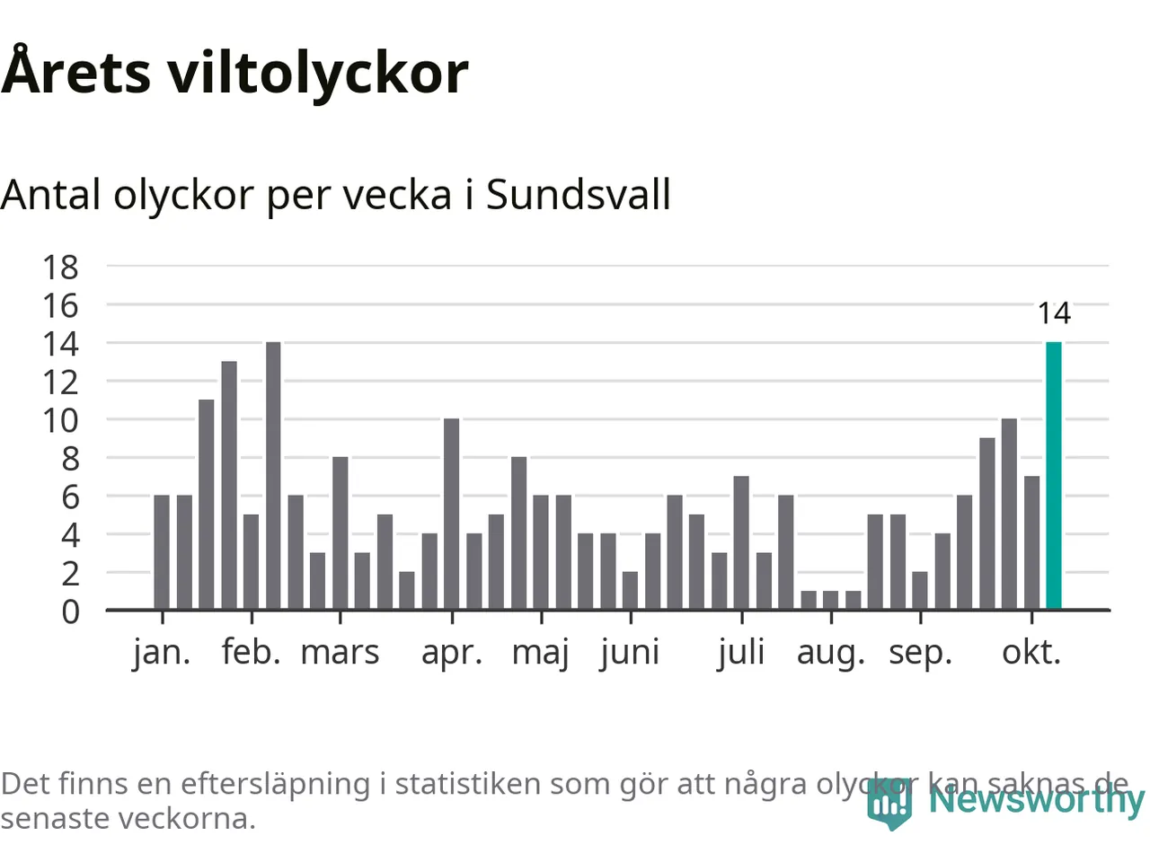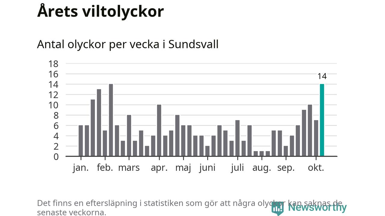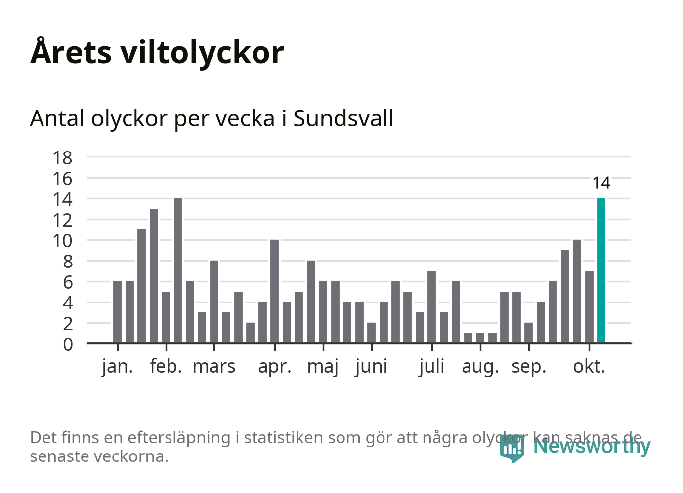Hittills har 14 viltolyckor rapporterats in i Sundsvalls kommun från vecka 42. Se listan här.