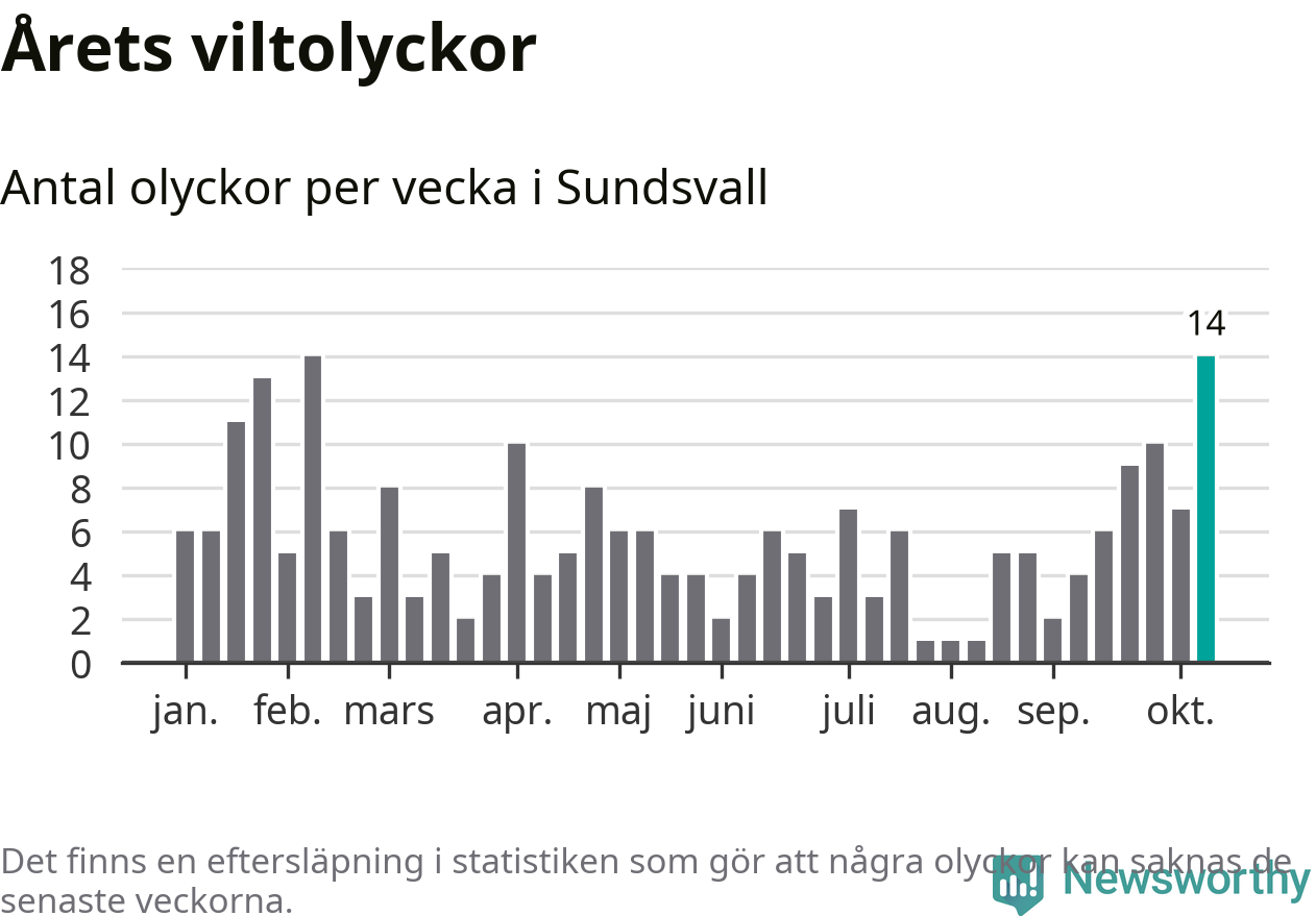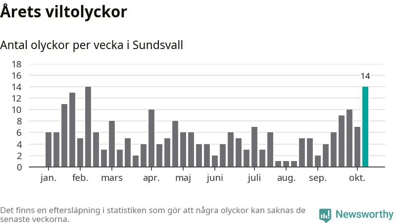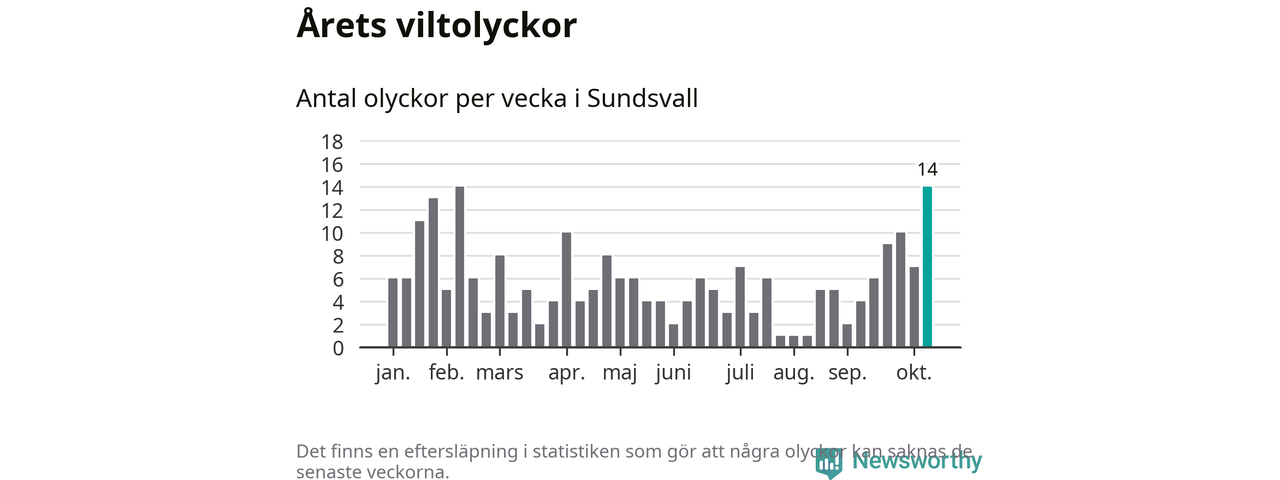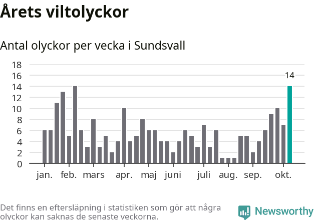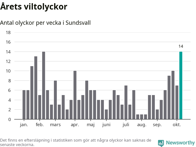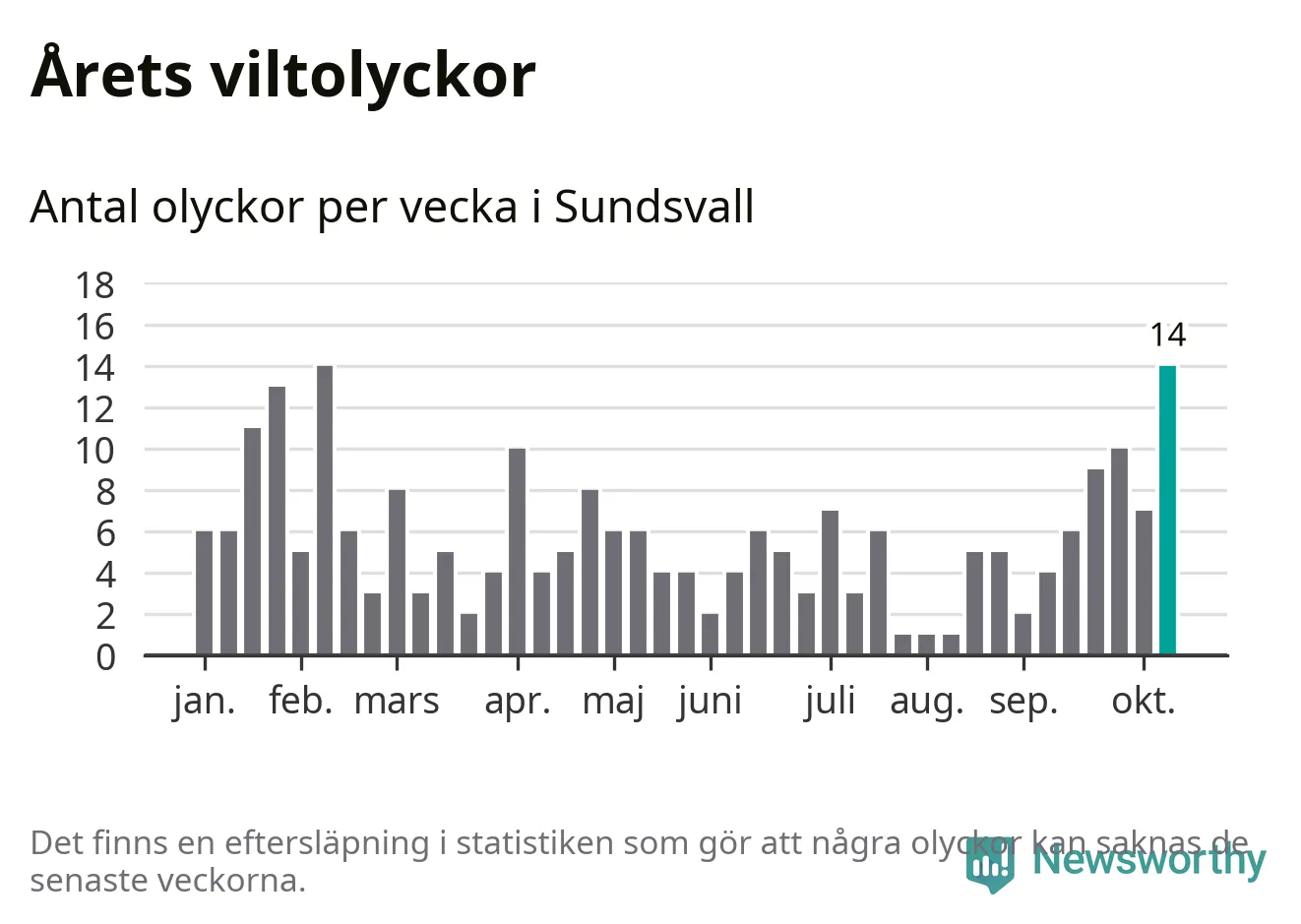 Hittills har 14 viltolyckor rapporterats in i Sundsvalls kommun från vecka 42. Se listan här.