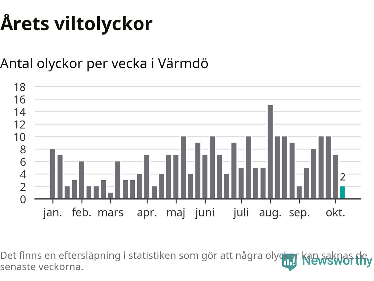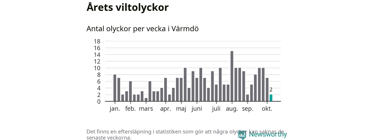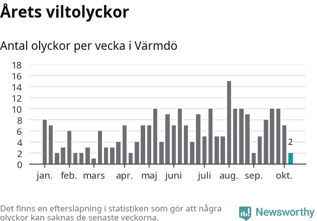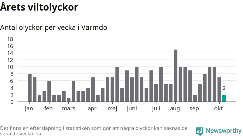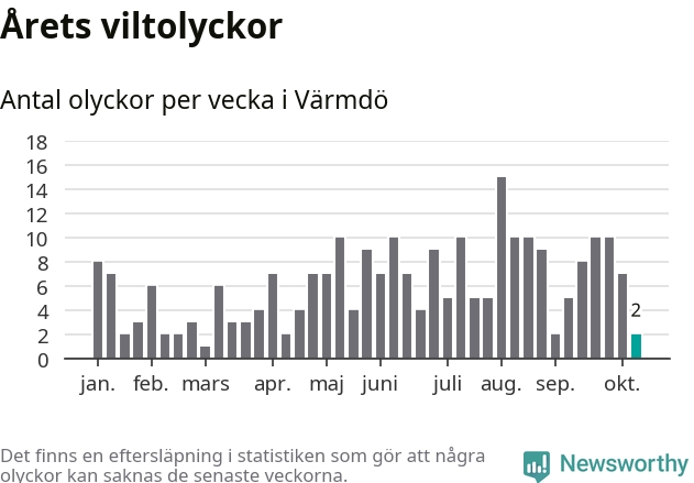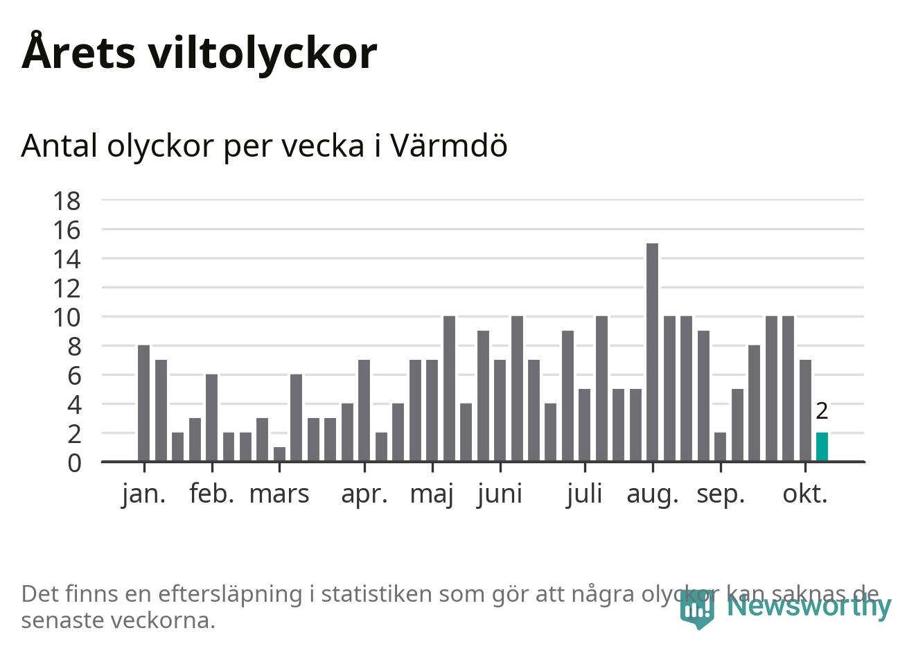 Hittills har två viltolyckor rapporterats in i Värmdö kommun från vecka 42. Se listan här.