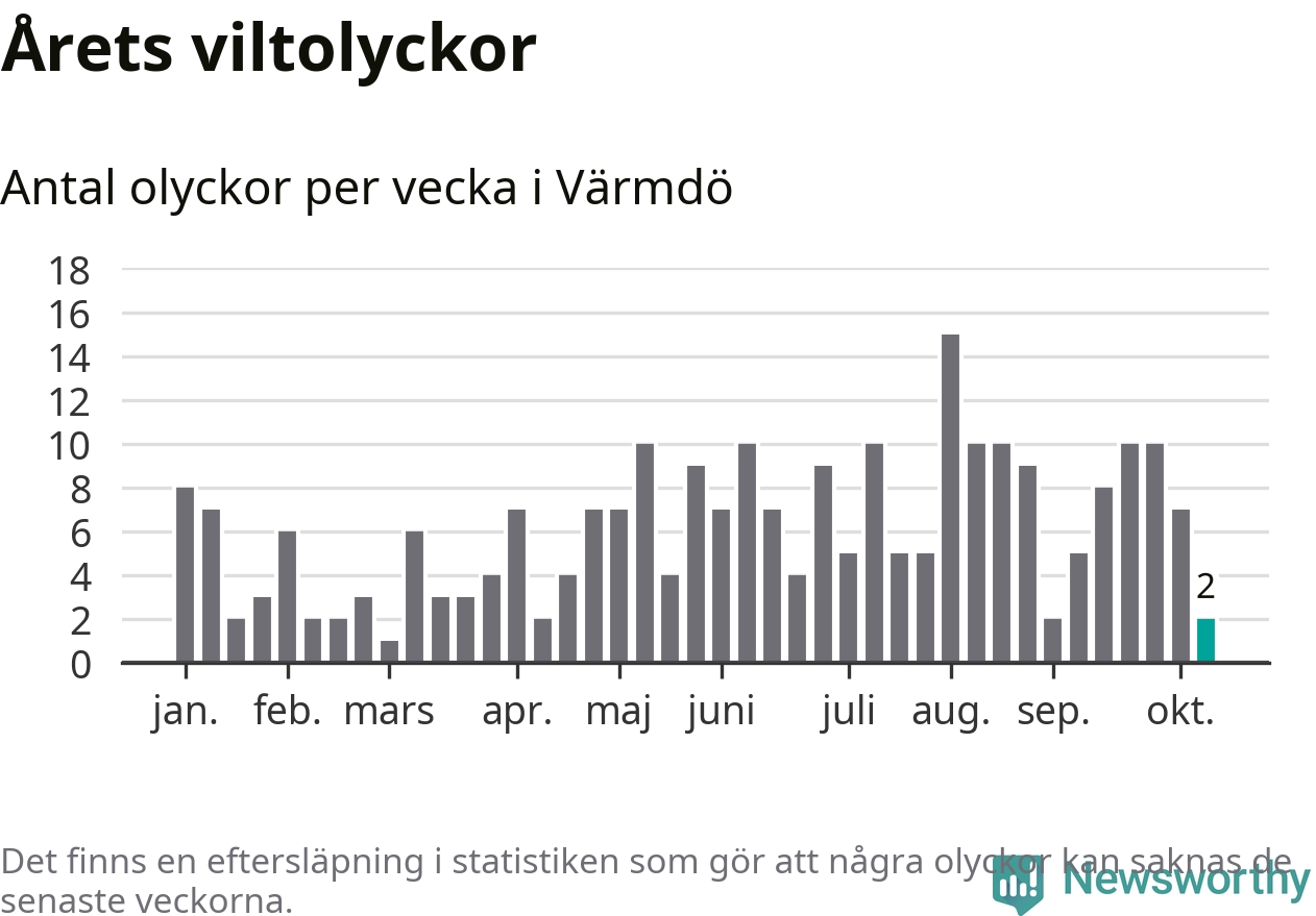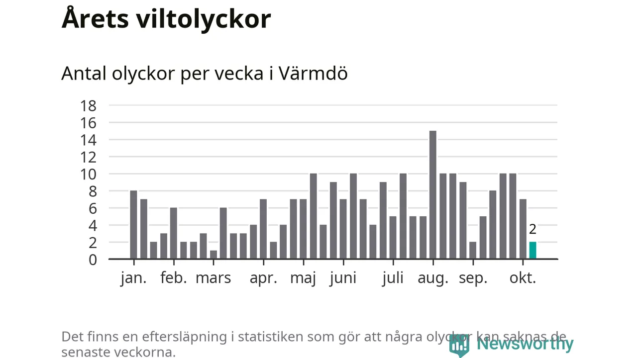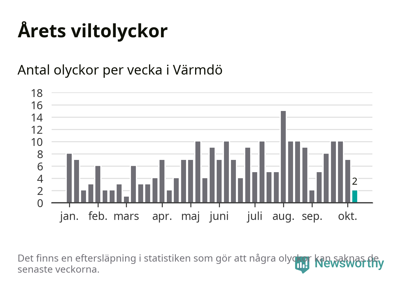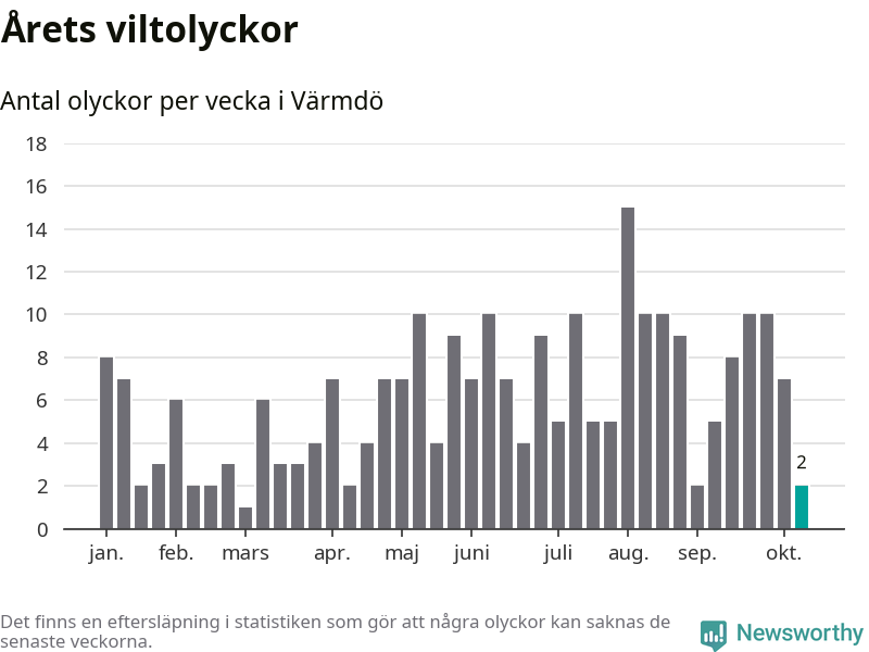 Hittills har två viltolyckor rapporterats in i Värmdö kommun från vecka 42. Se listan här.