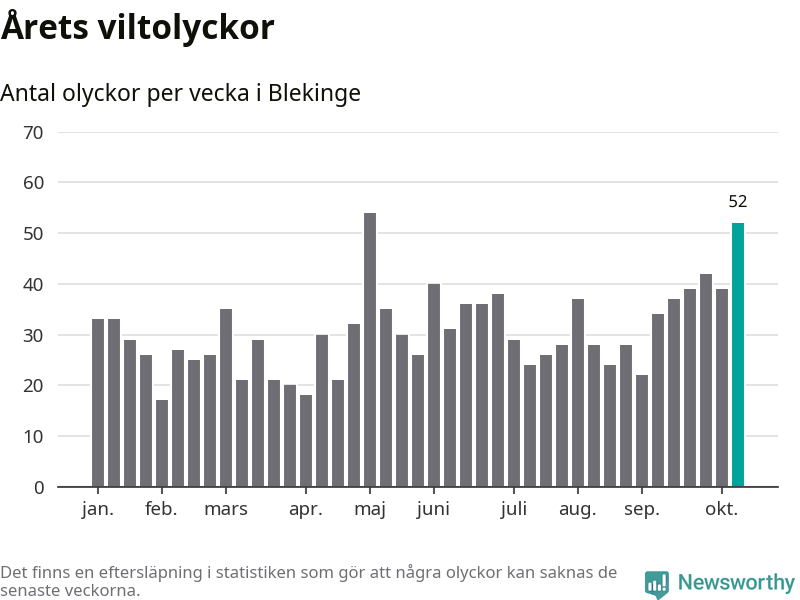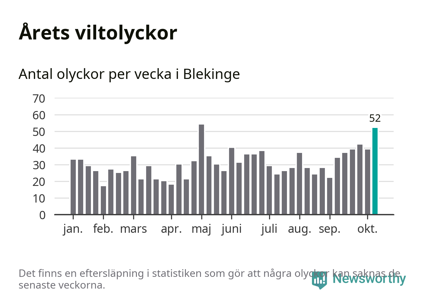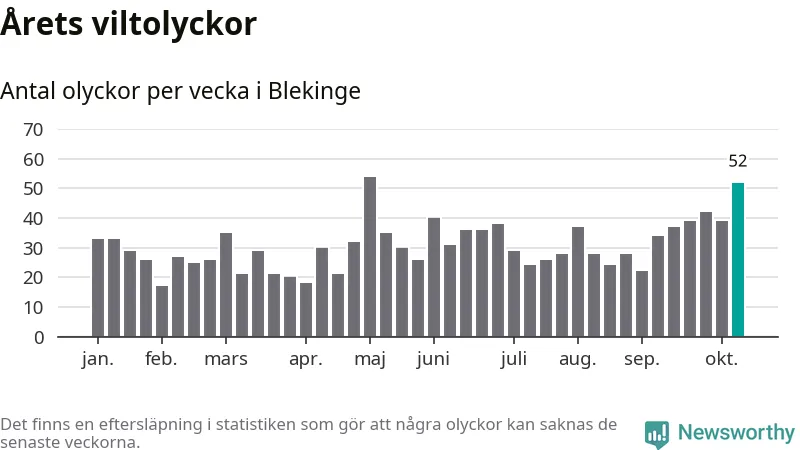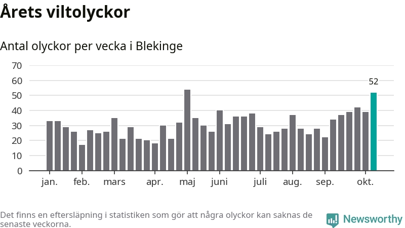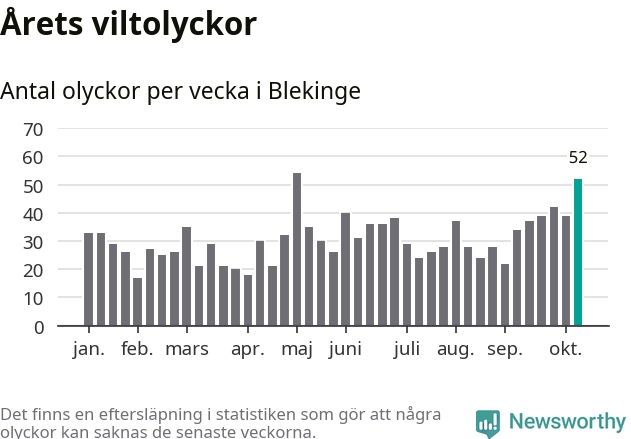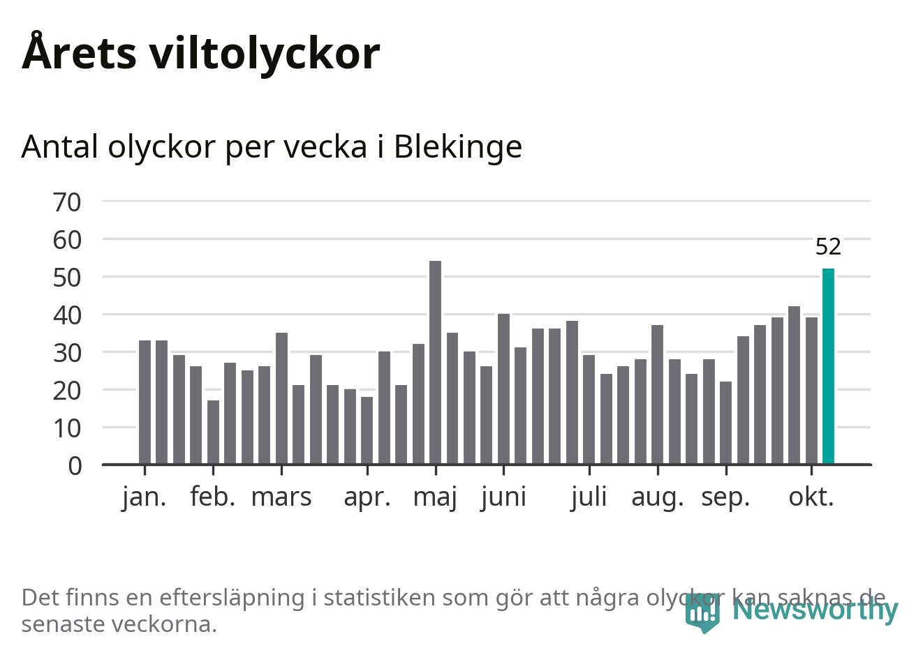 52 olyckor på en enda vecka är däremot ovanligt många. Bara elva gånger tidigare sedan 2015 har det skett så många viltolyckor på en vecka i Blekinge län.
