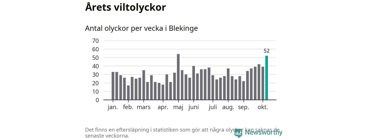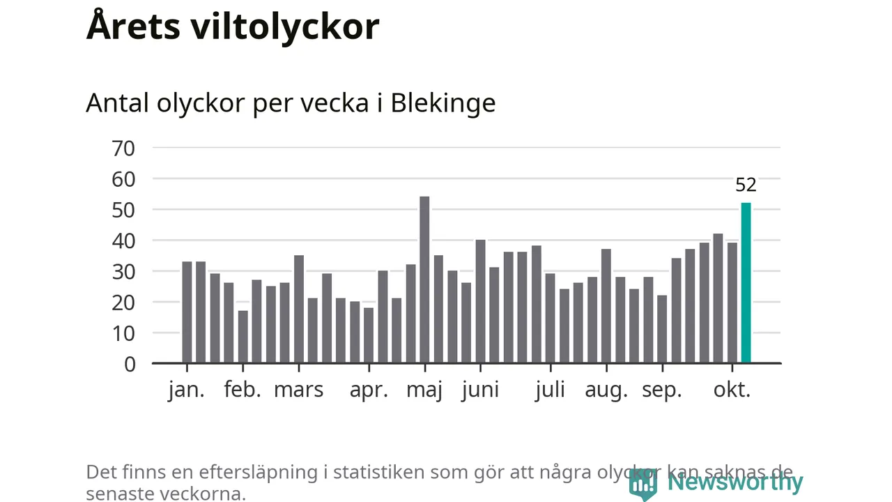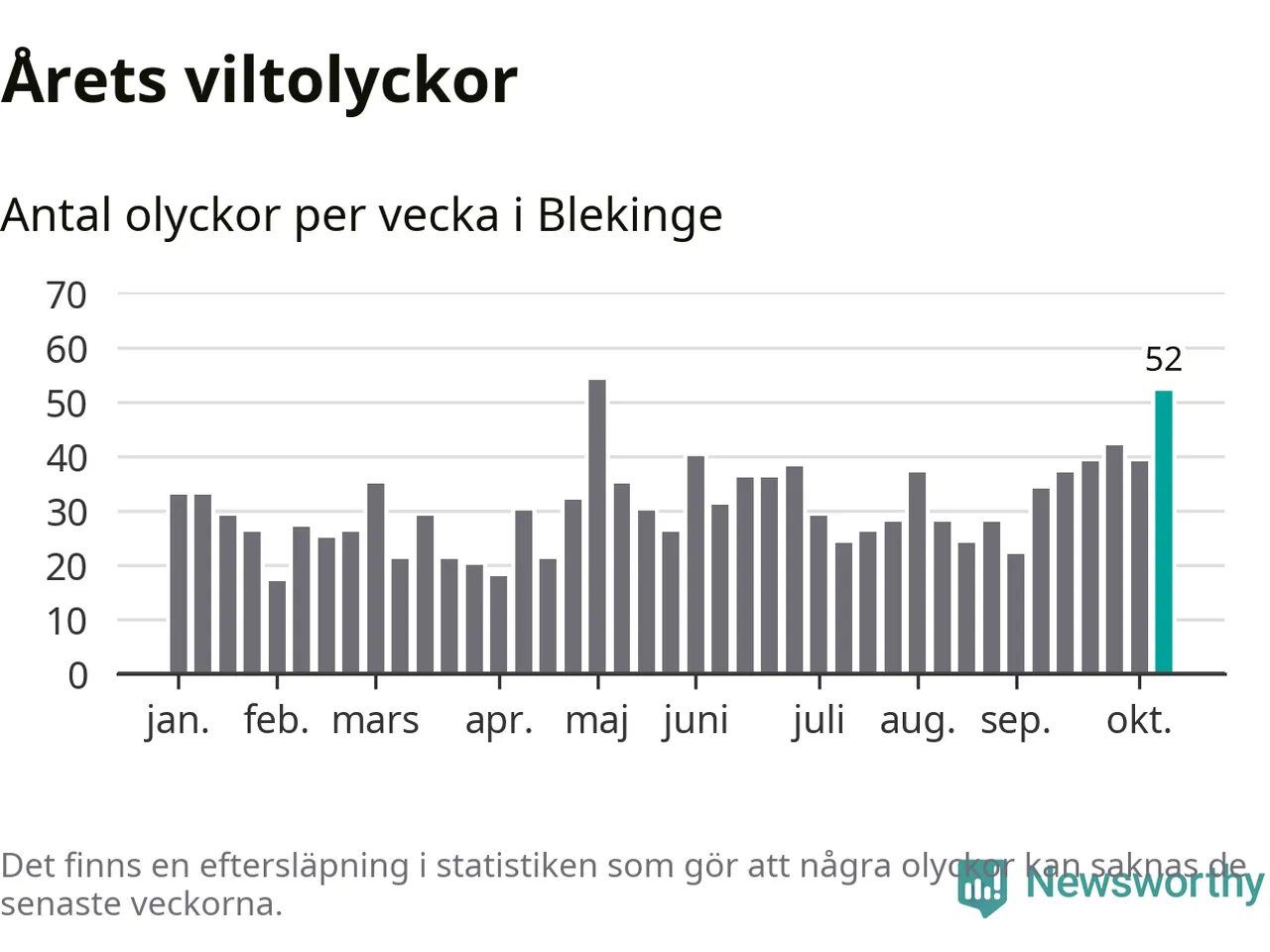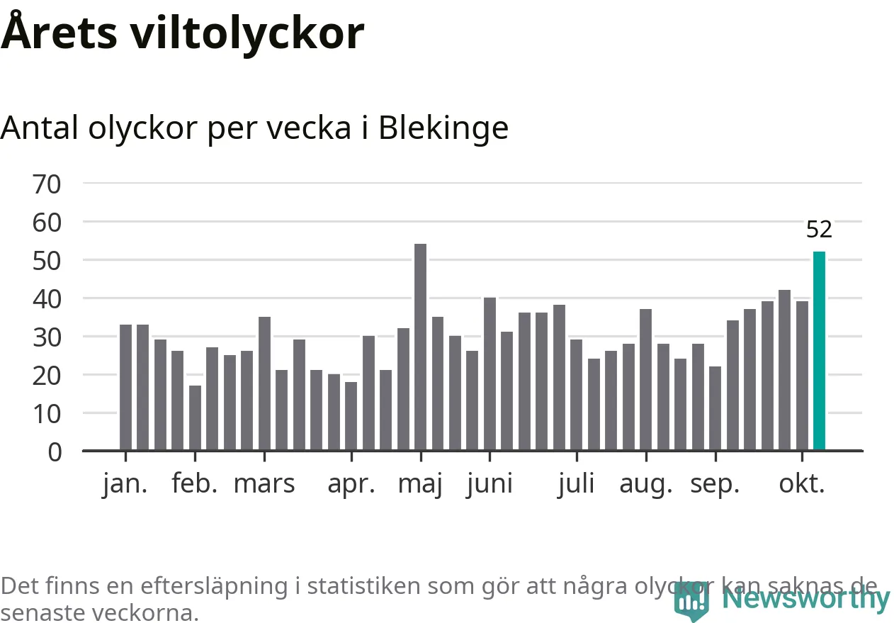 52 olyckor på en enda vecka är däremot ovanligt många. Bara elva gånger tidigare sedan 2015 har det skett så många viltolyckor på en vecka i Blekinge län.