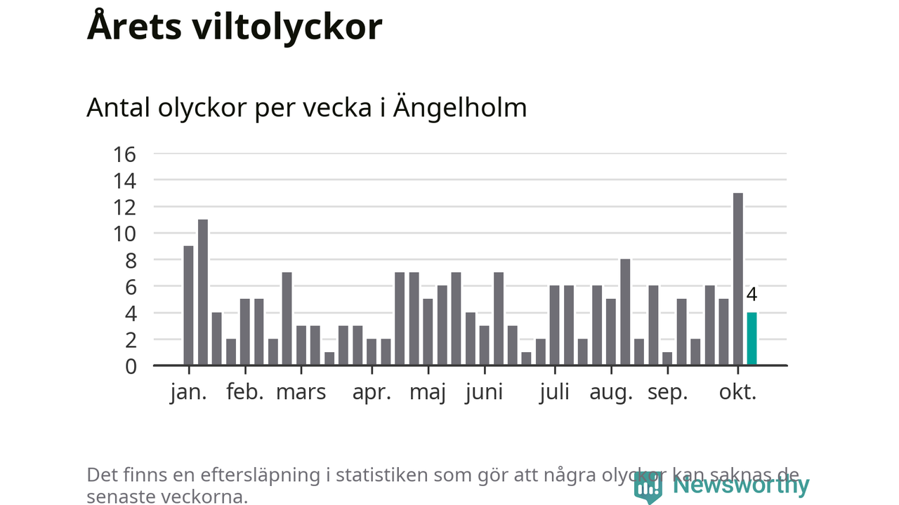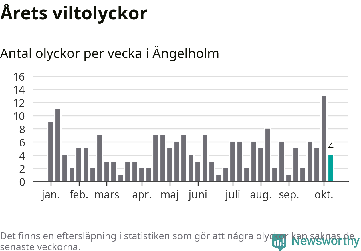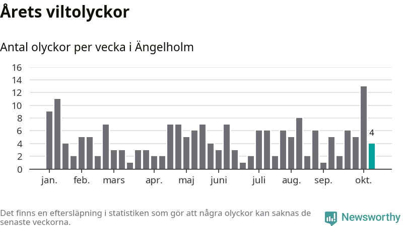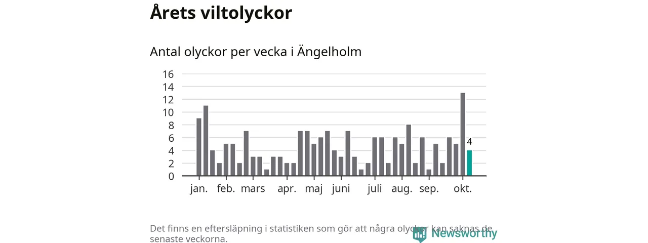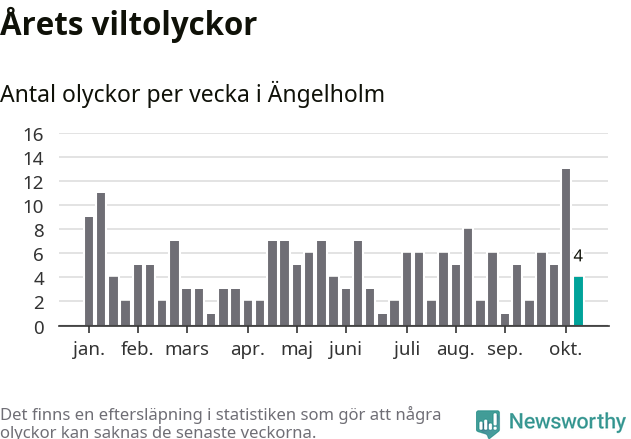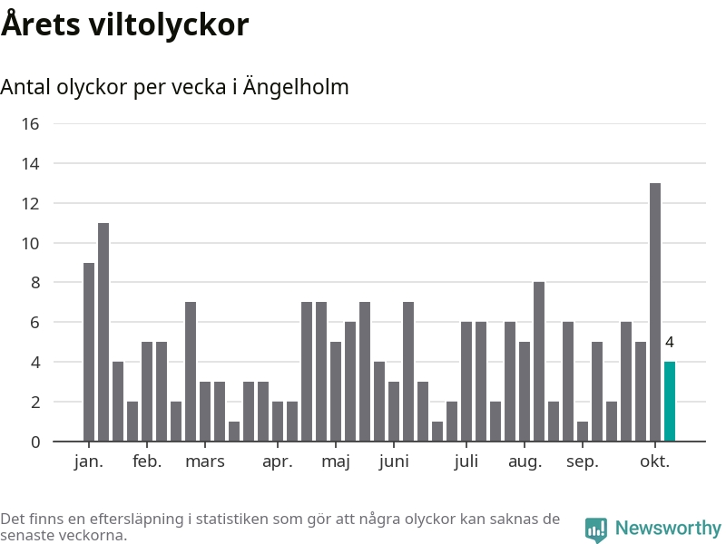 Hittills har fyra viltolyckor rapporterats in i Ängelholms kommun från vecka 42. Se listan här.