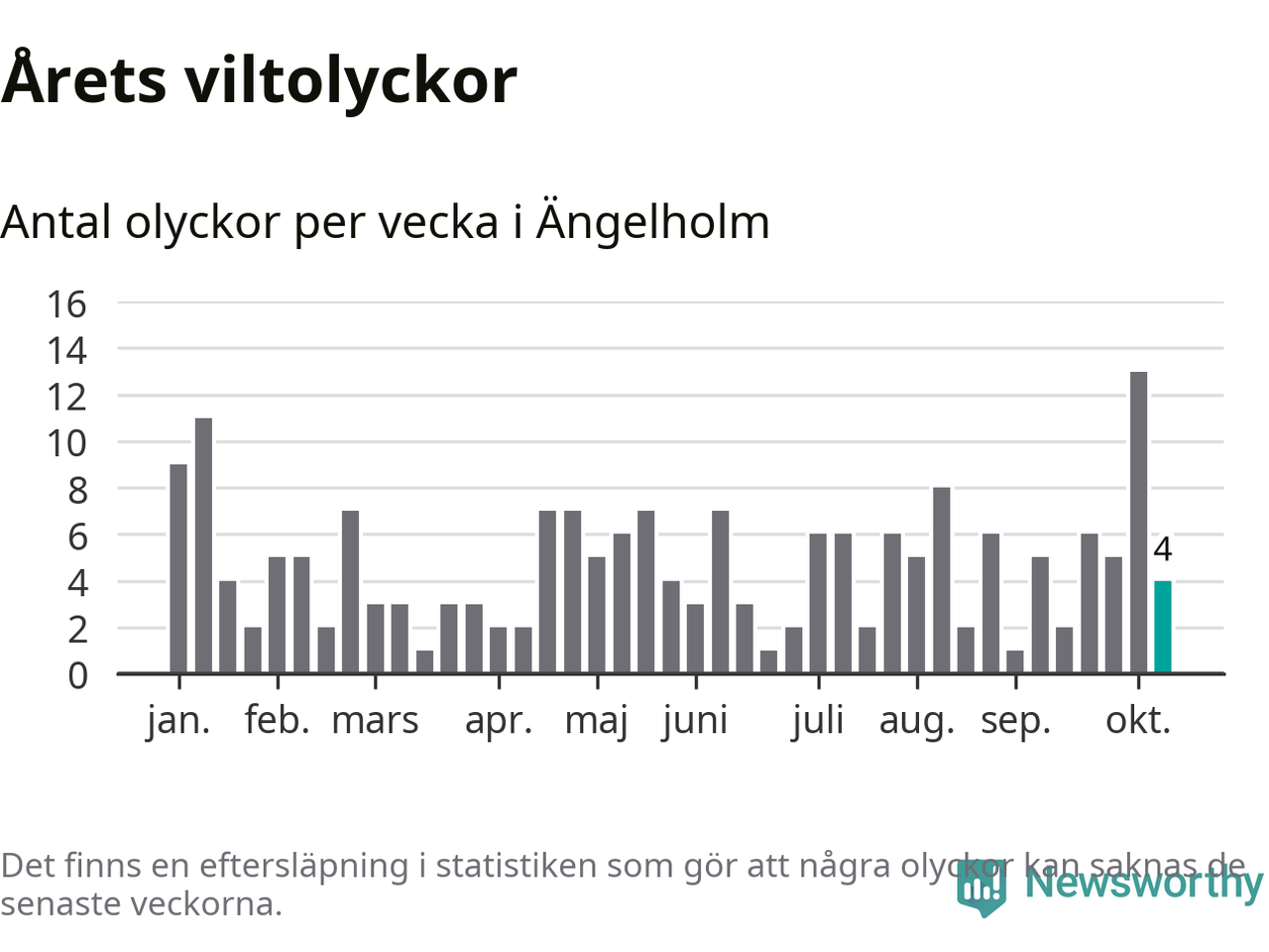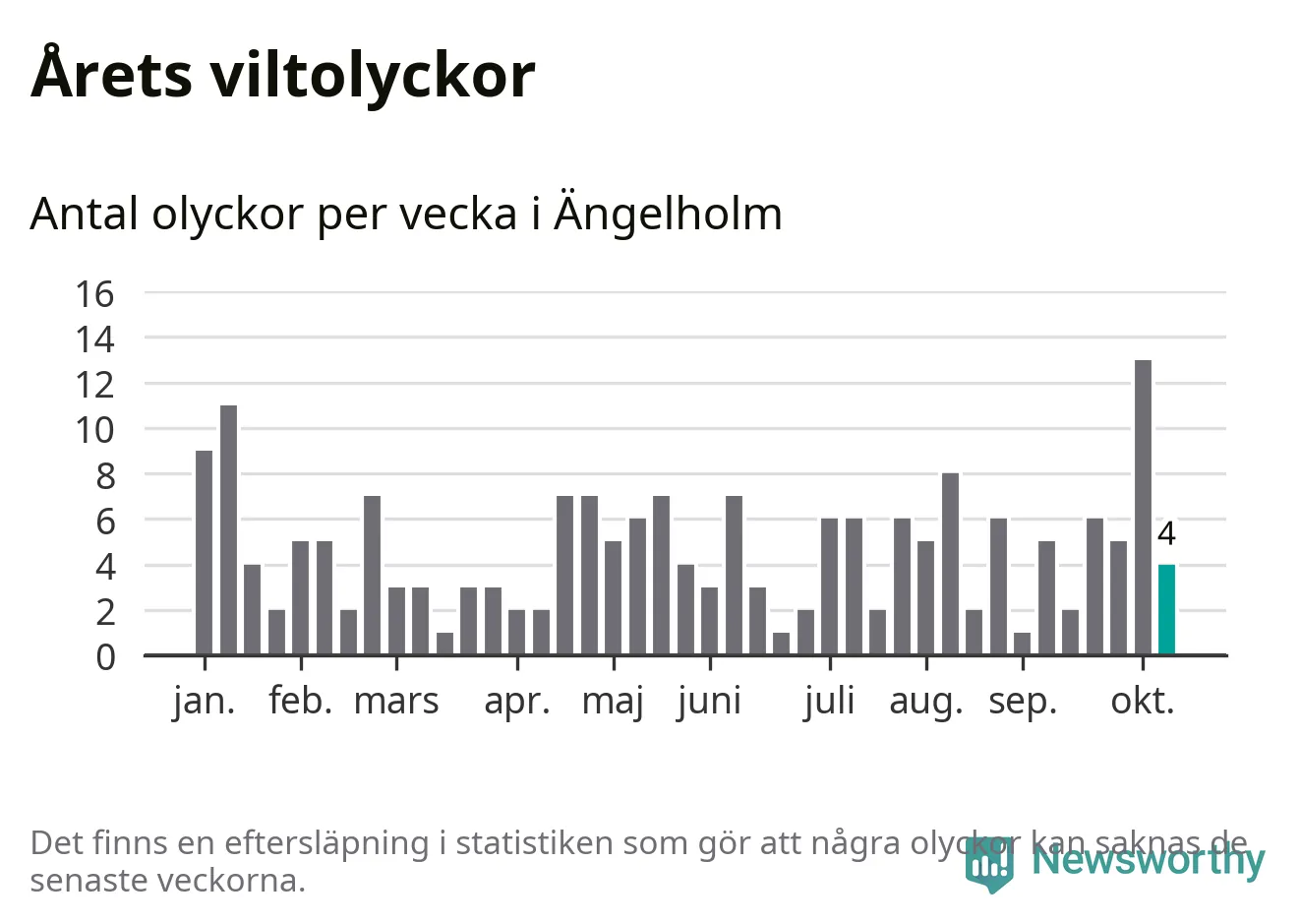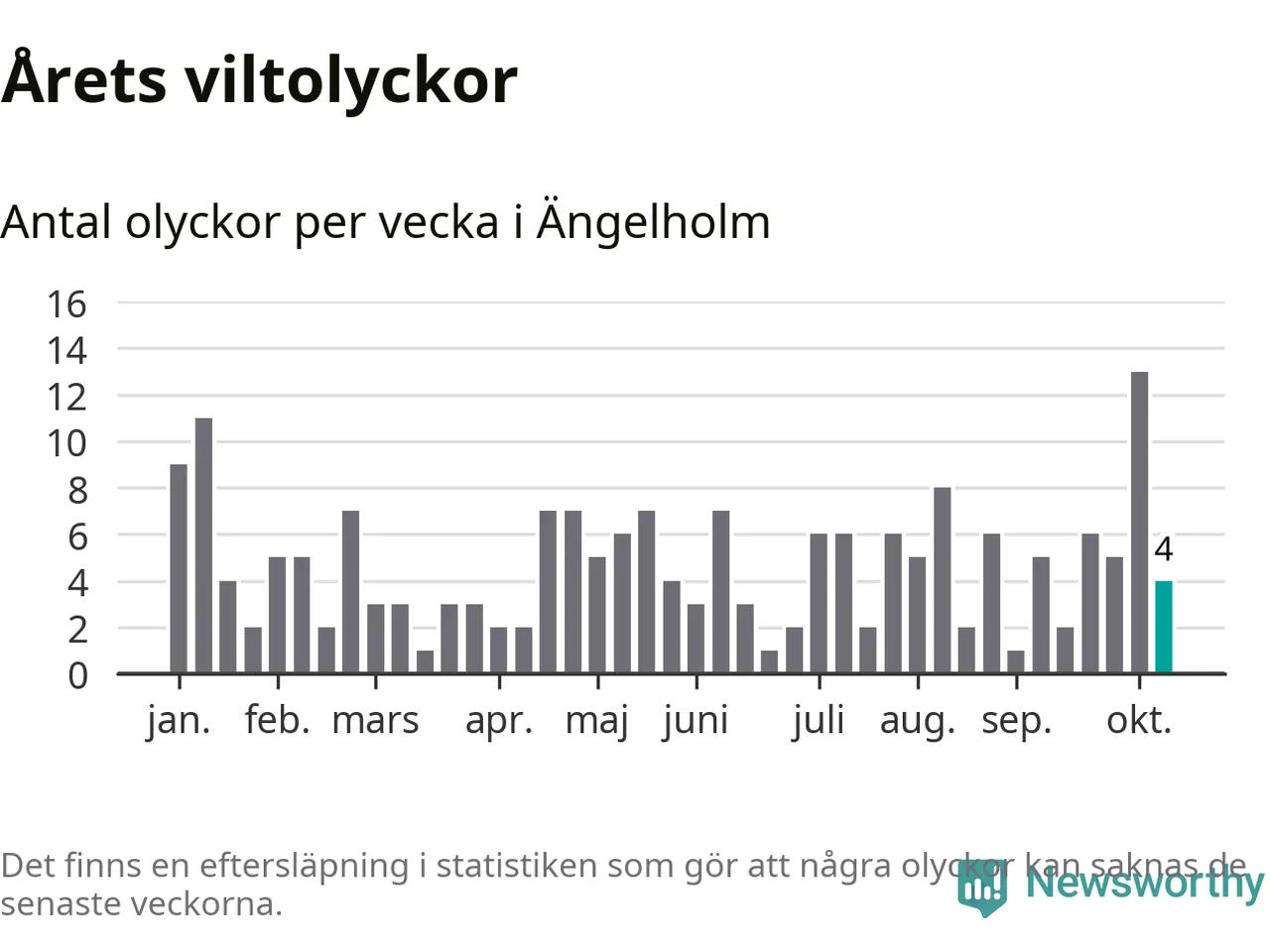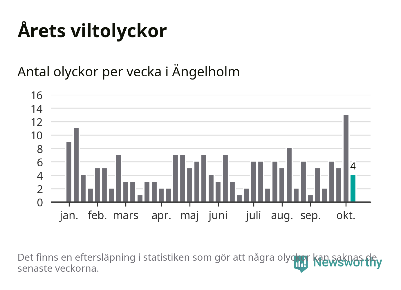 Hittills har fyra viltolyckor rapporterats in i Ängelholms kommun från vecka 42. Se listan här.