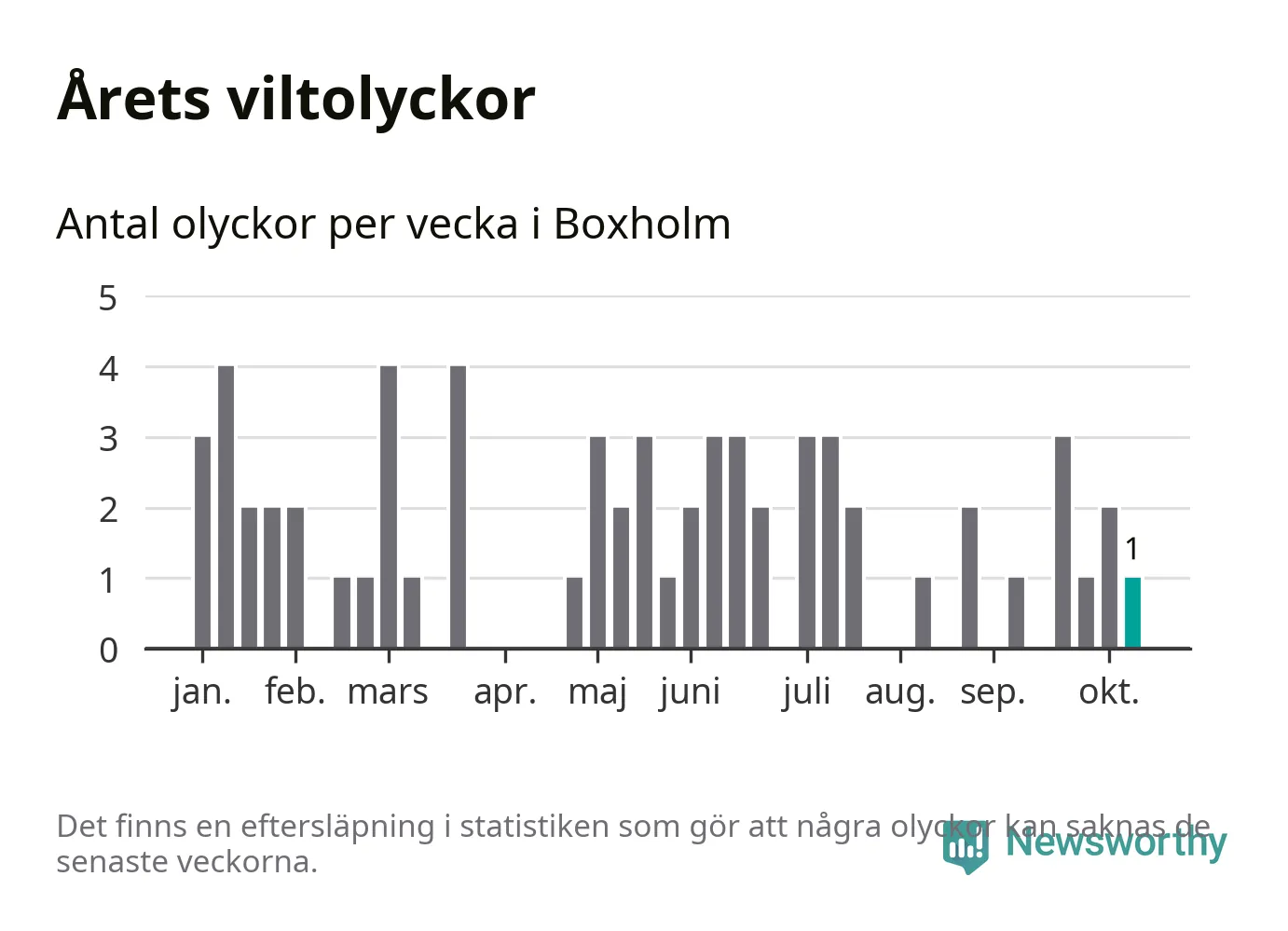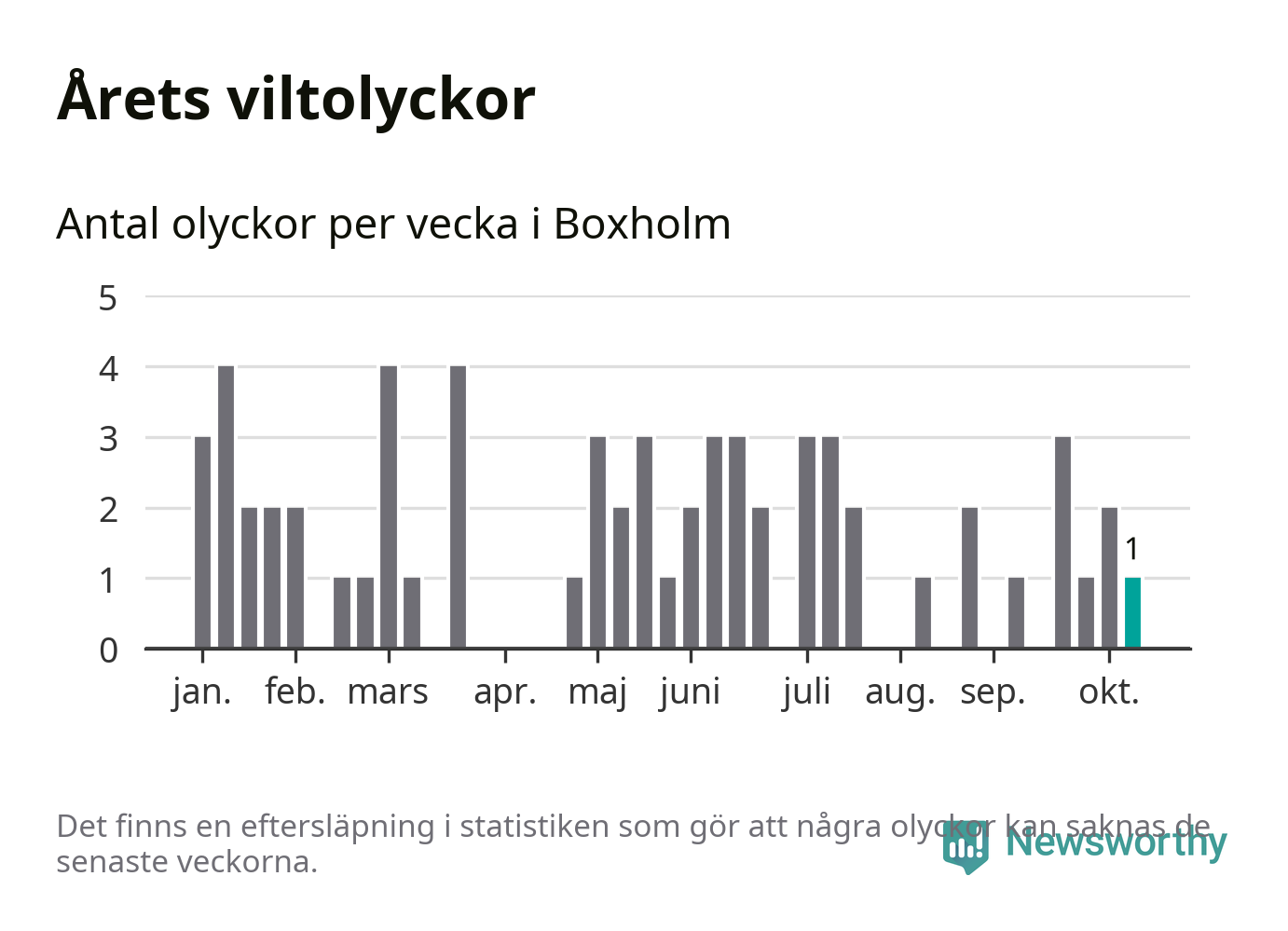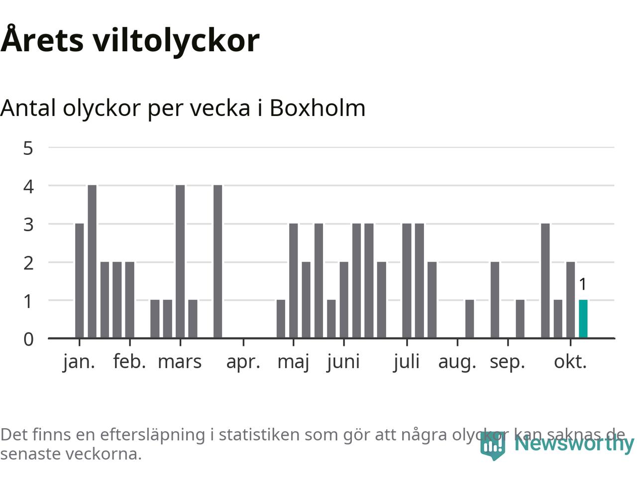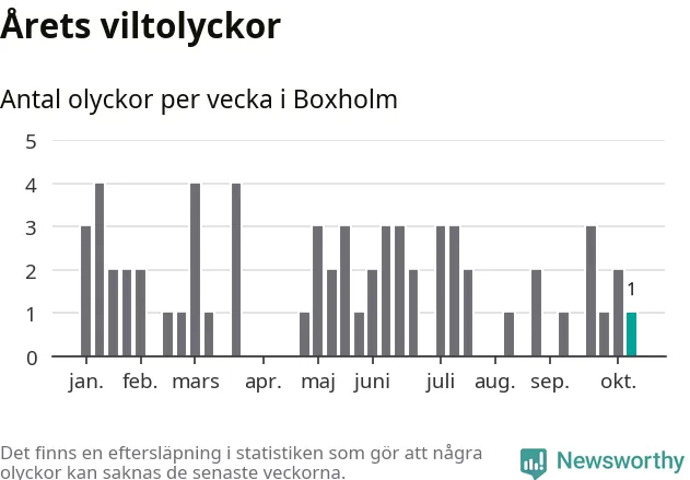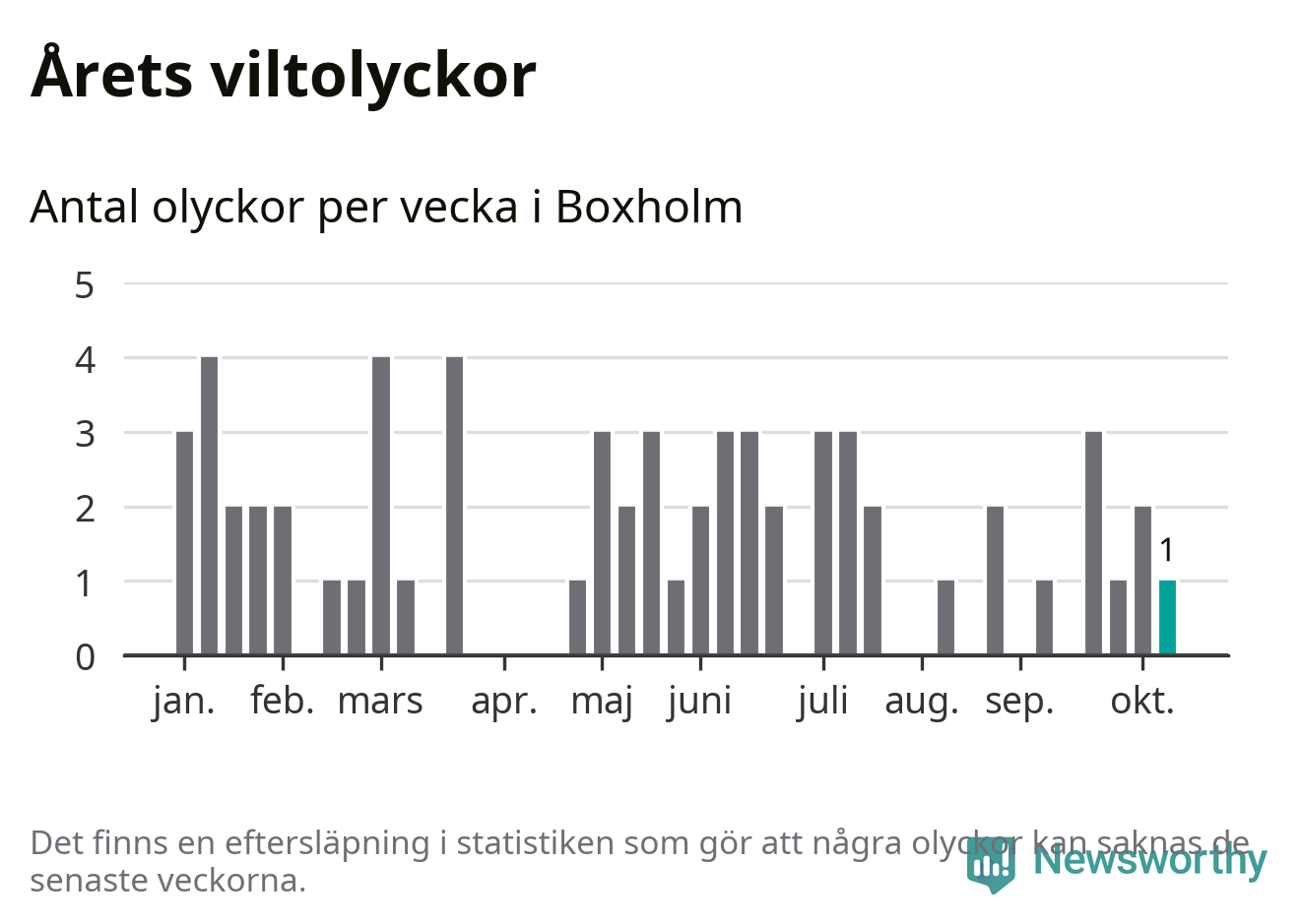 Från förra veckan (vecka 42) har hittills en viltolycka rapporterats in i Boxholms kommun.