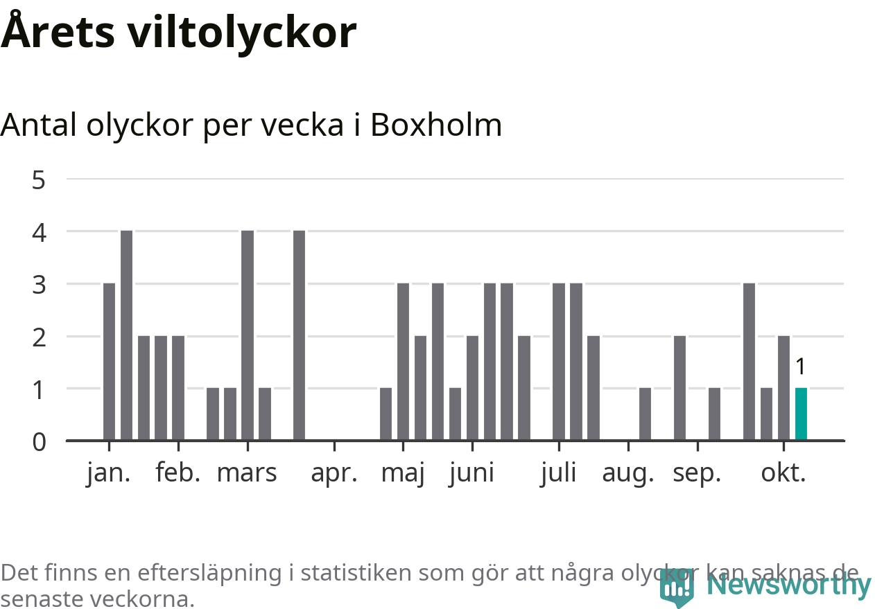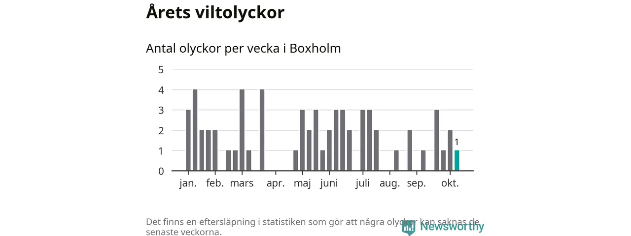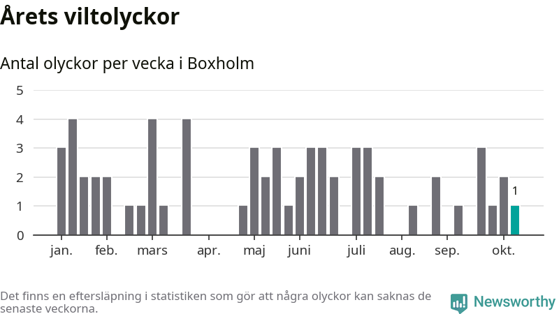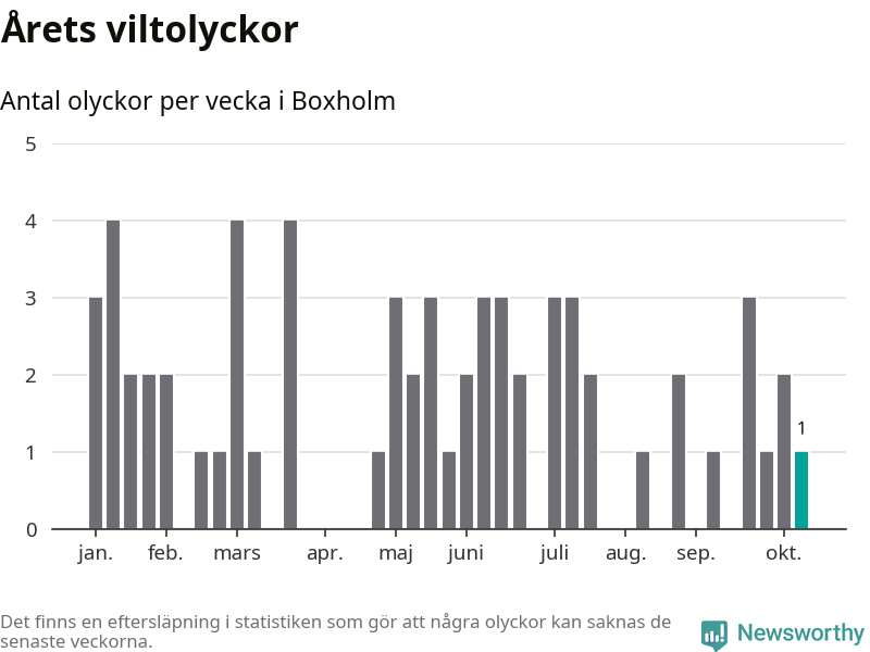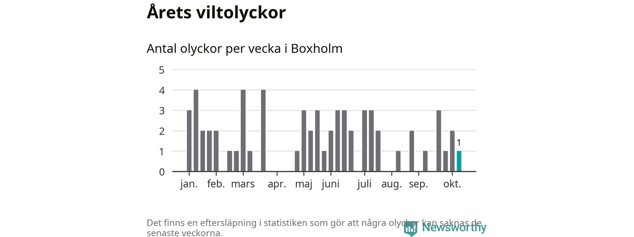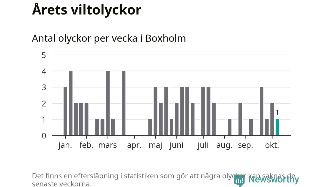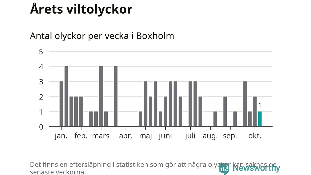 Från förra veckan (vecka 42) har hittills en viltolycka rapporterats in i Boxholms kommun.