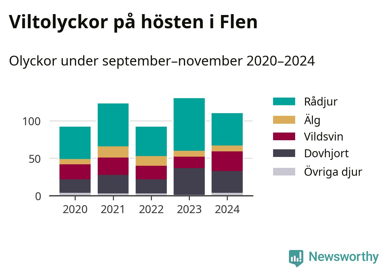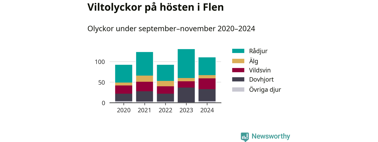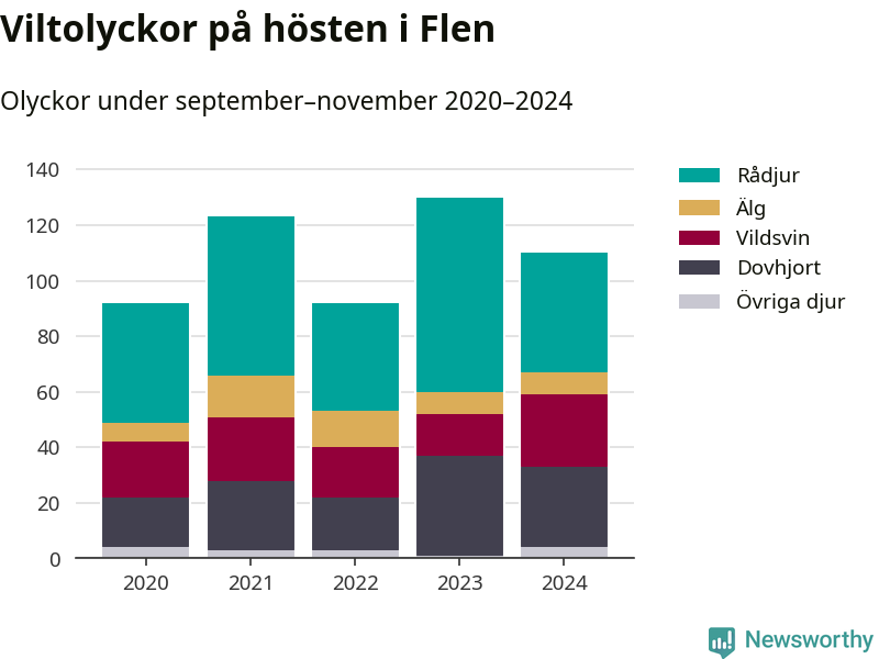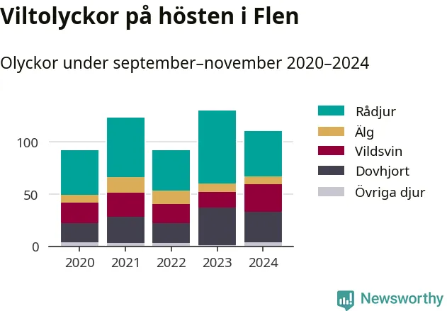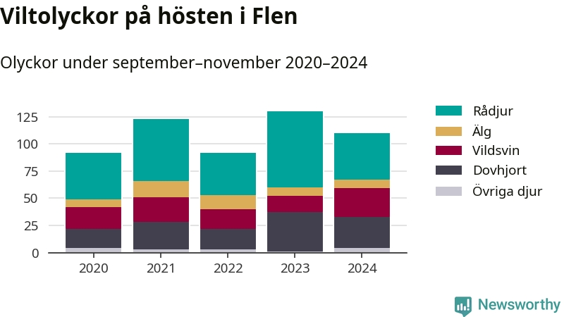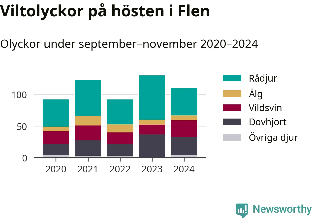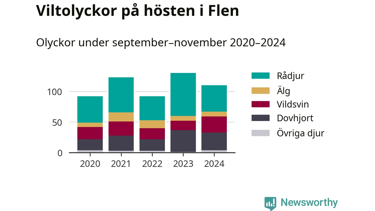 Under de senaste höstarna har antalet viltolyckor ökat i Sverige. Den höst med flest viltolyckor i Flen hittills under 2020-talet var 2023, 130 olyckor. I fjol höst rapporterades totalt 110 olyckor.