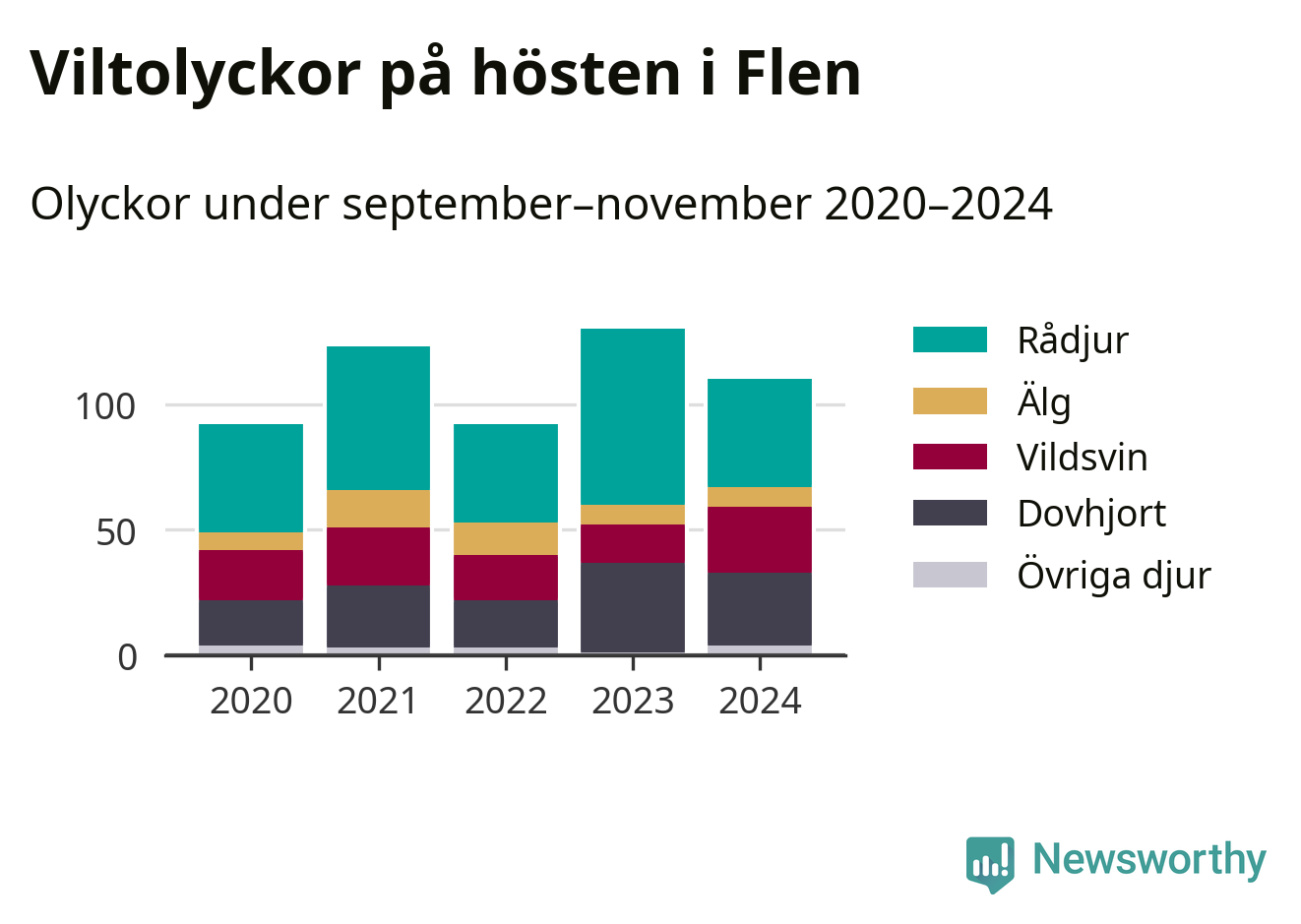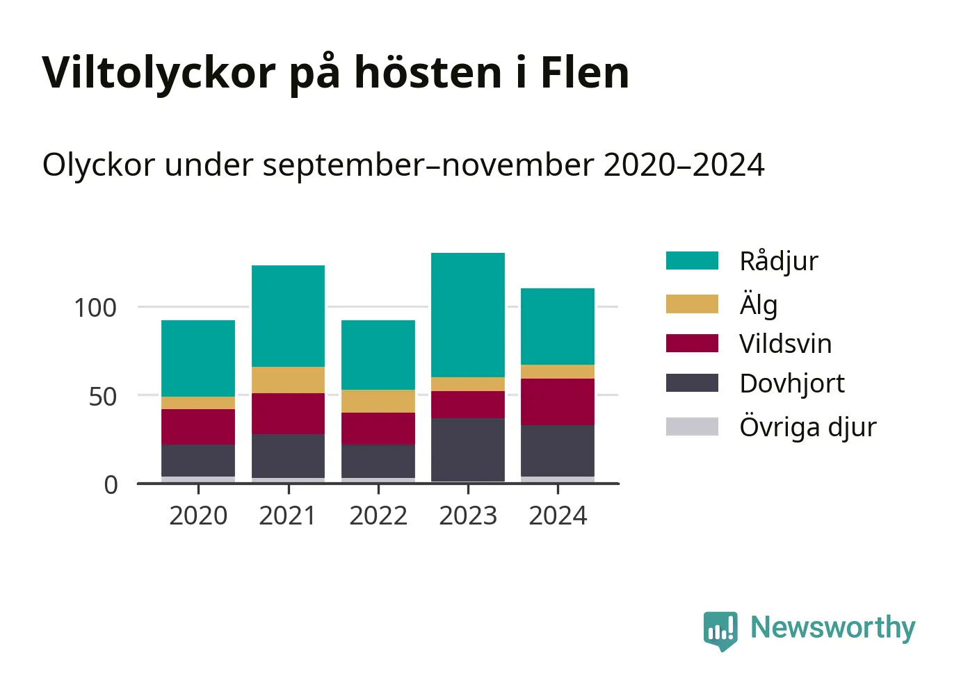 Viltolyckor i Flen 2020–2024 uppdelat på viltslag