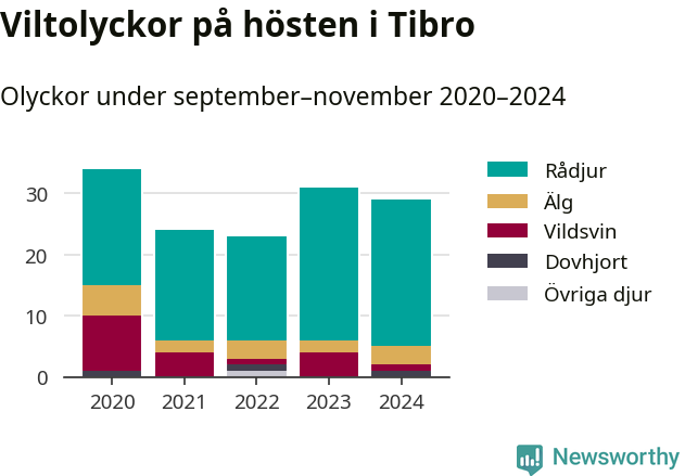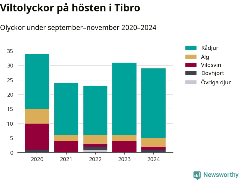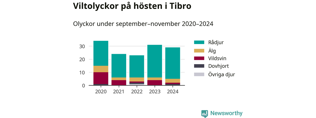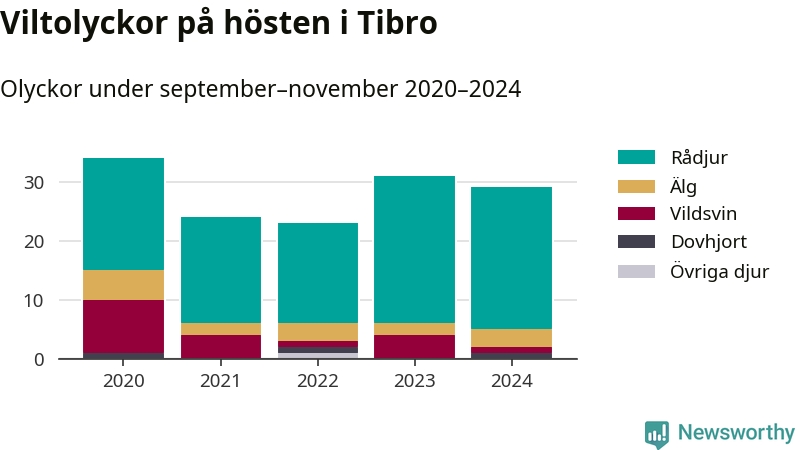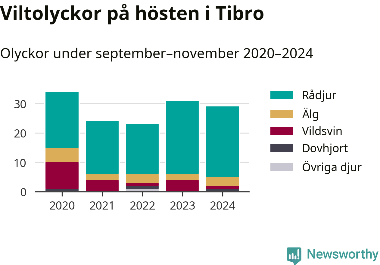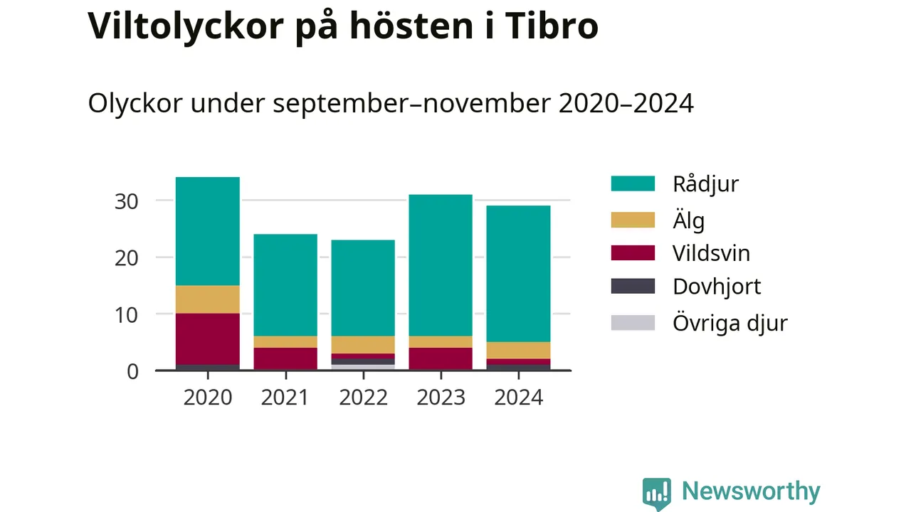 Under de senaste höstarna har antalet viltolyckor ökat i Sverige. Den höst med flest viltolyckor i Tibro hittills under 2020-talet var 2020, 34 olyckor. I fjol höst rapporterades totalt 29 olyckor.