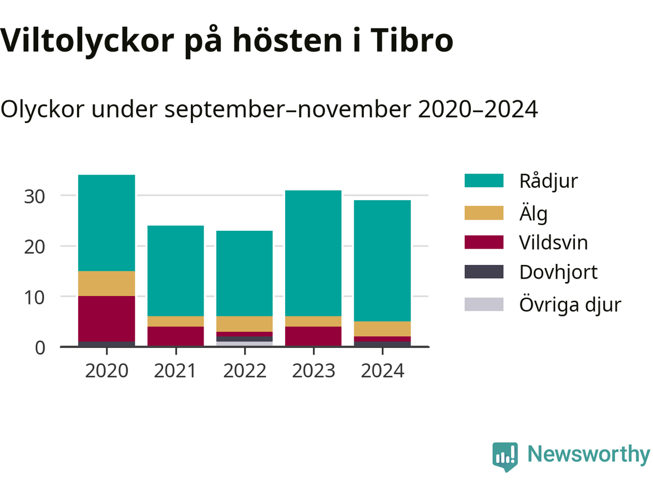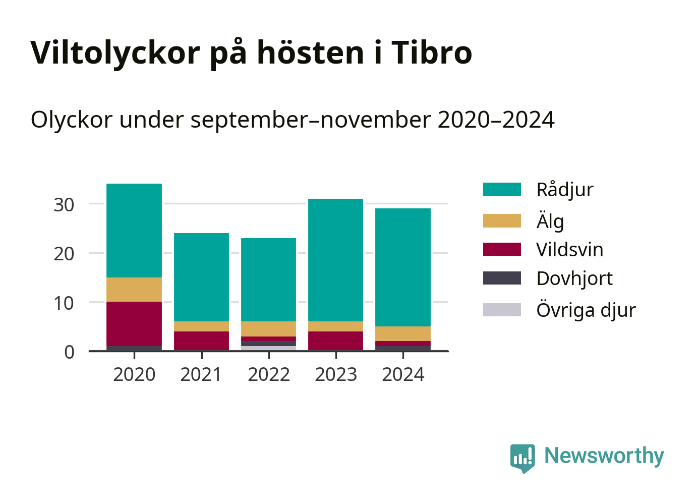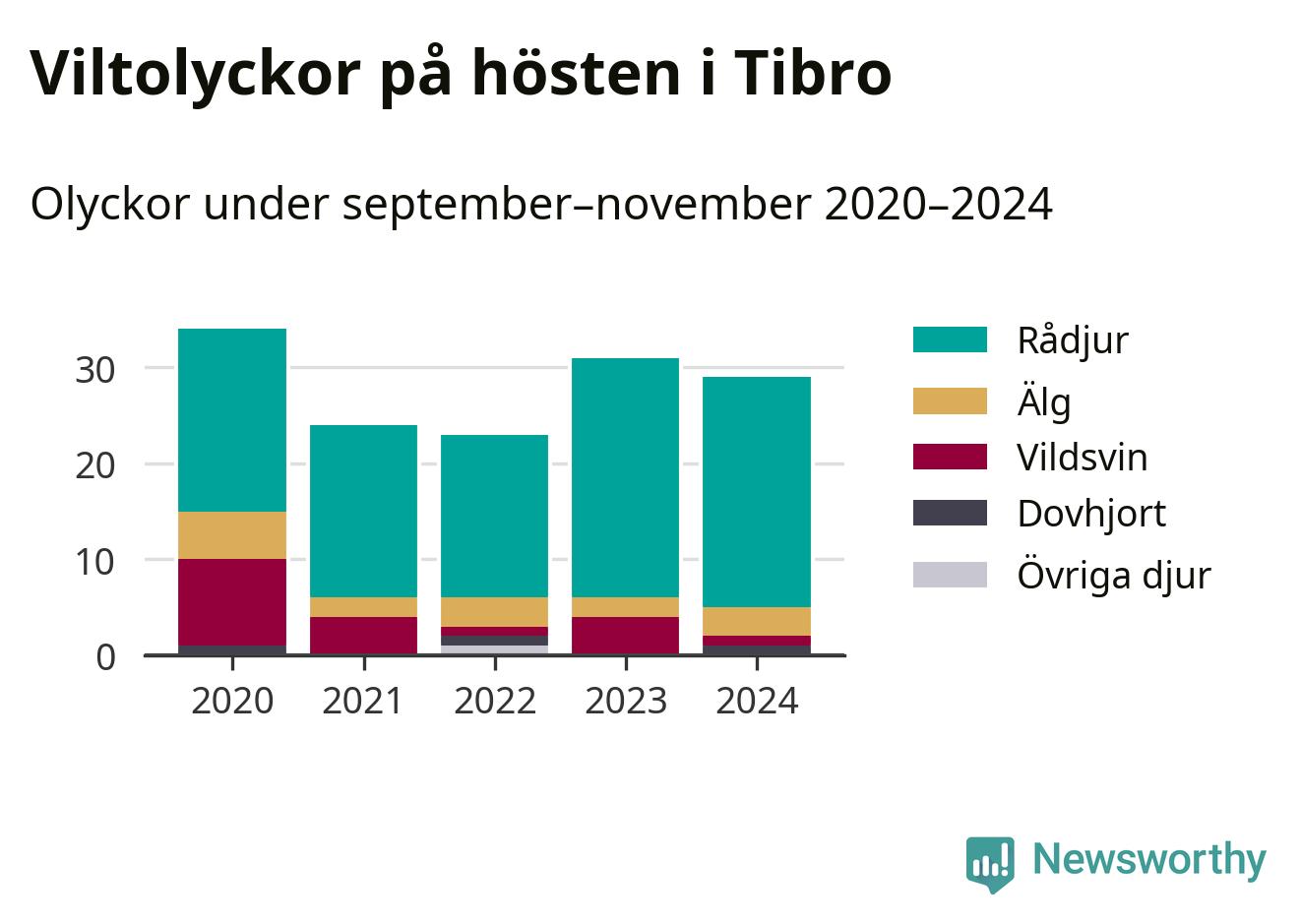 Under de senaste höstarna har antalet viltolyckor ökat i Sverige. Den höst med flest viltolyckor i Tibro hittills under 2020-talet var 2020, 34 olyckor. I fjol höst rapporterades totalt 29 olyckor.