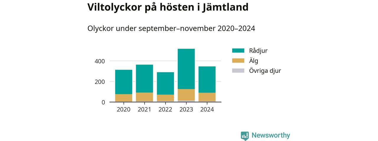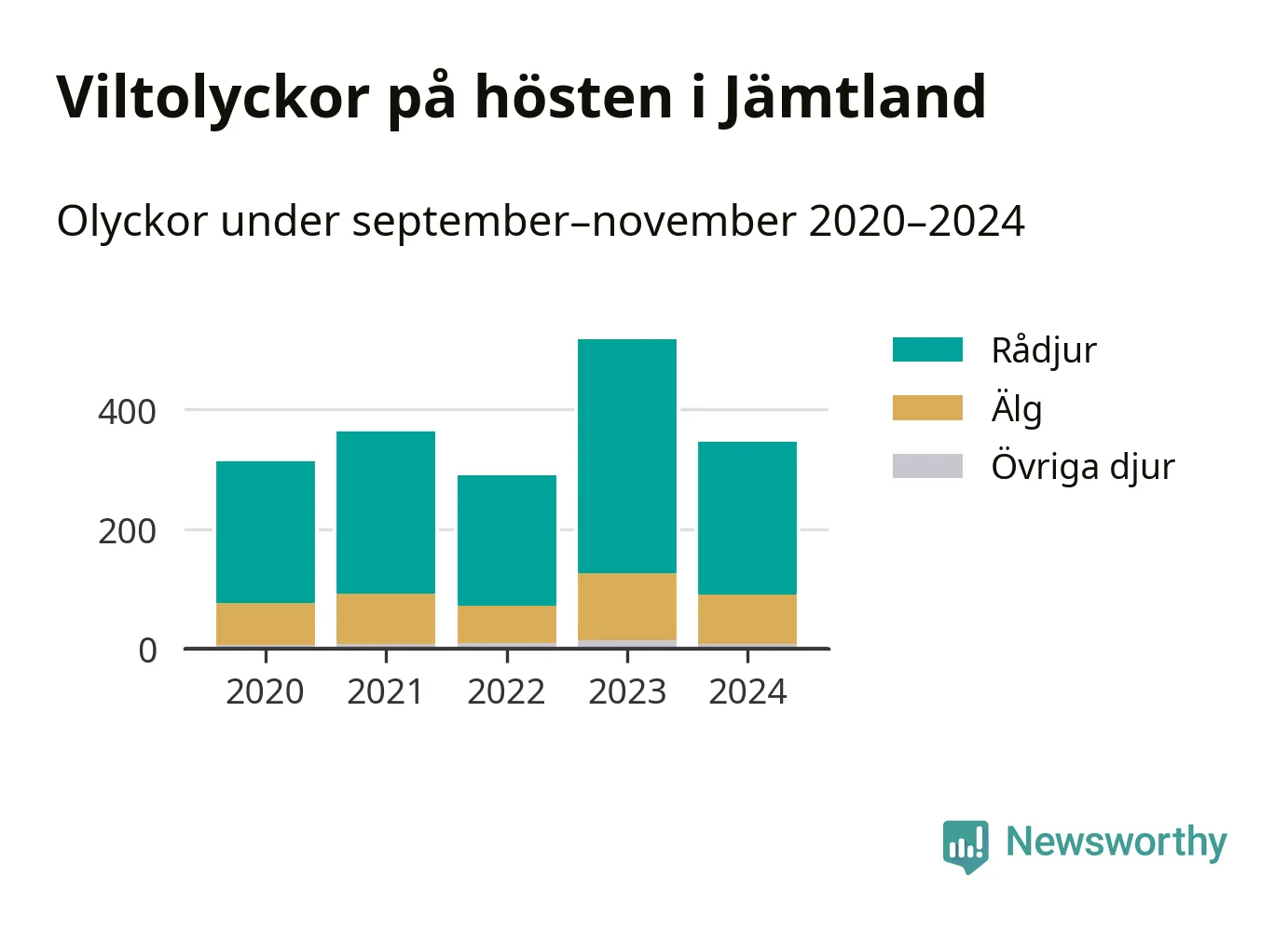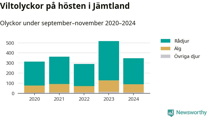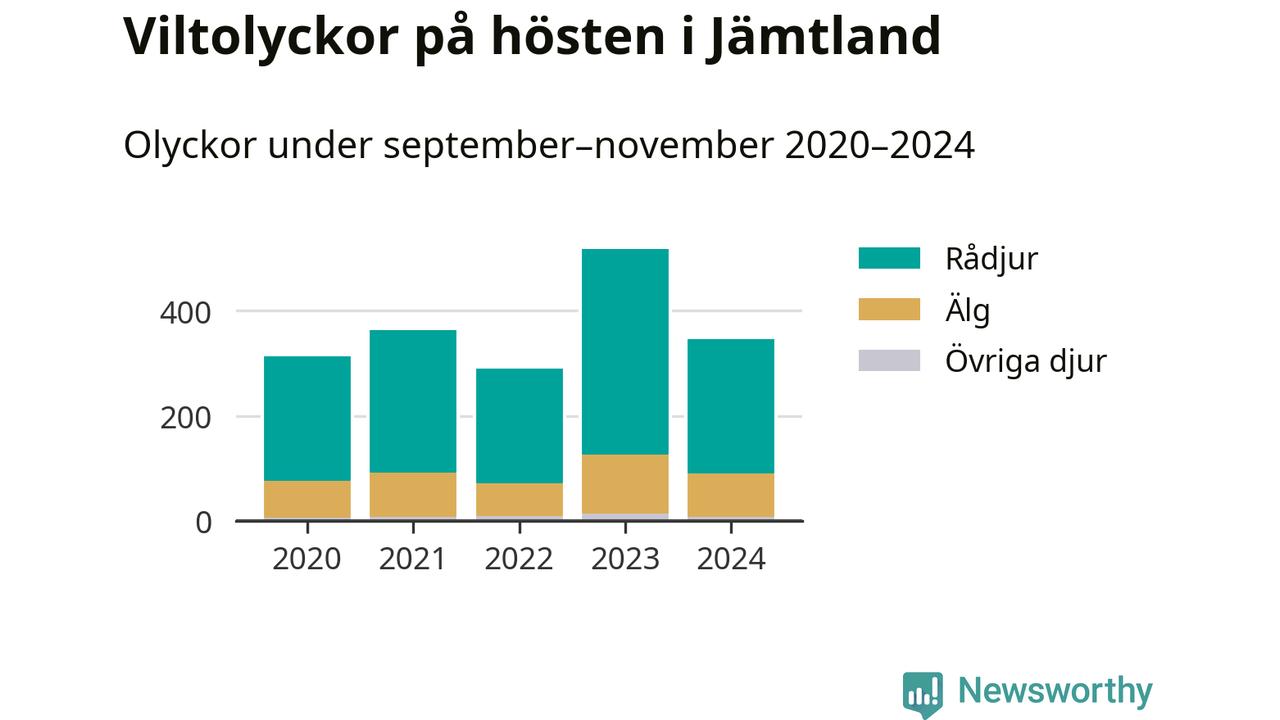 Under de senaste höstarna har antalet viltolyckor ökat i Sverige. Den höst med flest viltolyckor i Jämtland hittills under 2020-talet var 2023, 517 olyckor. I fjol höst rapporterades totalt 346 olyckor.