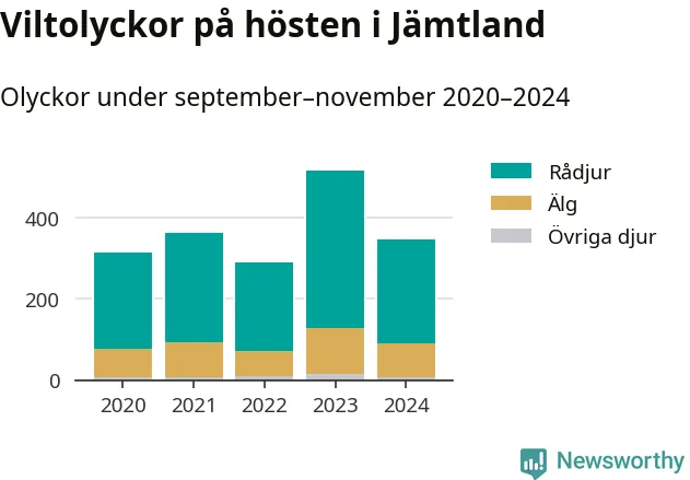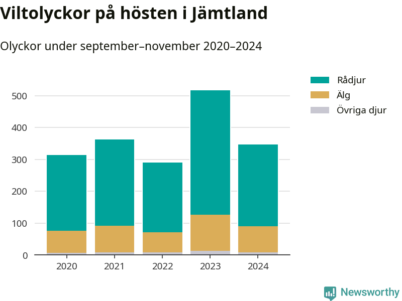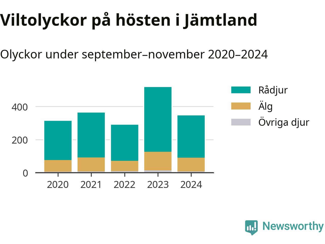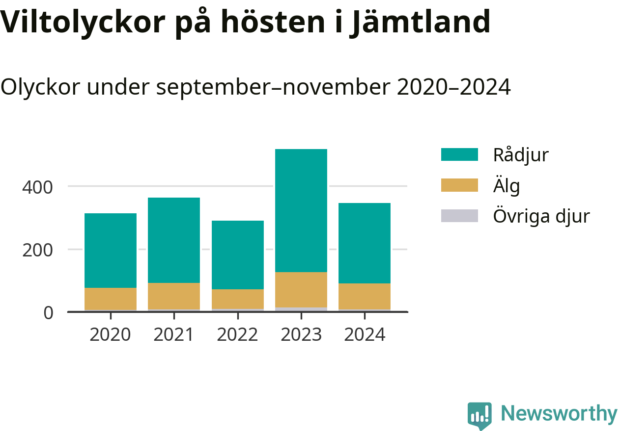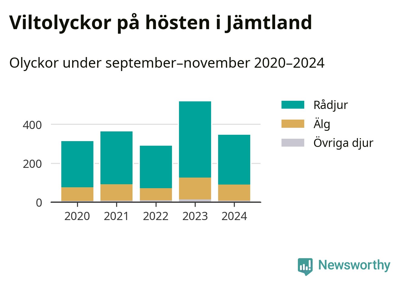 Under de senaste höstarna har antalet viltolyckor ökat i Sverige. Den höst med flest viltolyckor i Jämtland hittills under 2020-talet var 2023, 517 olyckor. I fjol höst rapporterades totalt 346 olyckor.