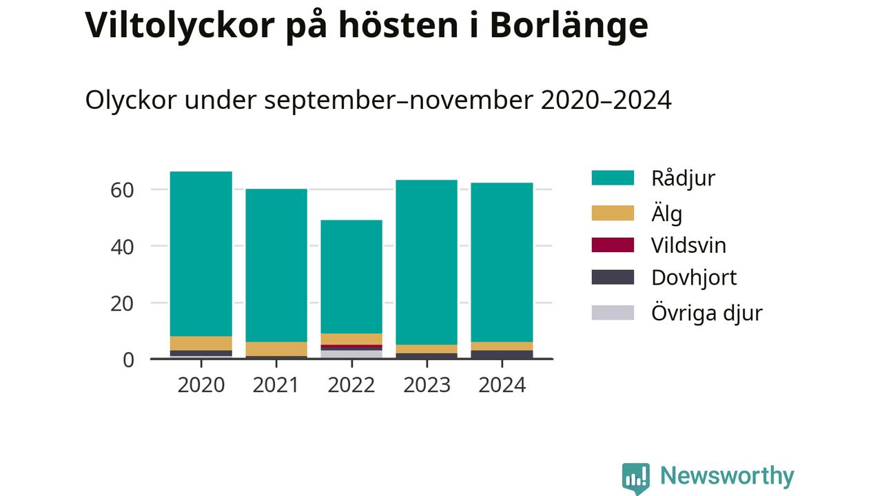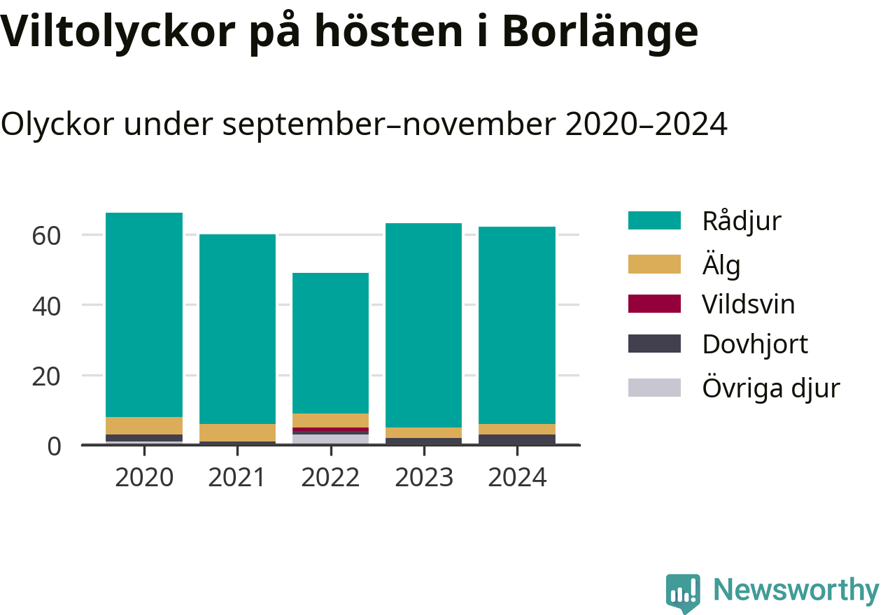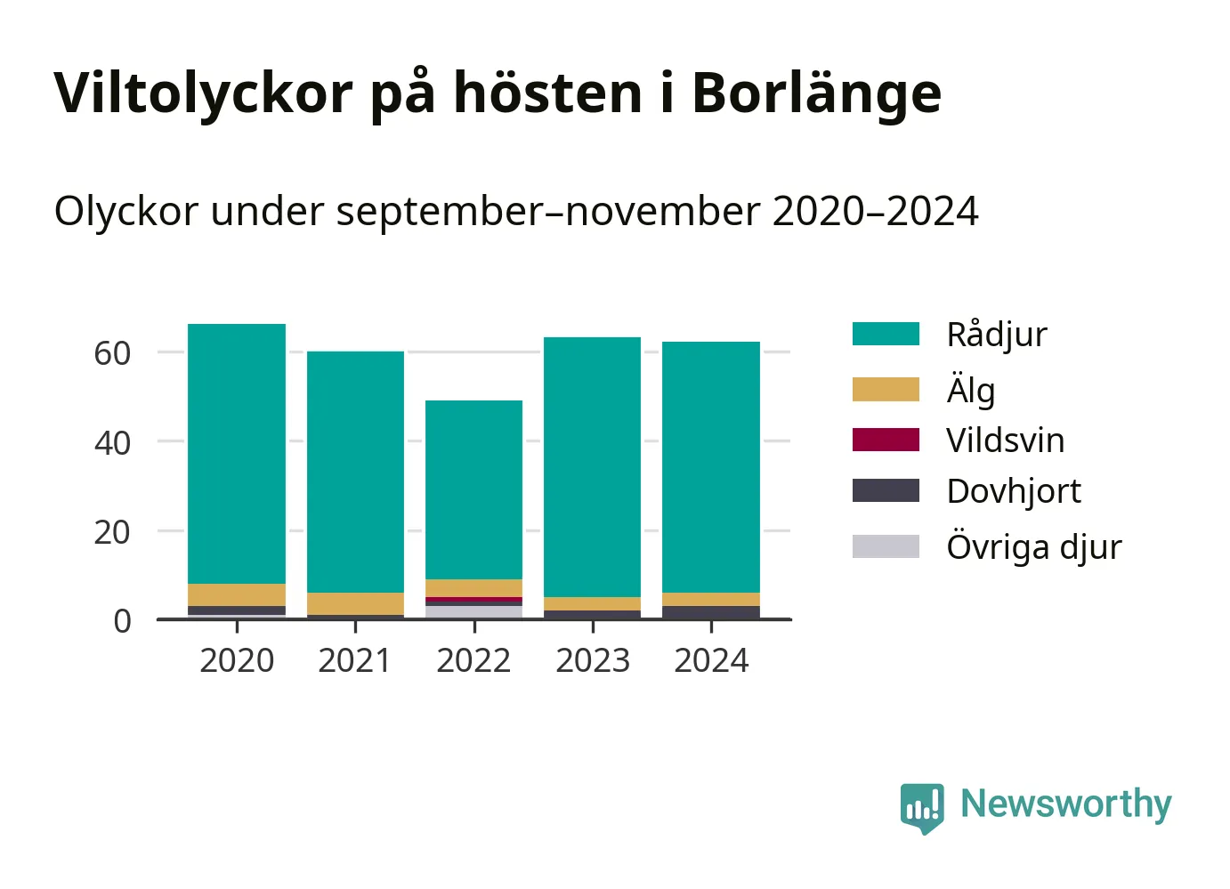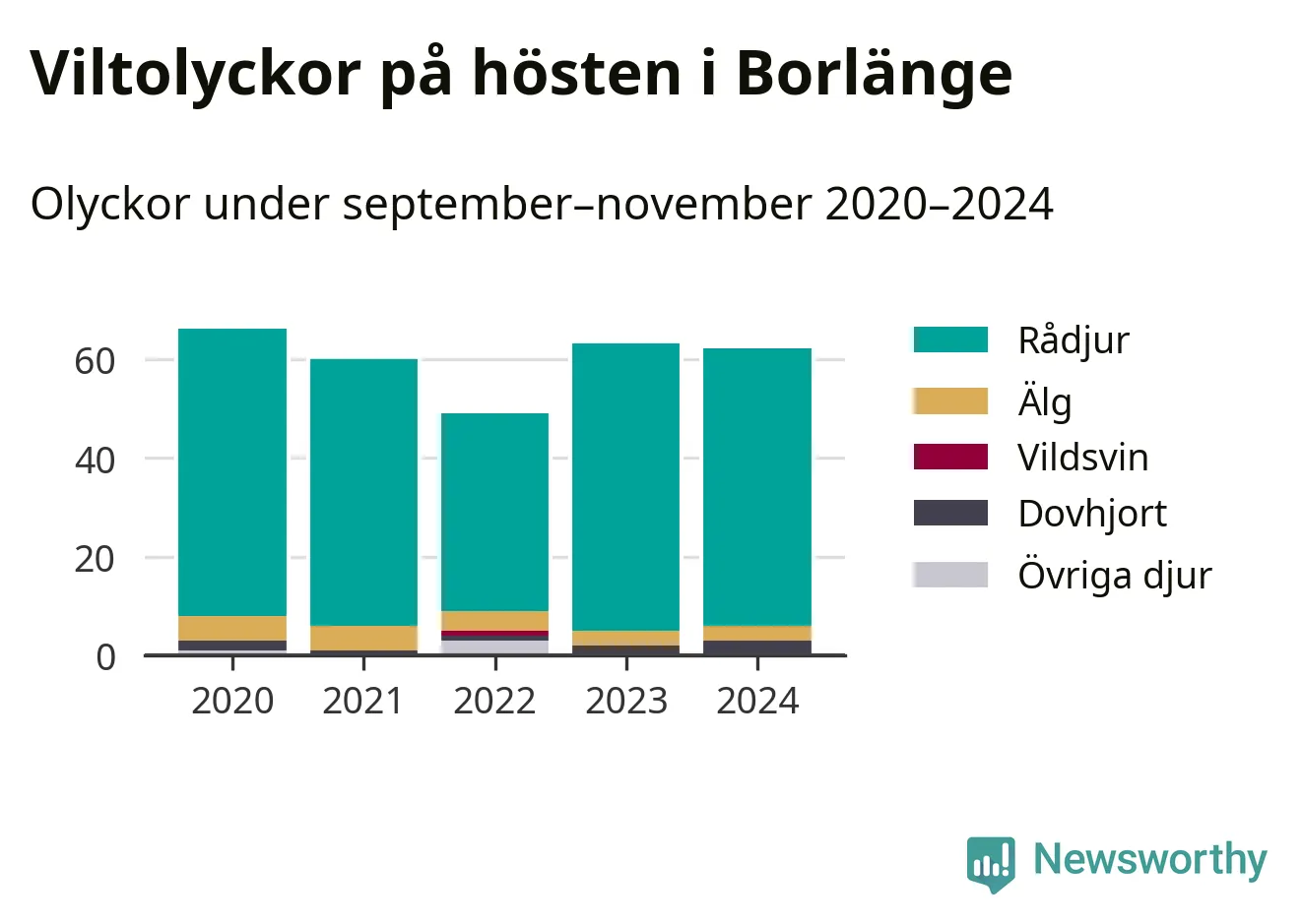 Under de senaste höstarna har antalet viltolyckor ökat i Sverige. Den höst med flest viltolyckor i Borlänge hittills under 2020-talet var 2020, 66 olyckor. I fjol höst rapporterades totalt 62 olyckor.