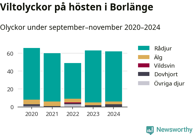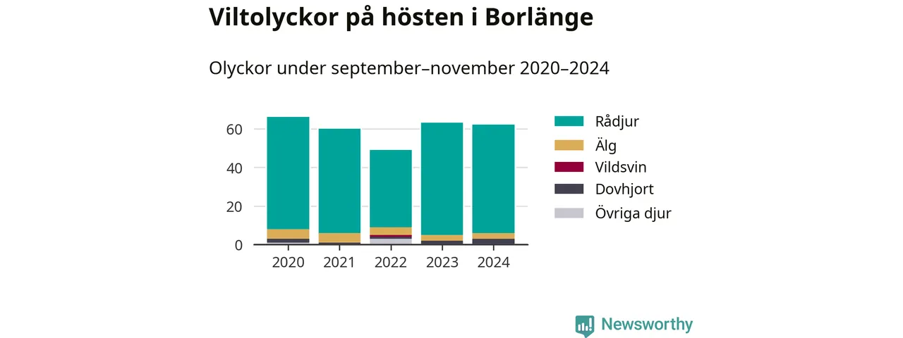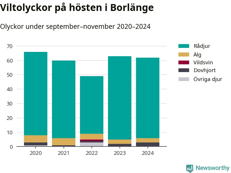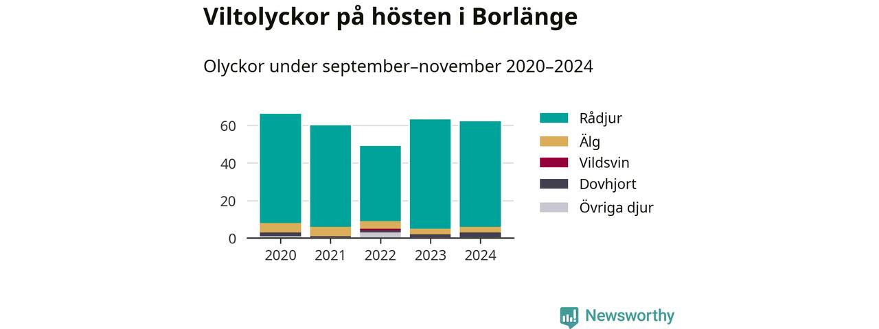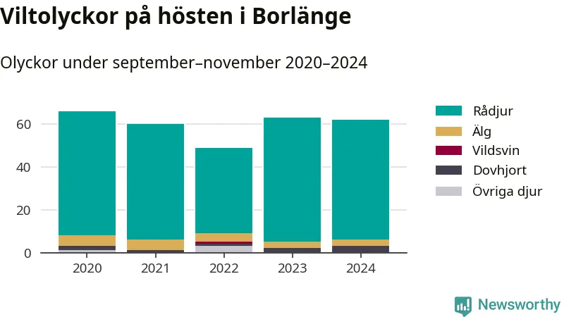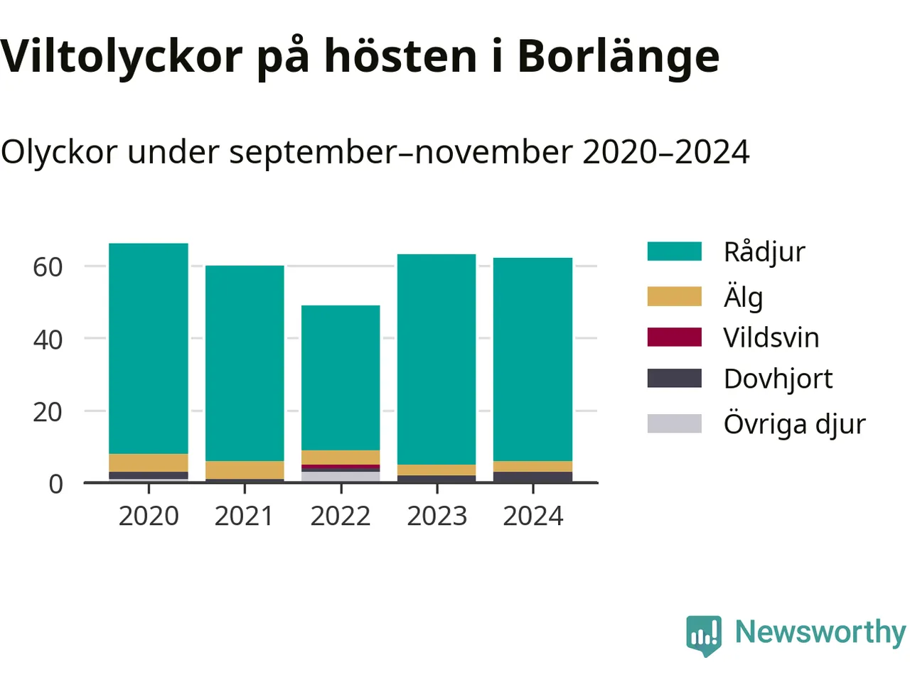 Under de senaste höstarna har antalet viltolyckor ökat i Sverige. Den höst med flest viltolyckor i Borlänge hittills under 2020-talet var 2020, 66 olyckor. I fjol höst rapporterades totalt 62 olyckor.
