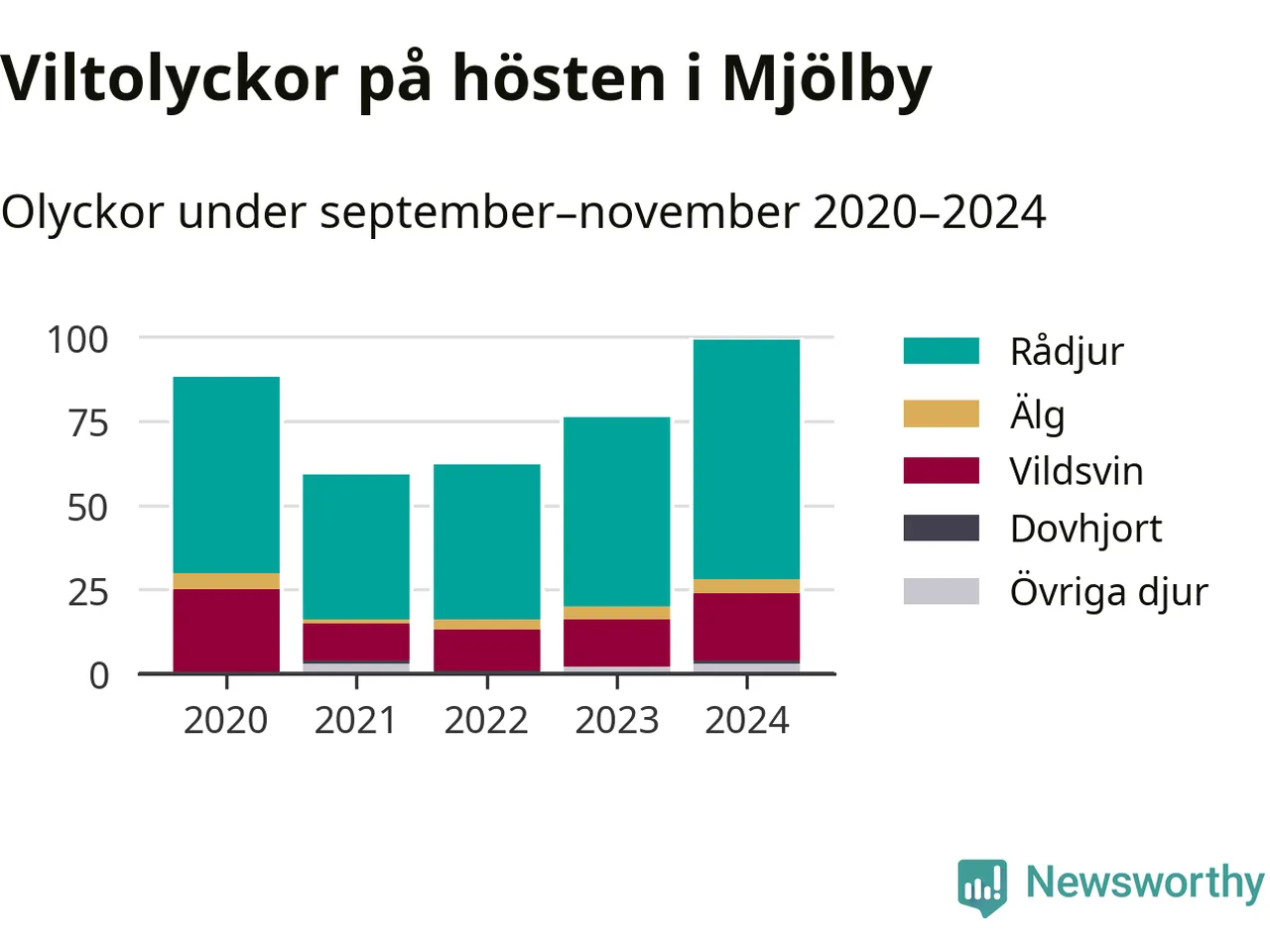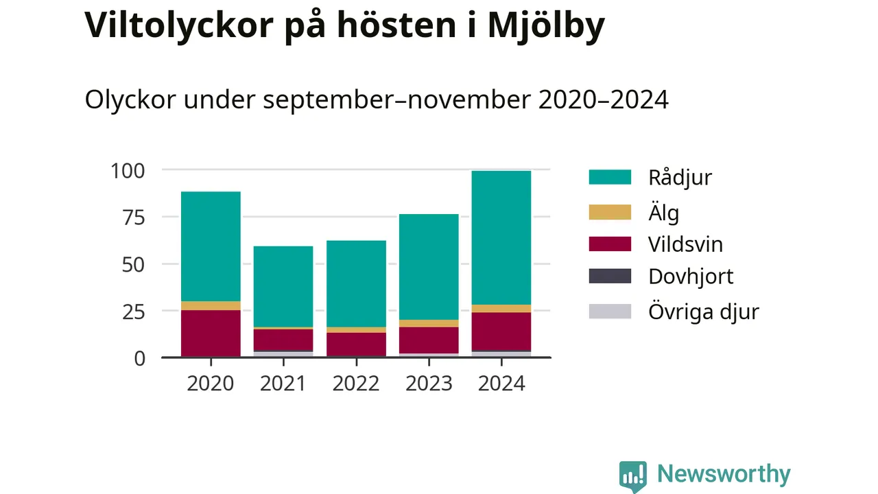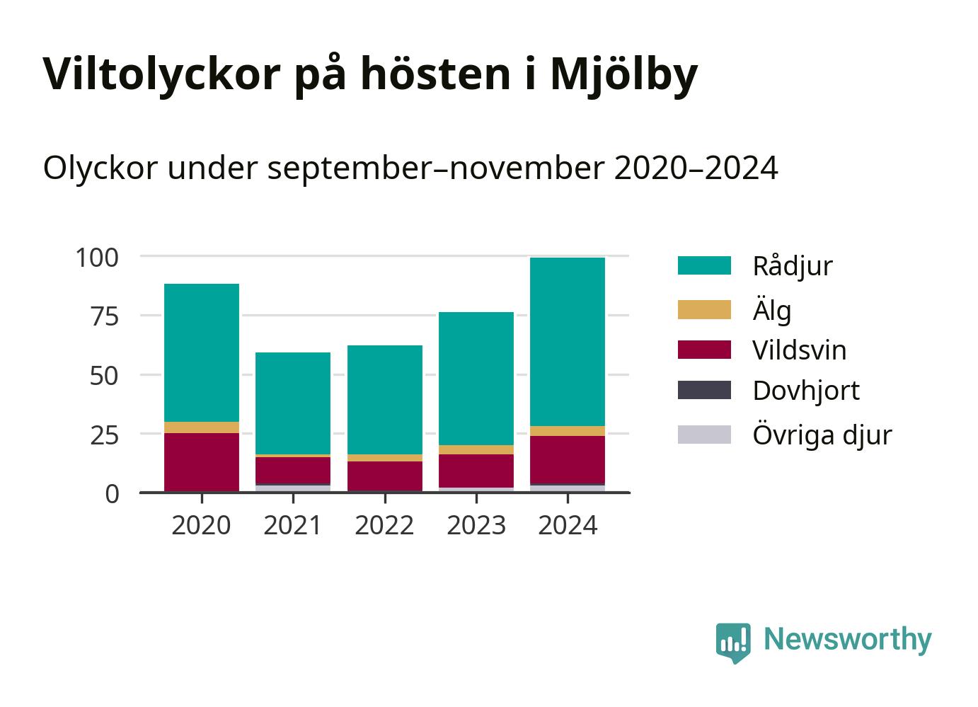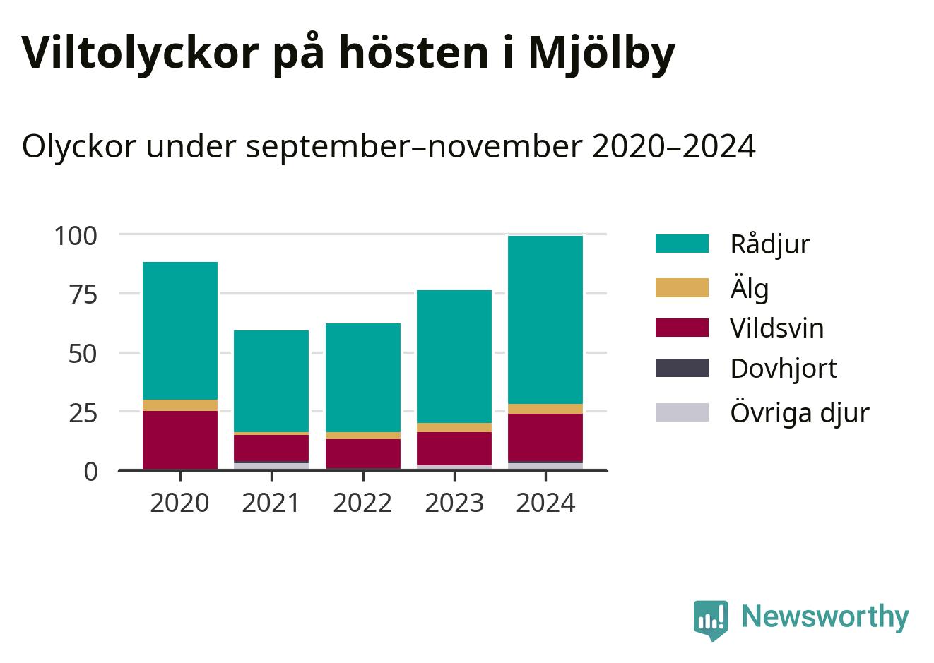Under de senaste höstarna har antalet viltolyckor ökat i Sverige. I fjol höst noterades också flest viltolyckor i Mjölby hittills under 2020-talet, totalt 99 stycken.